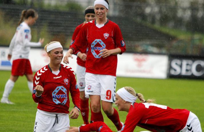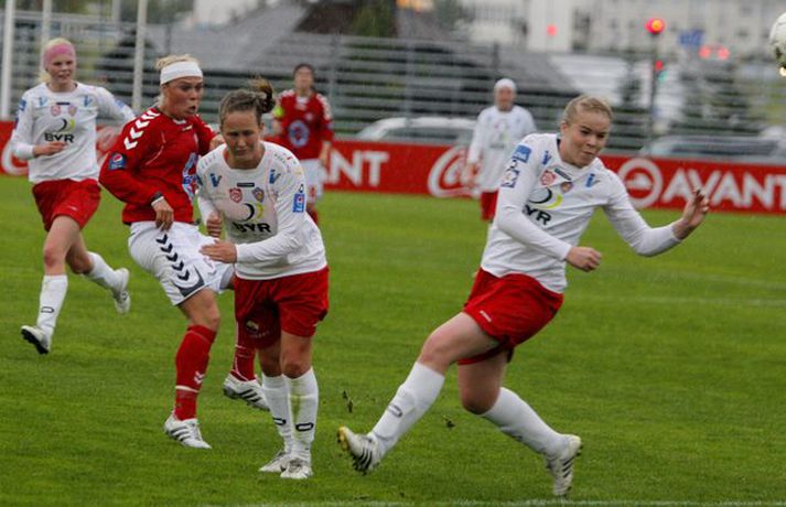 Kvennalið Vals steig stórt skref í átta að fimmta Íslandsmeistaratitlinum í röð með 3-0 sigri á Þór/KA á Vodafone-vellinum í kvöld. Þór/KA gat með sigri minnkað forskot Vals niður í eitt stig en í staðinn eru Valskonur komnar með sex stiga forskot á Breiðablik sem er í 2. sætinu. Rakel Logadóttir var fjarri góðu gamni þegar Valsliðið steinlá á móti Fylki í síðustu umferð en var mætt aftur í slaginn í kvöld. Rakel skoraði fyrsta mark Valsliðsins og kom þeim á bragðið í leiknum. Valgarður Gíslason, ljósmyndari Fréttablaðsins og Vísis, var á Hlíðarenda og myndaði Valsstelpur í stuði en þær hafa unnið alla Íslandsmeistaratitla frá og með árinu 2006. Myndirnar má sjá í albúminu hér að neðan. Hægt er að sjá myndirnar stærri með því að smella á þær.Mynd/ValliMynd/ValliMynd/ValliMynd/ValliMynd/ValliMynd/ValliMynd/ValliMynd/ValliMynd/ValliMynd/Valli