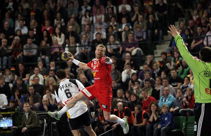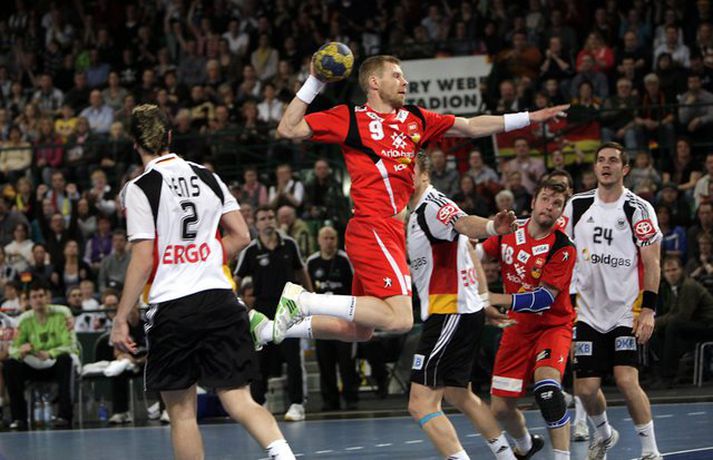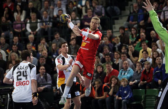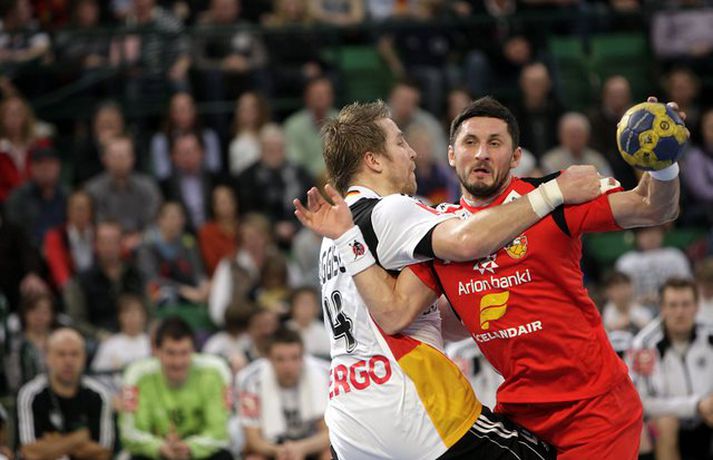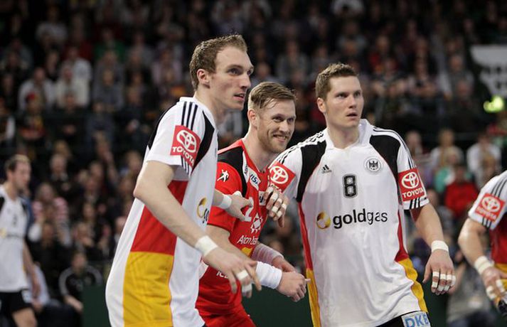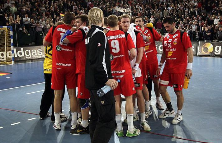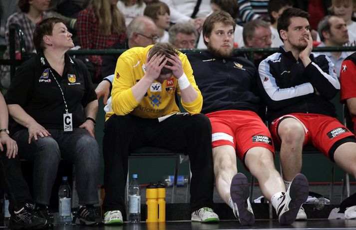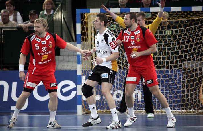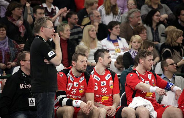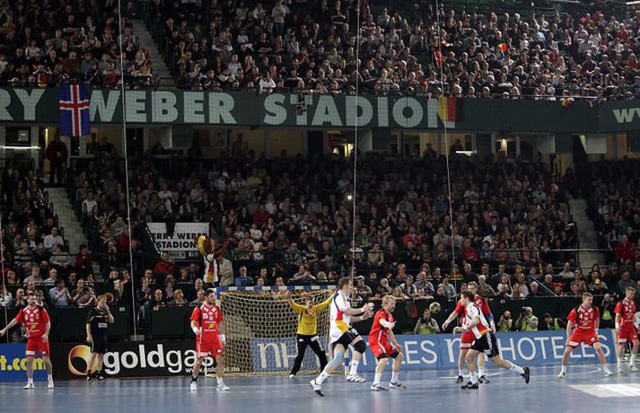 Ísland átti einhvern sinn allra versta leik á síðustu árum þegar að liðið mætti Þýskalandi ytra í dag og fékk ellefu marka skell, 39-28. Úrslitin þýða að strákarnir okkar eru nú búnir að mála sig út í horn og þurfa nauðsynlega að vinna tvo síðustu leiki sína í riðlinum og treysta á að Þýskaland og Austurríki geri ekki jafntefli í sínum leik í byrjun júní. Þá er EM-sætið öruggt. Vilhelm Gunnarsson, ljósmyndari Vísis og Fréttablaðsins, var í Gerry Weber-höllinni í gær og tók þessar myndir.Mynd/Vilhelm