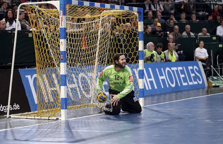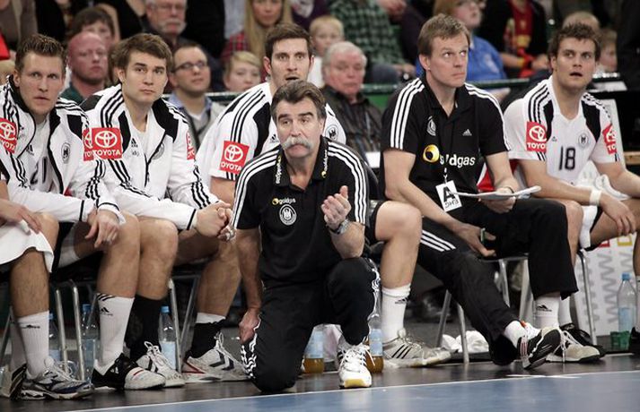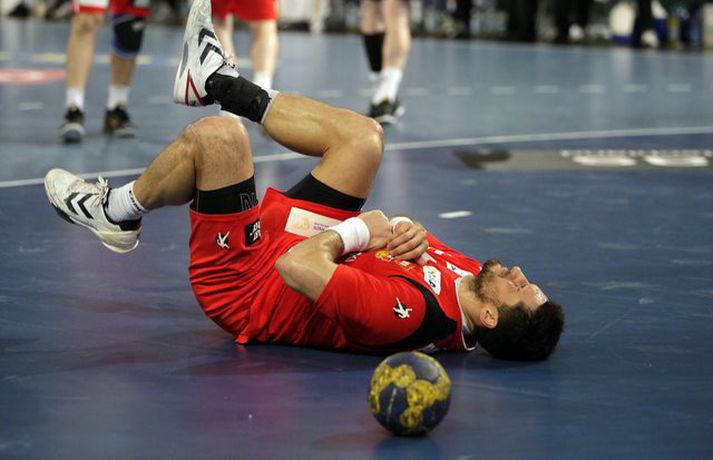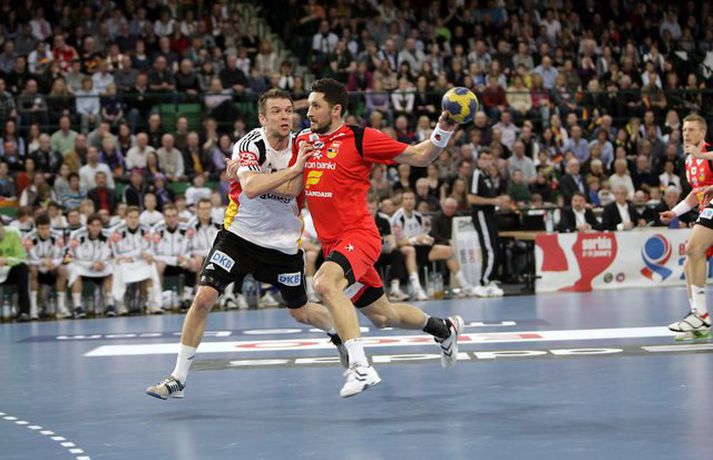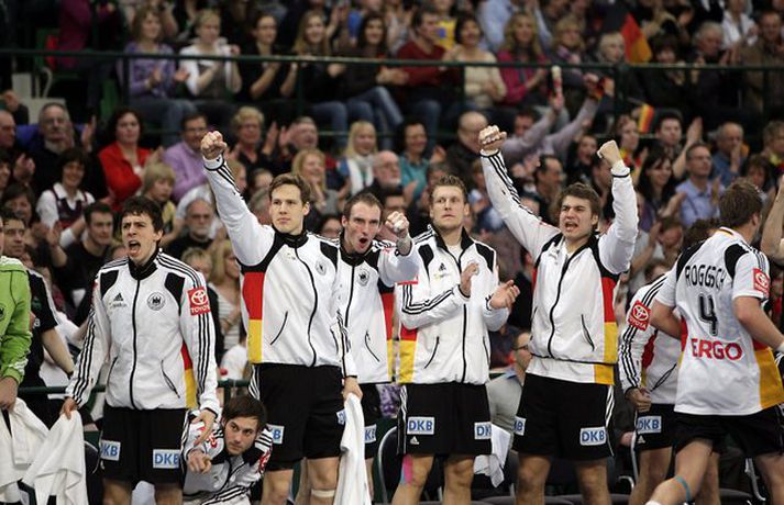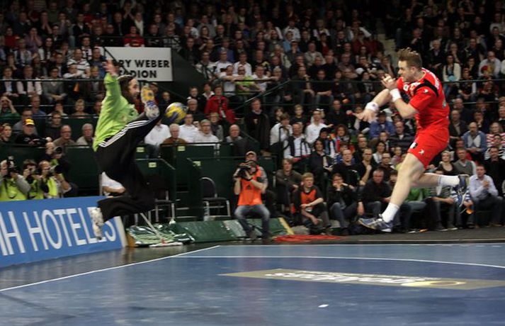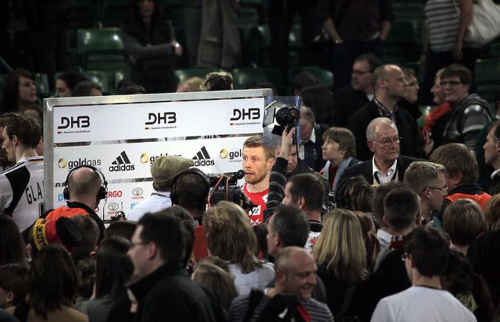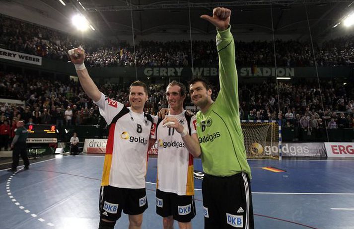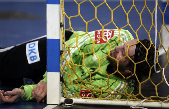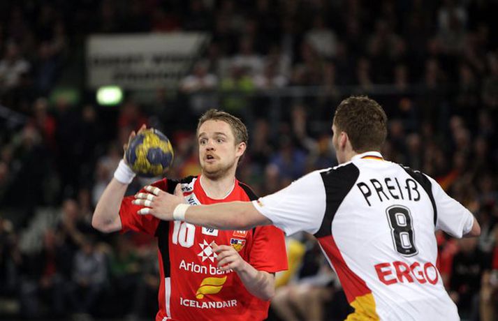 Ísland átti einhvern sinn allra versta leik á síðustu árum þegar að liðið mætti Þýskalandi ytra í dag og fékk ellefu marka skell, 39-28. Úrslitin þýða að strákarnir okkar eru nú búnir að mála sig út í horn og þurfa nauðsynlega að vinna tvo síðustu leiki sína í riðlinum og treysta á að Þýskaland og Austurríki geri ekki jafntefli í sínum leik í byrjun júní. Þá er EM-sætið öruggt. Vilhelm Gunnarsson, ljósmyndari Vísis og Fréttablaðsins, var í Gerry Weber-höllinni í gær og tók þessar myndir.Mynd/Vilhelm