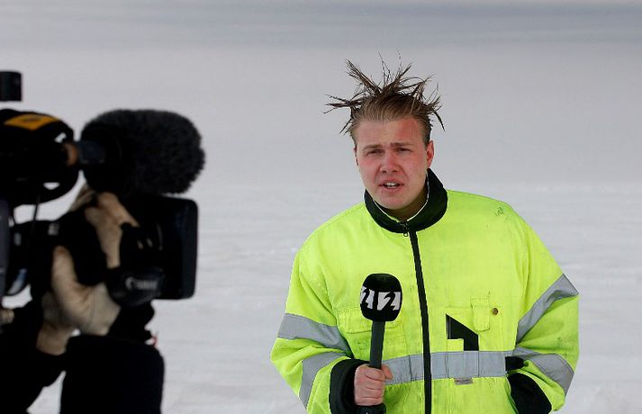 Hópur fjölmiðlamanna fór með þyrlu á Vatnajökul í grennd við gosstöðvarnar í Grímsvötnum í dag. Þar á meðal var Anton Brink, ljósmyndari Fréttablaðsins og Vísis, sem myndaði það sem fyrir augun bar. Í myndasafninu sem fylgir þessari frétt má sjá gosstrókinn frá Grímsvötnum í bland við jökulinn.Jónas Margeir Ingólfsson, fréttamaður Stöðvar 2, átti í nokkrum vandræðum með hárið á sér á Vatnajökli fyrr í dag. Mynd/Anton BrinkMyndskeið frá Vatnajökli verða sýnd í fréttum Stöðvar 2 í kvöld.