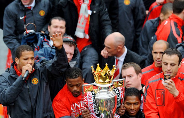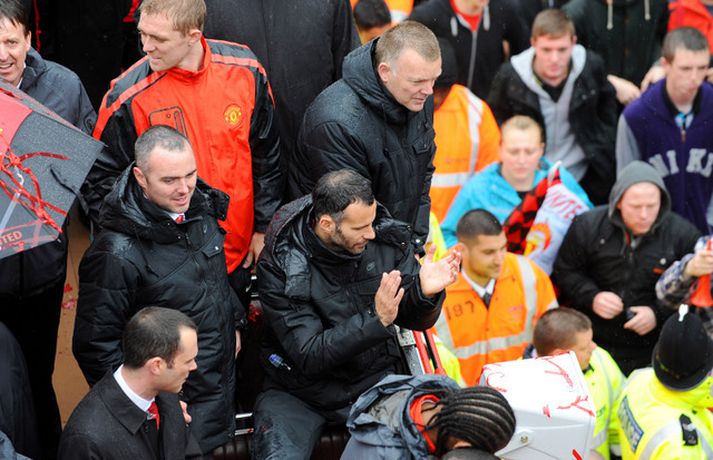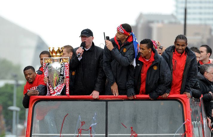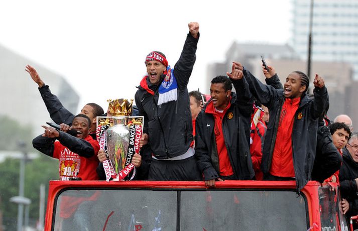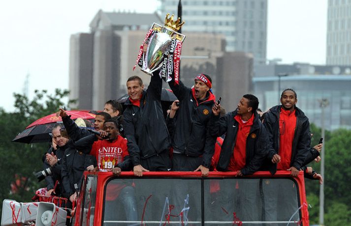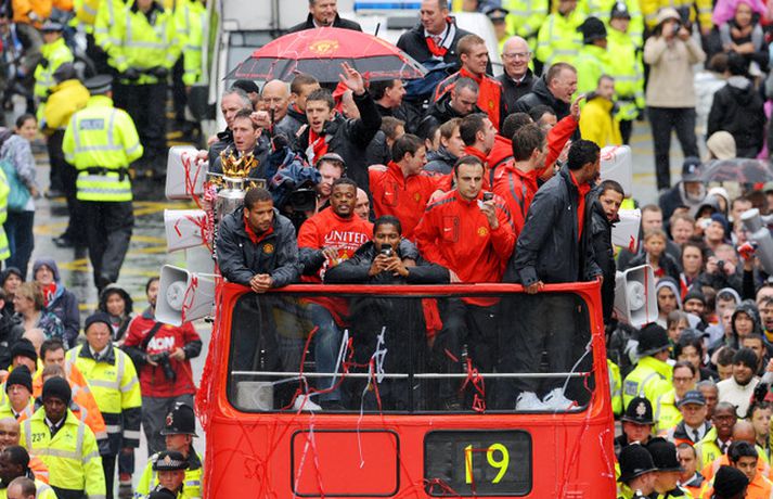 Fögnuðu titlinum í rigningarsudda Eiríkur Stefán Ásgeirsson skrifar 30. maí 2011 23:30 Nordic Photos / Getty Images Stuðninigsmenn Manchester United létu rigninguna þar í borg ekki stöðva sig þegar að félagið fagnaði enska meistaratitlinum í dag - þeim nítjánda frá upphafi. Haldið var í rútuferð í morgun þar sem að stuðningsmenn félagsins fengu að taka þátt í fögnuðinum með leikmönnum og starfsmönnum United. Gleðin var mikil enda tók United fram úr Liverpool og er nú orðið sigursælasta félag Englands frá upphafi. Talið er að um 100 þúsund stuðningsmenn hafi tekið þátt í fögnuðinum og snerust flestir söngvarnir um að skjóta pillum á erkifjendurna í Liverpool. Það var opinber frídagur í Bretlandi í dag og því gátu flestir mætt sem vildu. Í síðustu viku mættu 100 þúsund stuðningsmenn Manchester City í álíka fögnuð hjá félaginu en þá var verið að halda upp á enska bikarmeistaratitilinn sem var fyrsti stóri titill félagsins í 35 ár. Skroll-Íþróttir Mest lesið Kærastan tók eftir því að eitthvað var að Handbolti Uppgjörið: Þýskaland - Ísland 29-31 | Svöruðu skellinum með frábærum sigri Handbolti Vara við því að „töfradrykkur“ Haaland geti valdið matareitrun Enski boltinn „Það verður hundleiðinlegt að spila við Val“ Íslenski boltinn Annað tap spútnikliðsins kom í Manchester Enski boltinn Leggur til breytingar og vill að fótboltinn læri af handboltanum Fótbolti Verður besta sjöþrautakona Íslands villiköttur eða bolabítur? Sport Úlfarnir ráku Pereira Enski boltinn Tóku símana af stelpunum alla keppnisferðina Golf Hermann tekinn við Val Íslenski boltinn Fleiri fréttir „Haaland er þetta góður“ Annað tap spútnikliðsins kom í Manchester Loksins West Ham-sigur í London Úlfarnir ráku Pereira Engin klipping á næstunni: Miður sín en með augun á 8. desember Vara við því að „töfradrykkur“ Haaland geti valdið matareitrun Liverpool loks á sigurbraut á ný Pedro afgreiddi Tottenham Arsenal með sjö stiga forystu á toppnum Andri Lucas í beinni í Doc Zone: „Við setjum hann í skeytin“ Amad bjargaði stigi fyrir United Andri Lucas var kóngurinn á King Power í dag Liverpool féll síðast þegar liðið tapaði fimm í röð „Ég er ekki Schmeichel í dulargervi“ Arne Slot: „Þetta er síðasta spurningin sem ég átti von á“ Segir sönginn um Jota á tuttugustu mínútu hafa áhrif á leik Liverpool Haaland fór sem Jókerinn að versla bleyjur Fullkomin þrenna kom Lampard úr sjöunda himni Jóladagskráin klár: Hefðin brotin og aðeins einn leikur annan í jólum Sjáðu besta liðið í föstum leikatriðum leika listir sínar Barcelona skuldar mest en Tottenham er númer tvö Mikilvægt fyrir United að hamra járnið meðan það er heitt Félagið í greiðslustöðvun en borgaði öll laun degi fyrr Skortir Liverpool breidd þrátt fyrir gríðarleg fjárútlát síðasta sumar? Hetja Englands á EM sleit krossband Lofar frekari fjárfestingum Fantasýn: „Þessi vörn er eitthvað skrímsli“ Scholes hættir og setur einhverfan son sinn í fyrsta sætið Carrick í einkaviðtali: Sigurinn á Anfield stór stund fyrir Man. Utd Hefur spilað 16 mínútur og fengið tvö rauð spjöld Sjá meira