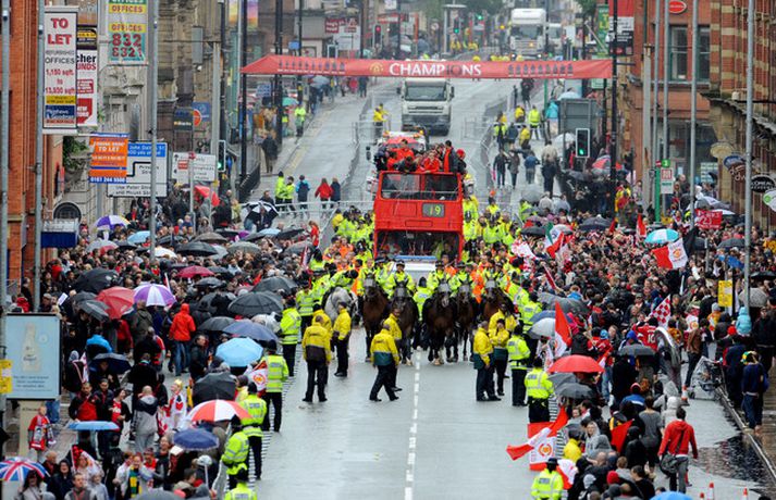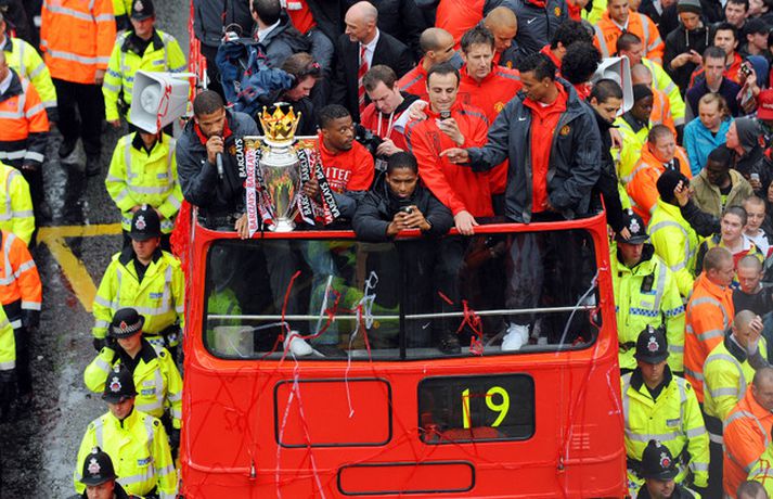Stuðninigsmenn Manchester United létu rigninguna þar í borg ekki stöðva sig þegar að félagið fagnaði enska meistaratitlinum í dag - þeim nítjánda frá upphafi. Haldið var í rútuferð í morgun þar sem að stuðningsmenn félagsins fengu að taka þátt í fögnuðinum með leikmönnum og starfsmönnum United. Gleðin var mikil enda tók United fram úr Liverpool og er nú orðið sigursælasta félag Englands frá upphafi. Talið er að um 100 þúsund stuðningsmenn hafi tekið þátt í fögnuðinum og snerust flestir söngvarnir um að skjóta pillum á erkifjendurna í Liverpool. Það var opinber frídagur í Bretlandi í dag og því gátu flestir mætt sem vildu. Í síðustu viku mættu 100 þúsund stuðningsmenn Manchester City í álíka fögnuð hjá félaginu en þá var verið að halda upp á enska bikarmeistaratitilinn sem var fyrsti stóri titill félagsins í 35 ár.