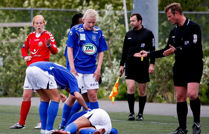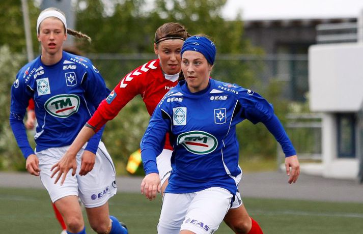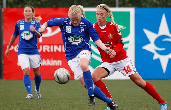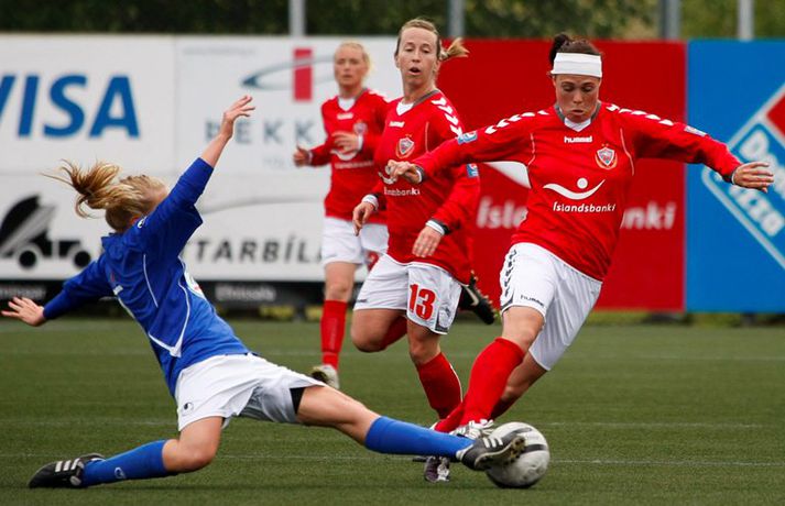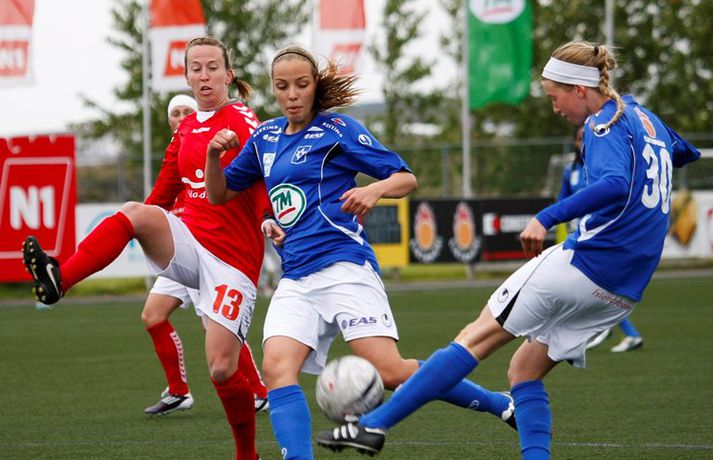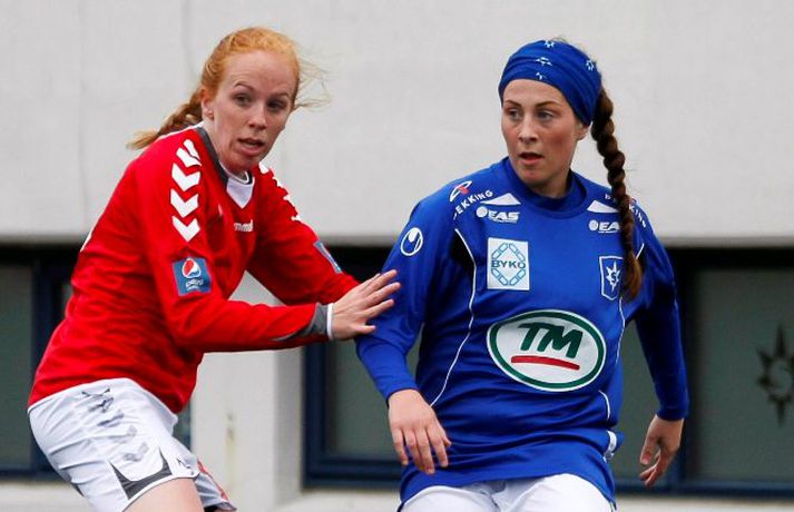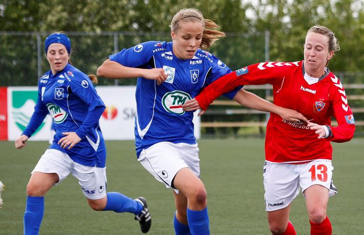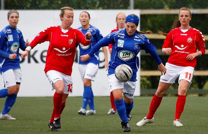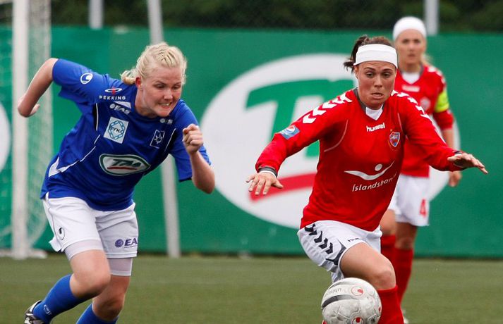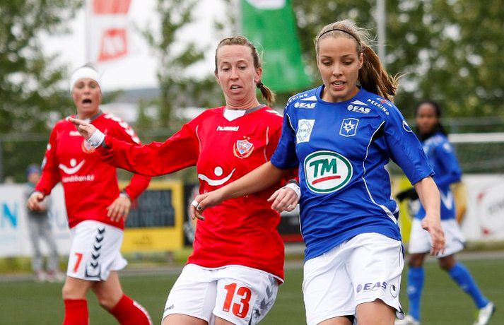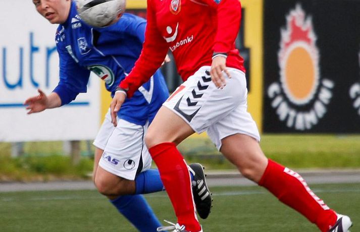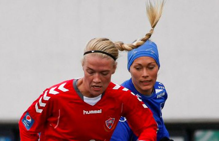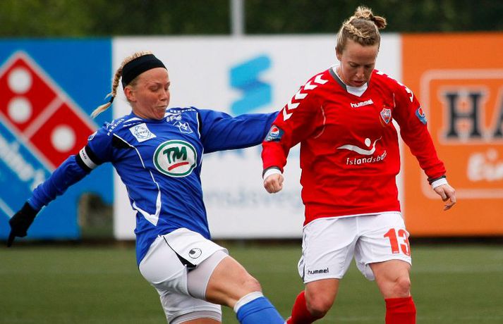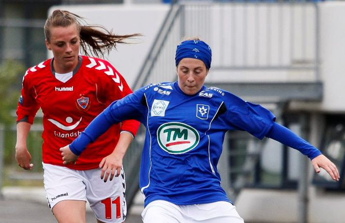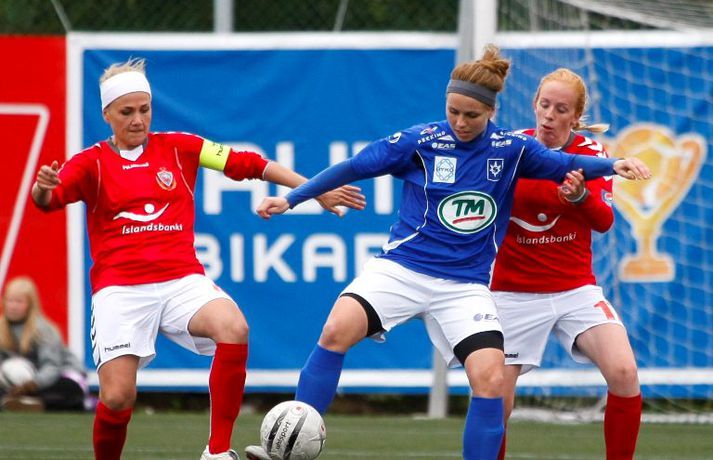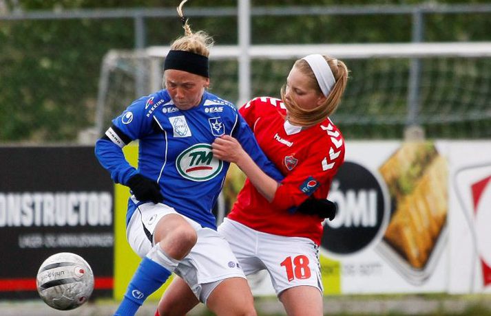 Bikarmeistarar Vals lögðu Stjörnuna Kolbeinn Tumi Daðason skrifar 1. júlí 2011 21:49 Caitlin Miskel og Rakel Logadóttir í eldlínunni með Valskonum í kvöld Mynd/HAG Valskonur komust í undanúrslit Valitor-bikars kvenna í knattspyrnu í kvöld með 1-0 útisigri á Stjörnunni í Garðabæ. Það var Bandaríkjamaðurinn Caitlin Miskel sem skoraði eina mark leiksins í síðari hálfleiknum. Miskel hefur verið iðin við kolann í sumar en þetta var hennar fimmta mark í öllum keppnum. Liðin mættust í úrslitaleik keppninnar í fyrra þar sem Valskonur höfðu betur og eiga því titil að verja. Í Vesturbænum vann KR 1-0 sigur á Grindavík. Margrét Þórólfsdóttir skoraði eina markið snemma leiks. Fyrr í kvöld bar Fylkir sigurorð af FH 3-2 í markaleik í Árbænum. Dregið verður í undanúrslit keppninnar í höfuðstöðvum KSÍ á mánudag. Haraldur Guðjónsson ljósmyndari Fréttablaðsins og Vísis var í Garðabæ í kvöld og tók nokkrar myndir. Upplýsingar um markaskorara frá fótbolti.net. Íslenski boltinn Mest lesið Óskar Hrafn fer ekki fet Íslenski boltinn Hákon Rafn hélt hreinu þegar Brentford flaug áfram Enski boltinn Spánn og Þýskaland mætast í úrslitum Fótbolti Anguissa hetja meistaranna Fótbolti Martin öflugur í góðum sigri Körfubolti Bíll Shaquille O'Neal enn ófundinn Körfubolti Verstappen telur sig ekki geta barist um titilinn Formúla 1 Dagskráin í dag: Íslenskur körfubolti í sviðsljósinu Sport Jón Dagur gulltryggði sigurinn með sínu fyrsta marki Fótbolti Leikið á Þróttaravelli á miðvikudag Fótbolti Fleiri fréttir Óskar Hrafn fer ekki fet Birnir frá Akureyri í Garðabæ Hættir með Fram Heimir kynntur til leiks í Árbænum Túfa rekinn frá Val Leyndarmáli ljóstrað upp þegar Heimir og Björn kvöddu Leikmenn kusu Patrick og Guðmund Sjáðu bananabombu Antons Loga og önnur síðustu mörk tímabilsins Uppgjörið: Stjarnan - Breiðablik 2-3 | Stjarnan í Evrópu þrátt fyrir tap „Held að ég geti ekki gert mikið meira“ Uppgjörið: Vestri - KR 1-5 | KR bjargaði sér og sendi Vestra í Lengjudeildina Uppgjörið: ÍA - Afturelding 1-0 | Afturelding staldraði stutt við í efstu deild Uppgjörið: Víkingur - Valur 2-0 | Meistararnir klára tímabilið með stæl Uppgjörið: ÍBV - KA 3-4 | KA tryggði sér Forsetabikarinn þriðja árið í röð Ráðast örlög Aftureldingar inni í höll? „Þetta verður bara veisla fyrir vestan“ Vestri og KR mætast á fyrsta degi vetrar: „Vona að það snjói ekki í nótt“ Lárus Orri framlengir á Skaganum „Kominn tími á sigur í Sambandsdeildinni“ Tekur við af læriföður sínum Snjó kyngir niður á Akureyri og Evrópuleikur færður inn „Veistu hvað leikmaðurinn sagði við mig?“ „Ég þarf bara að láta verkin tala“ Valur og Sigurður Egill senda frá sér sameiginlega yfirlýsingu Hemmi Hreiðars orðaður við Val Katrín kvödd með fallegum hætti: „Ég hef aldrei séð þetta áður“ Sjáðu þrumufleyg Fred og snöggt svar Stjörnunnar Enginn þjálfari hefur bæði byrjað og klárað Sambandsdeildina Stúkan birti skilaboðin: „Mér finnst þetta ömurlegt“ Uppgjörið: Fram-Stjarnan 1-1 | Úrslitaleikur um Evrópusæti um næstu helgi Sjá meira