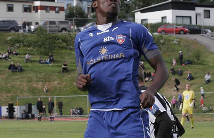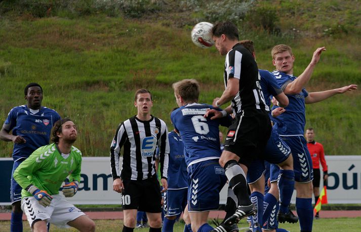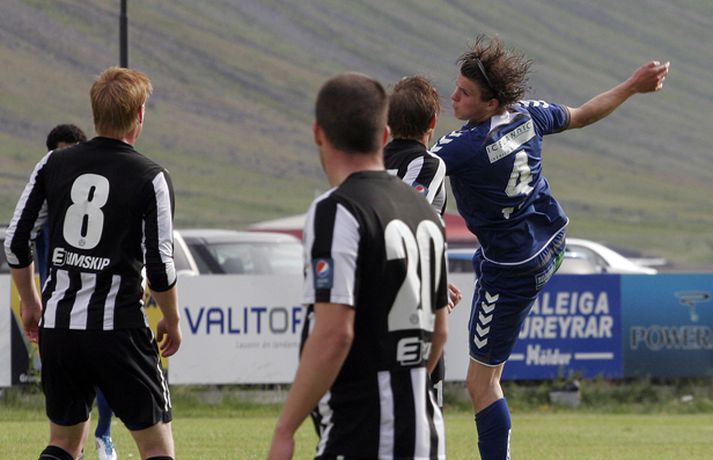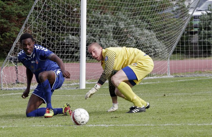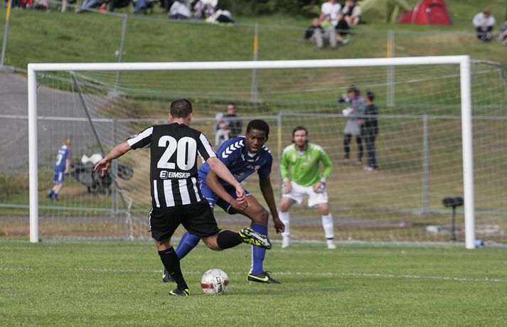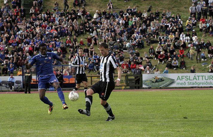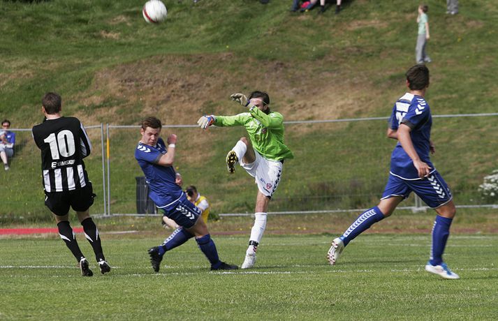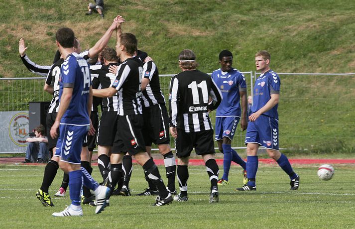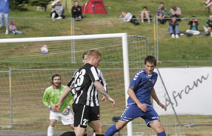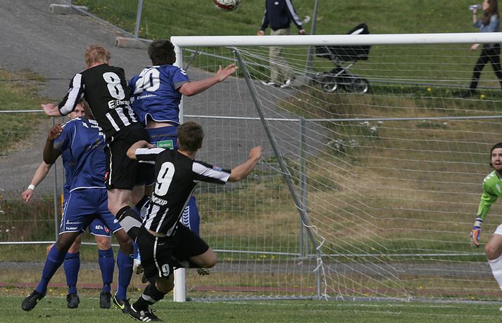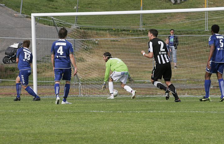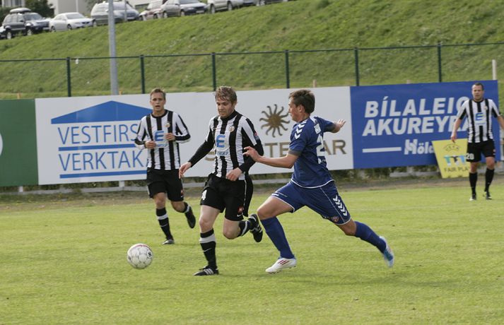 KR-ingar tryggðu sér sæti í bikarúrslitaleiknum með því að vinna 4-1 sigur á BÍ/Bolungarvík á Ísafirði í dag. KR-ingar eru þar með komnir í bikarúrslitaleikinn í þriðja sinn á síðustu fjórum tímabilum en þetta verður sextándi bikarúrslitaleikur A-liðs KR frá upphafi. Staðan var jöfn, 1-1, þegar rúmar tíu mínútur voru eftir en KR-ingar skoruðu þá tvö mörk með þriggja mínútna millibili og innsigluðu síðan 4-1 sigur með fjórða markinu í uppbótartíma. Rósa Jóhannsdóttir, ljósmyndari Fréttablaðsins og Vísis, var á leiknum á Ísafirði í dag og náði þessum skemmtilegu myndum. Myndirnar má sjá í albúminu hér að neðan. Hægt er að sjá myndirnar stærri með því að smella á þær.Grétar Sigfinnur Sigurðarson skorar hér þriðja mark KR-inga.Mynd/Rósa