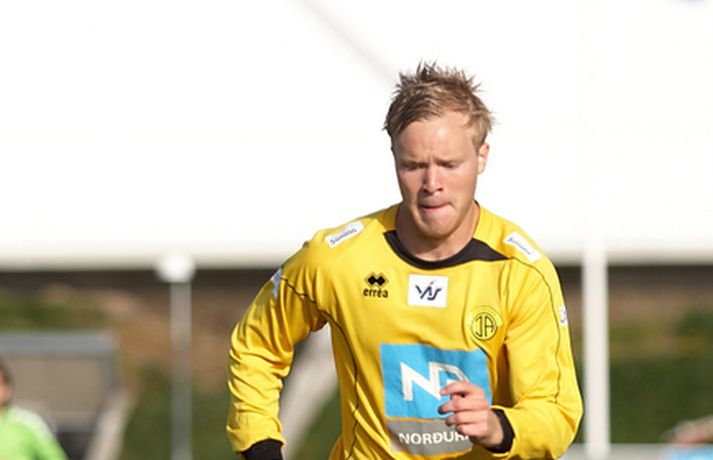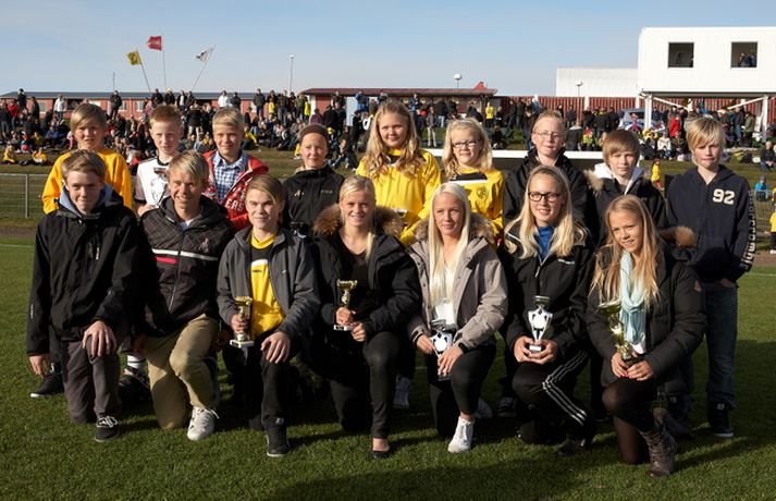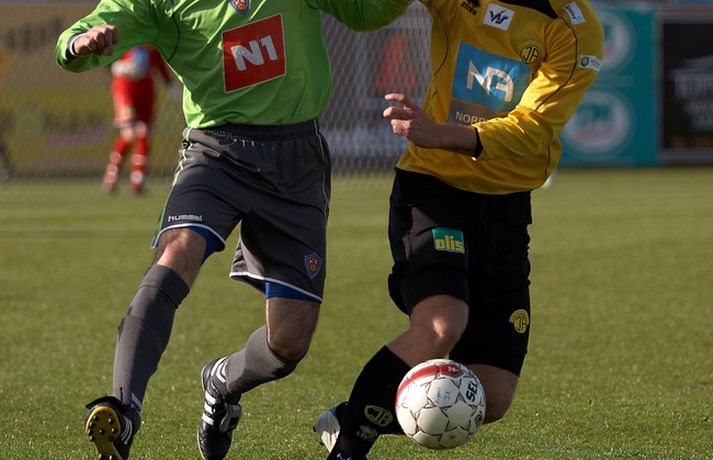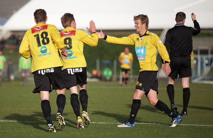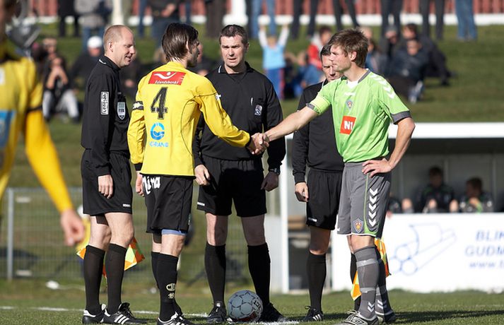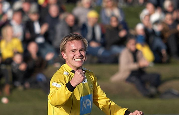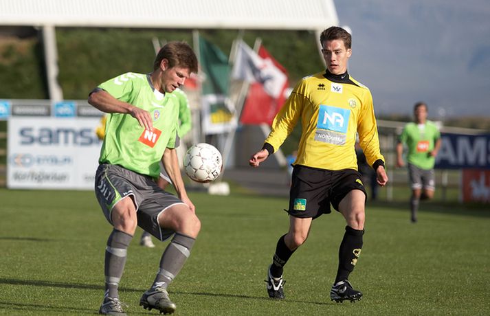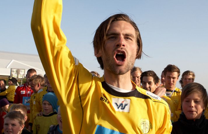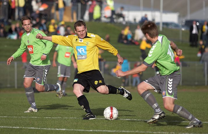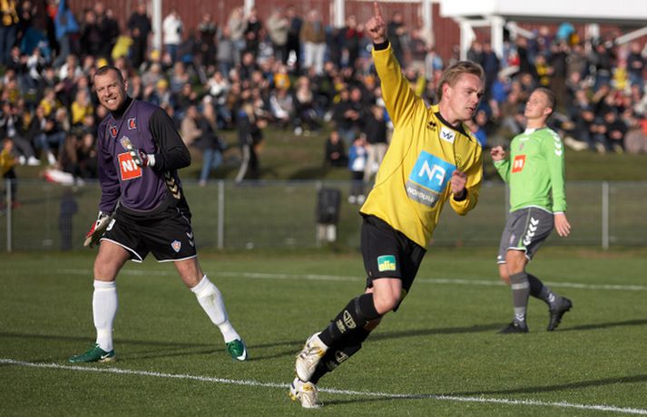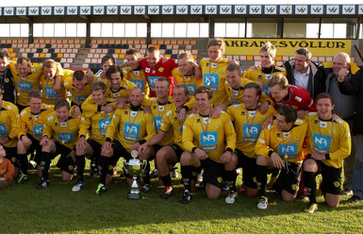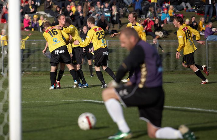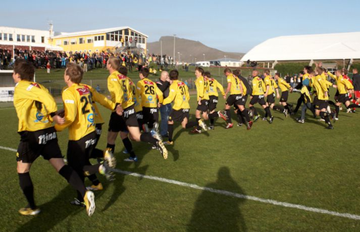 Skagamenn eru 1. deildarmeistarar í ár og þeir fengu bikarinn afhendan eftir 5-0 stórsigur á KA á Akranesi í gær. Skagamenn tryggðu sér sæti í Pepsi-deildinni fyrir 25 dögum og voru fyrir nokkru orðnir B-deildarmeistarar. Þetta er í þriðja sinn sem Skagamenn vinna B-deildina en þeir unnu hana einnig sumurin 1968 og 1991. Þá leið stuttur tími í að þeir unnu Íslandsbikarinn en ÍA vann hann 1970 á sínu öðru ári og árið 1992 varð félagið síðan fyrstu og einu nýliðarnir til að verða Íslandsmeistarar. Hjörtur Júlíus Hjartarson kom inn á sem varamaður á 58. mínútu í leiknum í gær og skoraði þrjú síðustu mörk Skagamanna í leiknum. Hjörtur hefur þar með skorað 15 mörk í 18 leikjum í 1. deildinni í sumar. Fannar Freyr Gíslason og Mark Doninger skoruðu tvö fyrstu mörk ÍA í leiknum. Skagamenn hafa unnið 16 af 21 leik sínum í 1. deildinni í sumar og hafa skorað í þeim 52 mörk gegn 13. ÍA vann 14 af 15 fyrstu leikjum sínum en gaf síðan aðeins eftir í næstu leikjum þegar úrvalsdeildarsætið var tryggt. Guðmundur Bjarki Halldórsson, ljósmyndari Fréttablaðsins og Vísis, var á leik ÍA og KA á Akranesvellinum í gær og náði þessum skemmtilegu myndum. Myndirnar má sjá í albúminu hér að neðan. Hægt er að sjá myndirnar stærri með því að smella á þær.