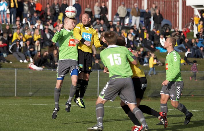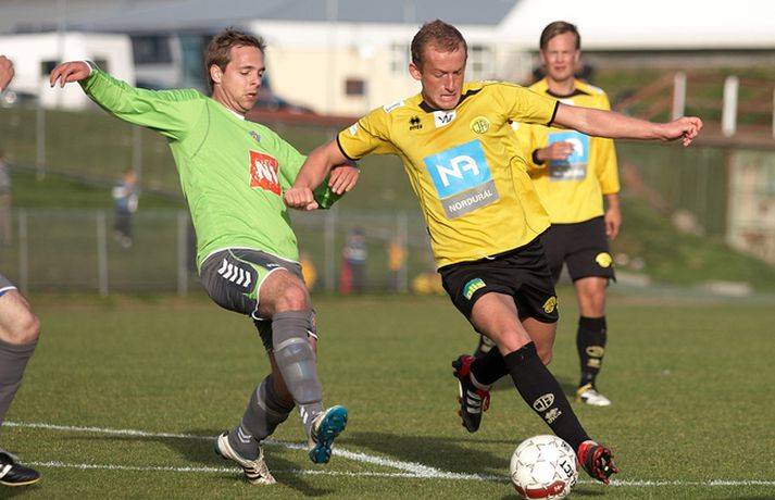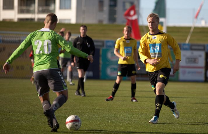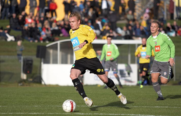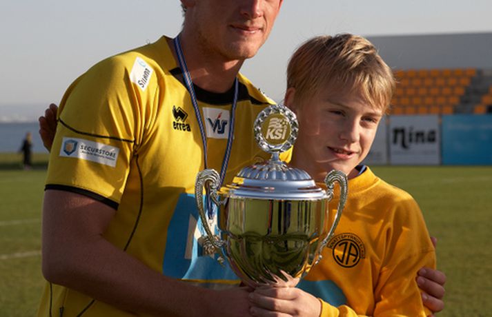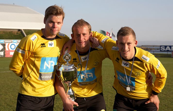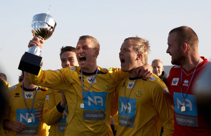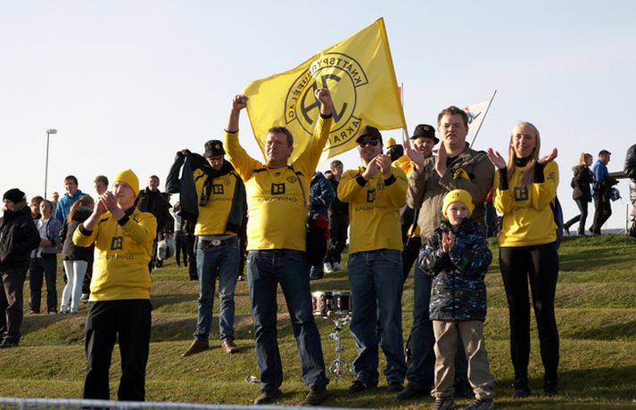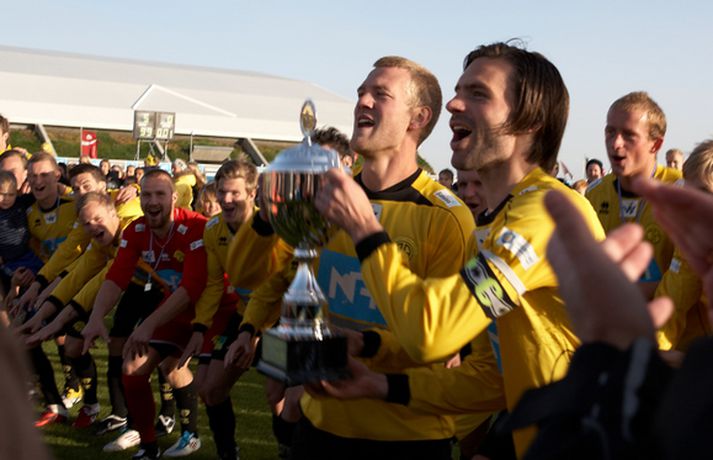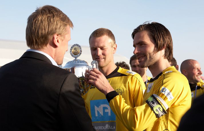 Bikar á loft upp á Skaga í gær - myndir Óskar Ófeigur Jónsson skrifar 11. september 2011 09:00 Reynir Leósson, fyrirliði ÍA, með bikarinn í gær. Mynd/Guðmundur Bjarki Halldórsson Skagamenn eru 1. deildarmeistarar í ár og þeir fengu bikarinn afhendan eftir 5-0 stórsigur á KA á Akranesi í gær. Skagamenn tryggðu sér sæti í Pepsi-deildinni fyrir 25 dögum og voru fyrir nokkru orðnir B-deildarmeistarar. Þetta er í þriðja sinn sem Skagamenn vinna B-deildina en þeir unnu hana einnig sumurin 1968 og 1991. Þá leið stuttur tími í að þeir unnu Íslandsbikarinn en ÍA vann hann 1970 á sínu öðru ári og árið 1992 varð félagið síðan fyrstu og einu nýliðarnir til að verða Íslandsmeistarar. Hjörtur Júlíus Hjartarson kom inn á sem varamaður á 58. mínútu í leiknum í gær og skoraði þrjú síðustu mörk Skagamanna í leiknum. Hjörtur hefur þar með skorað 15 mörk í 18 leikjum í 1. deildinni í sumar. Fannar Freyr Gíslason og Mark Doninger skoruðu tvö fyrstu mörk ÍA í leiknum. Skagamenn hafa unnið 16 af 21 leik sínum í 1. deildinni í sumar og hafa skorað í þeim 52 mörk gegn 13. ÍA vann 14 af 15 fyrstu leikjum sínum en gaf síðan aðeins eftir í næstu leikjum þegar úrvalsdeildarsætið var tryggt. Guðmundur Bjarki Halldórsson, ljósmyndari Fréttablaðsins og Vísis, var á leik ÍA og KA á Akranesvellinum í gær og náði þessum skemmtilegu myndum. Myndirnar má sjá í albúminu hér að neðan. Hægt er að sjá myndirnar stærri með því að smella á þær. Íslenski boltinn Mest lesið Bíll Shaquille O'Neal enn ófundinn Körfubolti Fluttu fréttir af snjónum í Reykjavík Fótbolti Formaðurinn hjálpaði til við að moka völlinn Fótbolti Búið að finna leiðina til að pirra og vinna Liverpool Enski boltinn Epicbet sýni handboltann í leyfisleysi: „Enda ólöglegar síður“ Handbolti Segja spurningar vakna um stöðu Elísabetar Fótbolti Óskar Hrafn fer ekki fet Íslenski boltinn Tölur úr Bestu 2025: Klúðraði langflestum dauðafærum í sumar Íslenski boltinn Sú leikjahæsta leggur skóna á hilluna og klárar læknanámið Fótbolti Sýknaður í alvarlegu ofbeldismáli Fótbolti Fleiri fréttir Tölur úr Bestu 2025: Klúðraði langflestum dauðafærum í sumar FH bíður með að tilkynna nýjan þjálfara Óskar Hrafn fer ekki fet Birnir frá Akureyri í Garðabæ Hættir með Fram Heimir kynntur til leiks í Árbænum Túfa rekinn frá Val Leyndarmáli ljóstrað upp þegar Heimir og Björn kvöddu Leikmenn kusu Patrick og Guðmund Sjáðu bananabombu Antons Loga og önnur síðustu mörk tímabilsins Uppgjörið: Stjarnan - Breiðablik 2-3 | Stjarnan í Evrópu þrátt fyrir tap „Held að ég geti ekki gert mikið meira“ Uppgjörið: Vestri - KR 1-5 | KR bjargaði sér og sendi Vestra í Lengjudeildina Uppgjörið: ÍA - Afturelding 1-0 | Afturelding staldraði stutt við í efstu deild Uppgjörið: Víkingur - Valur 2-0 | Meistararnir klára tímabilið með stæl Uppgjörið: ÍBV - KA 3-4 | KA tryggði sér Forsetabikarinn þriðja árið í röð Ráðast örlög Aftureldingar inni í höll? „Þetta verður bara veisla fyrir vestan“ Vestri og KR mætast á fyrsta degi vetrar: „Vona að það snjói ekki í nótt“ Lárus Orri framlengir á Skaganum „Kominn tími á sigur í Sambandsdeildinni“ Tekur við af læriföður sínum Snjó kyngir niður á Akureyri og Evrópuleikur færður inn „Veistu hvað leikmaðurinn sagði við mig?“ „Ég þarf bara að láta verkin tala“ Valur og Sigurður Egill senda frá sér sameiginlega yfirlýsingu Hemmi Hreiðars orðaður við Val Katrín kvödd með fallegum hætti: „Ég hef aldrei séð þetta áður“ Sjáðu þrumufleyg Fred og snöggt svar Stjörnunnar Enginn þjálfari hefur bæði byrjað og klárað Sambandsdeildina Sjá meira