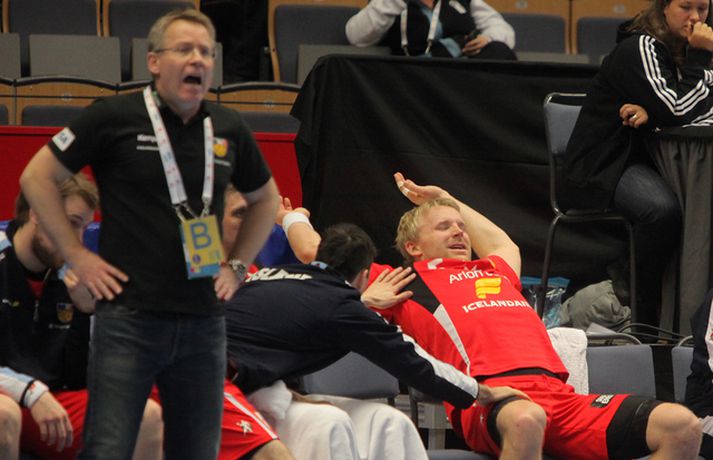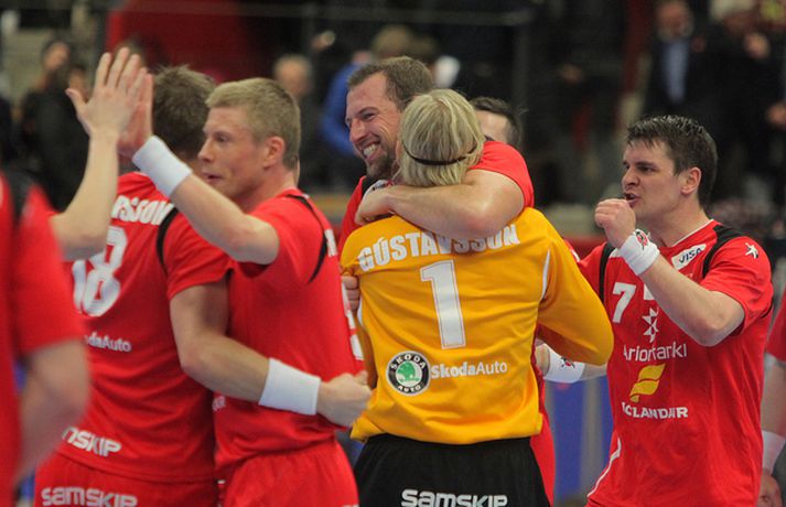 Ísland vann í gær stórglæsilegan sjö marka sigur á Noregi, 29-22, á HM í handbolta í Svíþjóð. Leikurinn var í lokaumferð riðlakeppninnar en Ísland vann alla sína leiki í B-riðli og fer því með flest möguleg stig með sér í milliriðlakeppnina. Ísland leikur í milliriðli 1 sem fer fram í Jönköping og mætir Þýskalandi á morgun. Stemningin á leiknum í gær var mögnuð og var Valgarður Gíslason, ljósmyndari Vísis og Fréttablaðsins, með myndavélina á lofti allan leikinn og gott betur. Myndirnar hans má sjá með því að smella á hlekkinn hér fyrir neðan. Alexander Petersson fagnar eftir leik.Mynd/Valli