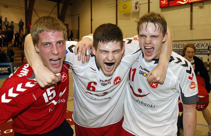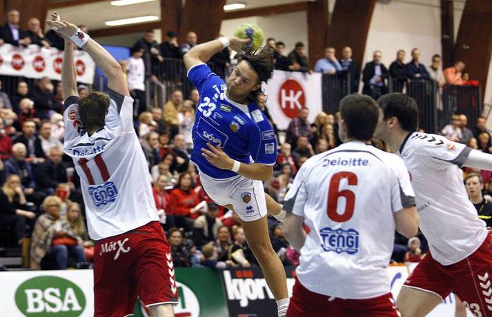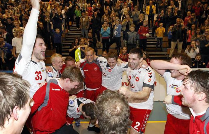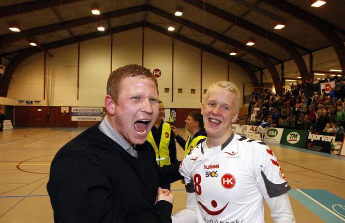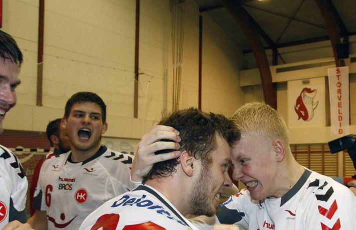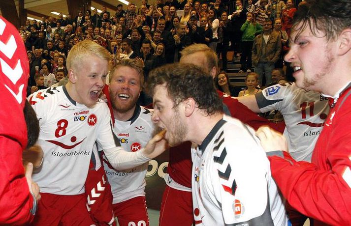 HK-ingar tryggðu sér sæti í úrslitakeppni N1 deildar karla í handbolta með því að vinna 26-23 sigur á Fram í Digranesi í kvöld í hreinum úrslitaleik um fjórða og síðasta sætið. HK-menn eru þar með í úrslitakeppninni fjórða árið í röð en HK er eina liðið sem hefur verið með í öll skiptin síðan að úrslitakeppnina var tekin upp að nýju vorið 2009. Haukar og Akureyri eru með í þriðja sinn en FH bara í annað skiptið. Stefán Karlsson, ljósmyndari Fréttablaðsins og Vísis, var á leik HK og Fram í Digranesi í kvöld og náði þessum skemmtilegu myndum. Myndirnar má sjá í albúminu hér að neðan. Hægt er að sjá myndirnar stærri með því að smella á þær.