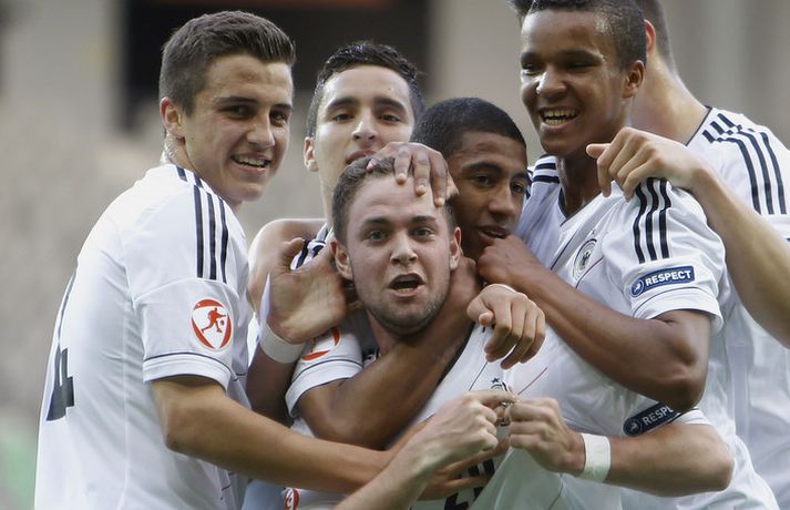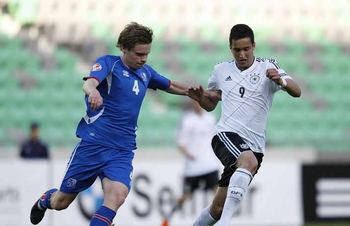 U-17 liðið tapaði fyrir Þjóðverjum Eiríkur Stefán Ásgeirsson skrifar 7. maí 2012 15:58 Mynd/Nordic Photos/Bongarts Íslenska U-17 landsliðið tapaði með minnsta mun, 1-0, fyrir Þýskalandi á Evrópumeistaramótinu sem fer nú fram í Slóveníu. Marc Stendera skoraði eina mark leiksins á 20. mínútu eftir að Þjóðverjar færðu sér mistök íslensku varnarinnar í nyt. Stendera skoraði með laglegu skoti af vítateigslínunni. Sigurinn var sanngjarn enda Þjóðverjar hættulegri aðilinn í leiknum og mun meira með boltann. Strákarnir fengu þó sín færi. Ævar Ingi Jóhannesson skoraði mark sem var dæmt ógilt vegna rangstöðu sem var þó afar tæpur dómur. Stefán Þór Pálsson og Daði Bergsson komust svo báðir í góð skotfæri í seinni hálfleik en inn vildi boltinn ekki. Óliver Sigurjónsson átti góðan leik í íslenska liðinu, sem og Ævar Ingi á vinstri kantinum. Heilt yfir voru þó íslensku strákarnir nokkuð ragir við að sækja fram og ekki fyrr en á síðasta stundarfjórðungnum að þeir létu reyna almennilega á þýsku vörnina. Þjóðverjar eru með sigrinum komnir áfram í undanúrslitin og skiptir engu þó svo að liðið tapi fyrir Frökkum í lokaumferð riðlakeppninnar á fimmtudaginn. Íslendingar mæta Georgíumönnum í lokaumferðinni og geta með sigri komist í undanúrslitin. En þá þurfa þeir líka að treysta á að Frakkar vinni ekki sinn leik gegn Þýskalandi. Leiknum var lýst beint á Boltavakt Vísis. Íslenski boltinn Mest lesið Líður alltaf yfir hana þegar hún kemur í mark Sport „Hefði séð eftir því alla ævi“ Íslenski boltinn „Mjög sáttur með samninginn“ Íslenski boltinn „Hann ætti bara að skrifa afsökunarbiblíuna“ Körfubolti Rekinn fyrir ummæli sín um krabbameinssjúka handboltagoðsögn Handbolti Magnús Már í viðræðum við HK Íslenski boltinn Einkunnir Íslands: Þrjár heitastar í frostinu Fótbolti Real Madrid vill stórar skaðabætur frá UEFA Fótbolti Hefur spilað 16 mínútur og fengið tvö rauð spjöld Enski boltinn Rúmar tvær milljónir í boði ef þú finnur hundinn hans Aarons Ramsey Fótbolti Fleiri fréttir Scholes hættir og setur einhverfan son sinn í fyrsta sætið Rúmar tvær milljónir í boði ef þú finnur hundinn hans Aarons Ramsey Carrick í einkaviðtali: Sigurinn á Anfield stór stund fyrir Man. Utd Hefur spilað 16 mínútur og fengið tvö rauð spjöld Bættu Evrópumet AC Milan liðsins með Gullit og Van Basten innanborðs Slot: Engin auka pressa við þetta tap Real Madrid vill stórar skaðabætur frá UEFA „Mjög sáttur með samninginn“ „Hefði séð eftir því alla ævi“ Magnús Már í viðræðum við HK Bað alla nema þjálfarann afsökunar Vísar slúðrinu til föðurhúsanna Ísak Bergmann lagði upp gegn Bayern „Við tókum bara þá ákvörðun að fara í Svanavatnið“ Albert og Mikael Egill í vondum málum á Ítalíu Palace neitar að sleppa takinu á Liverpool „Eitthvað sem ég mun aldrei gleyma“ Einkunnir Íslands: Þrjár heitastar í frostinu Viktor Bjarki skoraði og lagði upp í fyrsta byrjunarliðsleiknum Uppgjörið: Ísland - Norður-Írland 3-0 | Áfram hluti af elítunni Pedri gæti verið frá keppni til langs tíma Arteta fyrstur stjóranna á fætur Þorsteinn breytir engu á milli leikja Snjóbræðslukerfi Þróttar kom KSÍ til bjargar Tölur úr Bestu 2025: Klúðraði langflestum dauðafærum í sumar Segja spurningar vakna um stöðu Elísabetar Litu á hann sem risaeðlu en sjáið hvað er í tísku núna Formaðurinn hjálpaði til við að moka völlinn Formenn sambandanna hjálpuðu við að moka völlinn Real Madrid mun ekki refsa Vinícius Júnior Sjá meira