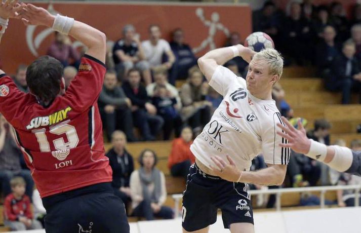 FH vann frábæran sigur, 28-25, á Aftureldingu í N-1 deildar karla í handknattleik en leikurinn fór fram í Kaplakrika í Hafnafirði. Það var frekar mikill vandræðagangur á leik liðanna til að byrja með og áttu þau bæði erfitt með að fóta sig. Þegar hálfleikurinn var hálfnaður var staðan 5-5 og fátt um fína drætti. Leikmenn Aftureldingar voru meira og minna útaf í fyrri hálfleiknum en liðið fékk ótal tveggja mínútna brotvísanir dæmdar á sig í hálfleiknum. Samt sem áður stóðu gestirnir alltaf í Fimleikafélaginu og gerðu í raun mun betur. Þegar fimm mínútur voru eftir að fyrri hálfleiknum var staðan 13-8 fyrir gestunum og þá var Einari Andra, þjálfara FH, nóg boðið og hann tók leikhlé. Þvílík stemmning í liðið Aftureldingar sem skilaði sér í frábærum varnarleik og öguðum sóknarleik. FH-ingar náðu aðeins að rétt úr kútnum fyrir lok hálfleiksins og var staðan 14-11 fyrir Aftureldingu í hálfleik. Gestirnir héldum áfram uppteknum hætti í upphafi síðari hálfleiks og leiddu 17-14 þegar átta mínútur voru liðnar af hálfleiknum. Munurinn hélst sá sami á liðunum næstu mínútur og þegar síðari hálfleikurinn var hálfnaður var staðan 20-17 fyrir Aftureldingu. Á stuttum kafla skoruðu FH-ingar fjögur mörk í röð og breyttu stöðunni úr 21-18 í 22-21 sér í vil. FH-ingar náðu að nýta sér reynslu sína það sem eftir lifði leiks og kláruðu leikinn með frábærum sigri 28-25. Ásbjörn Friðriksson, leikmaður FH, var stórkostlegur í kvöld en hann gerði tíu mörk og leiddi lið sitt til sigurs. Reynir: Það vantaði allt malt í okkur„Við spiluðum bara mjög vel svona lungann af leiknum en það dugði ekki til í kvöld," sagði Reynir Þór Reynisson, þjálfari Aftureldingar, eftir tapið í kvöld. „Við vorum með undirtökin fyrstu fimmtíu mínútur leiksins en eftir það urðu menn yfirspenntir og það fór með þennan leik í kvöld." „Við förum að taka rangar ákvarðanir, skjótum illa og það vantaði hreinlega bara meira malt í okkur í kvöld." „Við erum búnir að æfa gríðarlega vel í fríinu og liðið er í toppstandi, eins og kannski sást í kvöld." Hægt er að sjá myndband af viðtalinu við Reyni hér að ofan. Einar Andri: Fundum einhvern aukakraft undir lokin„Þetta var langt frá því að vera auðveldur sigur og ég verð að hrósa Aftureldingu fyrir frábæran leik í kvöld," sagði Einar Andri Einarsson, þjálfari FH, eftir sigurinn. „Þeir gerðu okkur virkilega erfitt fyrir og voru í raun betra liðið á vellinum í 48 mínútur, en þá tókum við völdin." „Við héldum alltaf áfram og höfðum alltaf trú á verkefninu, síðan undir lokin fundum við einhvern auka kraft til að fara með þetta alla leið." „Þeir komu okkur kannski örlítið á óvart til að byrja með þegar þeir nálguðust leikinn af mikilli hörku og það sló mína menn aðeins útaf laginu, við verðum að viðurkenna það."Hægt er að sjá myndband af viðtalinu með því að ýta hér.
