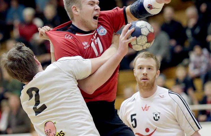 Umfjöllun, viðtöl og myndir: FH - Afturelding 28-25 Stefán Árni Pálsson skrifar 4. febrúar 2013 14:21 FH vann frábæran sigur, 28-25, á Aftureldingu í N-1 deildar karla í handknattleik en leikurinn fór fram í Kaplakrika í Hafnafirði. Það var frekar mikill vandræðagangur á leik liðanna til að byrja með og áttu þau bæði erfitt með að fóta sig. Þegar hálfleikurinn var hálfnaður var staðan 5-5 og fátt um fína drætti. Leikmenn Aftureldingar voru meira og minna útaf í fyrri hálfleiknum en liðið fékk ótal tveggja mínútna brotvísanir dæmdar á sig í hálfleiknum. Samt sem áður stóðu gestirnir alltaf í Fimleikafélaginu og gerðu í raun mun betur. Þegar fimm mínútur voru eftir að fyrri hálfleiknum var staðan 13-8 fyrir gestunum og þá var Einari Andra, þjálfara FH, nóg boðið og hann tók leikhlé. Þvílík stemmning í liðið Aftureldingar sem skilaði sér í frábærum varnarleik og öguðum sóknarleik. FH-ingar náðu aðeins að rétt úr kútnum fyrir lok hálfleiksins og var staðan 14-11 fyrir Aftureldingu í hálfleik. Gestirnir héldum áfram uppteknum hætti í upphafi síðari hálfleiks og leiddu 17-14 þegar átta mínútur voru liðnar af hálfleiknum. Munurinn hélst sá sami á liðunum næstu mínútur og þegar síðari hálfleikurinn var hálfnaður var staðan 20-17 fyrir Aftureldingu. Á stuttum kafla skoruðu FH-ingar fjögur mörk í röð og breyttu stöðunni úr 21-18 í 22-21 sér í vil. FH-ingar náðu að nýta sér reynslu sína það sem eftir lifði leiks og kláruðu leikinn með frábærum sigri 28-25. Ásbjörn Friðriksson, leikmaður FH, var stórkostlegur í kvöld en hann gerði tíu mörk og leiddi lið sitt til sigurs. Reynir: Það vantaði allt malt í okkur„Við spiluðum bara mjög vel svona lungann af leiknum en það dugði ekki til í kvöld," sagði Reynir Þór Reynisson, þjálfari Aftureldingar, eftir tapið í kvöld. „Við vorum með undirtökin fyrstu fimmtíu mínútur leiksins en eftir það urðu menn yfirspenntir og það fór með þennan leik í kvöld." „Við förum að taka rangar ákvarðanir, skjótum illa og það vantaði hreinlega bara meira malt í okkur í kvöld." „Við erum búnir að æfa gríðarlega vel í fríinu og liðið er í toppstandi, eins og kannski sást í kvöld." Hægt er að sjá myndband af viðtalinu við Reyni hér að ofan. Einar Andri: Fundum einhvern aukakraft undir lokin„Þetta var langt frá því að vera auðveldur sigur og ég verð að hrósa Aftureldingu fyrir frábæran leik í kvöld," sagði Einar Andri Einarsson, þjálfari FH, eftir sigurinn. „Þeir gerðu okkur virkilega erfitt fyrir og voru í raun betra liðið á vellinum í 48 mínútur, en þá tókum við völdin." „Við héldum alltaf áfram og höfðum alltaf trú á verkefninu, síðan undir lokin fundum við einhvern auka kraft til að fara með þetta alla leið." „Þeir komu okkur kannski örlítið á óvart til að byrja með þegar þeir nálguðust leikinn af mikilli hörku og það sló mína menn aðeins útaf laginu, við verðum að viðurkenna það."Hægt er að sjá myndband af viðtalinu með því að ýta hér. Olís-deild karla Mest lesið Vonast til að komast í Kórinn: „Menn hafa aldrei séð annað eins“ Fótbolti Fær þrjár milljónir á dag næstu sex árin fyrir að gera ekkert Sport Leyndarmáli ljóstrað upp þegar Heimir og Björn kvöddu Íslenski boltinn Landsleiknum aflýst og framhaldið óljóst Fótbolti Stöðufundur í Laugardal klukkan 10:30 Fótbolti Túfa rekinn frá Val Íslenski boltinn Elsta konan til klára Járnkarlinn Sport Enska úrvalsdeildin í jólaköttinn Enski boltinn „Varnarleikurinn er bara stórslys“ Enski boltinn Markvörður Inter banaði háöldruðum manni í hjólastól Sport Fleiri fréttir Teitur inn í landsliðið Gísli bjó til meira en þriðjung markanna Haukur magnaður í sigri Löwen Blær skoraði þrjú og lagði upp jöfnunarmarkið KA/Þór sótti sigur gegn Fram og stigalausar Stjörnukonur Fram kjöldró HK og spenna í Eyjum Meistararnir unnu gegn ÍBV og ÍR hafði betur gegn Selfyssingum Donni og félagar björguðu stigi undir lokin Afturelding komst upp að hlið Hauka Seldu bleika búninginn hennar Herrem fyrir meira en milljón „Leið vel þegar ég fór inn úr færinu“ Uppgjörið FH - Haukar 27-26 | Birgir Már tryggði FH sigur eftir spennutrylli Bernard fór mikinn en Valsmenn sluppu með sigurinn Fyrsti sigur Þórsara síðan í byrjun september Ómar Ingi með fullkomnan leik í Meistaradeildinni Guðjón Valur og lærisveinar hársbreidd frá því að vinna Kiel Hlakka til að sjá Viktor Gísla aftur og senda honum skilaboð Neyddar í sömu stöðu og Ísland og límdu melónur á skóna Hatar hvítu stuttbuxurnar Fjölga stórmótum landsliða í handboltanum Allt jafnt í bikarslag íslensku stelpnanna Orri fagnaði í Íslendingaslag í Meistaradeildinni Hjartavandamál halda Reyni frá keppni Stórar breytingar á Evrópukeppnum í handbolta Framarar töpuðu aftur á heimavelli í Evrópudeildinni Magdeburg komst örugglega áfram í sextán liða úrslitin Íslensku strákarnir áberandi í Evrópudeildinni „Stærri og sterkari en liðin sem við þekkjum hérna heima“ Viktor til liðs við frænda sinn og bróður Uppgjörið: Portúgal - Ísland 26-25 | Annar eltingaleikur íslenska liðsins endar með öðru tapi Sjá meira