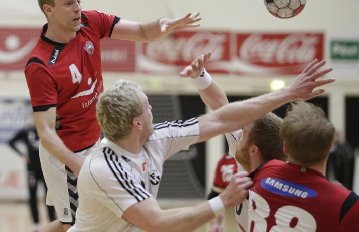 FH vann flottan sigur, 21-20, á Val í æsispennandi leik í N1-deild karla í handknattleik en leikurinn fór fram í Kaplakrika. Logi Geirsson var atkvæðamestur í liði FH með sex mörk. Jafnræði var á með liðunum til að byrja með en heimamenn í FH ávallt einu skrefi á undan. Valsmenn voru samt sem áður gríðarlega ákveðir og fastir fyrir í varnarleiknum. Þegar hálfleikurinn var hálfnaður var staðan 4-4. Þá misstu Valsmenn tvö menn útaf með tveggja mínútna brotvísanir og voru því fjórir útispilarar gegn sex en á þeim kafla náðu FH-ingar þriggja marka forystu 7-4. Valsmenn komust aftur inn í leikinn og var staðan 9-8 í hálfleik. Valsmenn gerðu tvö fyrstu mörk síðari hálfleiksins en þá komu fjögur í röð frá FH og þeir breyttu stöðunni í 13-10. FH-ingar voru sterkari næstu tíu mínútur leiksins og voru ávallt skrefinu á undan. Valsmenn voru samt alltaf ákveðnir og ætluðu greinilega að selja sig dýrt í leiknum. Þegar tólf mínútur voru eftir var staðan 16-16 og mikil spenna í leiknum. Því næst unnu Valsmenn boltann og Sveinn Aron Sveinsson skoraði úr hraðaupphlaupi. Staðan var orðin 17-16 fyrir gestina. FH-ingar hrukku þá í gang og komust í 19-18 þegar sjö mínútur voru eftir af leiknum. Spennan hélst áfram alveg fram til enda en það voru FH-ingar sem voru sterkari á lokasprettinum og unnu eins marks sigur 21-20. Þorbjörn Jensson: Handboltinn snýst ennþá um það sama„Þetta var ágætis leikur og mikið um sterkan varnarleik," sagði Þorbjörn Jensson, aðstoðarþjálfari Vals, eftir tapið í kvöld. „Það sem vantaði uppá hjá okkur var að nýta færin betur. Við fengum alveg heilan helling af góðum færum sem liðið var ekki að notfæra." „Við gerðum markvörðinn hjá FH bara góðan með því að skjóta svona mikið í hann. Varnarleikur okkar sem og markvarsla var til fyrirmyndar og ég hef engar áhyggjur af því, þurfum að bæta okkur sóknarlega núna." „Ég hef ekki verið neitt í kringum handbolta í 12 ár. Íþróttin hefur ekki mikið breyst á þeim tíma, þetta snýst ennþá um að skora fleiri mörk en andstæðingurinn og undirbúa sig fyrir hann." Hægt er að sjá myndband af viðtalinu hér að ofan. Logi Geirsson: Ég er að fara massa mig meira upp„Þetta var sannkallaður baráttusigur," sagði Logi Geirsson, eftir sigurinn í kvöld. „Valsmenn eru með gríðarlega sterkan hóp og við vissum að þetta yrði erfitt. Þetta hafðist samt í lokin og við náðum að knýja fram gríðarlega mikilvæg tvö stig fyrir úrslitakeppnina." „Við höfum alls ekkert verið að valta yfir andstæðinga okkar og lið ná oft á tíðum að halda í við okkar, en við erum alltaf að spila eftir sömu leikaðferð og höfum trú á henni. Liðið hefur verið á mikilli siglingu í deildinni að undanförnu og það mun bara halda áfram." „Ég er komin á fullt í lyftingasalinn og þarf að bæta aðeins á mig. Eftir á Ólafur Gústafsson fór frá liðinu er ég komin með nýtt hlutverk og þá verð ég heldur betur að standa mig."Hægt er að sjá myndband af viðtalinu með því að ýta hér.