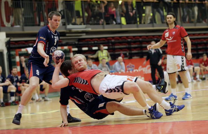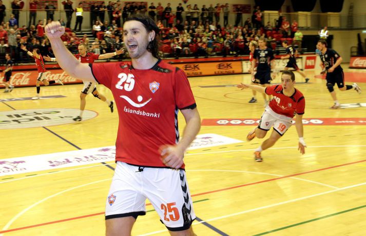 Valur vann Aftureldingu í lokaumferð N1-deild karla, 25-21, og heldur sæti sínu í deildinni í bili í það minnsta en Afturelding er fallin. Frábær leikur sem bauð uppá allt en Finnur Ingi Stefánsson, leikmaður Vals, var frábær í fyrri hálfleik og skoraði alls sjö mörk í leiknum. Jóhann Jóhannsson var stórkostlegur fyrir gestina og gerði níu mörk. Leikurinn byrjaði með miklum látum og gríðarlega barátta var í báðum liðum. Það sauð oft á tíðum upp úr á fyrstu mínútunum og lá við slagsmálum. Afturelding byrjaði leikinn betur og komst í 2-0 en Valsmenn skoruðu ekki mark fyrstu sjö mínútur leiksins. Valsmenn fóru þá loks í gang og sóknarleikur þeirra fór að smella saman. Þegar þrettán mínútur voru eftir var staðan er orðin 7-5 fyrir heimamenn. Valsmenn voru magnaðir í sinni framliggjandi vörn og leikmenn Aftureldingar vissu oft á tíðum ekkert hvernig bregðast átti við. Valsmenn náðu mest fjögurra marka forskoti í fyrri hálfleiknum 12-8. Þegar flautað var til hálfleiks var staðan 13-11 eftir að gestirnir gáfu í á lokaspretti hálfleiksins. Afturelding byrjaði síðari hálfleikinn rétt eins og þann fyrri með tveimur mörkum í röð og jöfnuðu strax metin í 13-13. Þá fóru Valsmenn aftur í gang og komust fljótlega eftir það aftur tveimur mörkum yfir, 15-13. Leikurinn var spennandi alveg til enda en Valsmenn alltaf einu skrefi á undan. Frábær varnarleikur gerði gæfumuninn fyrir Val en honum lauk með sigri heimamanna 25-21. Lárus Helgi: Ótrúlegur varnarleikur í kvöld„Þetta er frábært," sagði Lárus Helgi Ólafsson, markvörður Vals, sáttur að leikslokum. „Nú er bara framundan þetta umspil og við verðum klárið í þann slag. Við erum alls ekkert að fara slaka á núna, við höfum séð þessi 1. deildarlið fara virkilega illa með nokkur lið í N1-deildinni." „Það var gríðarleg barátta í leiknum og maður hugsaði til að byrja með hvað myndu mörg rauð spjöld fara á loft í kvöld." „Þessi vörn hefur verið mögnuð hjá okkur eftir áramót og frammistaða strákana í hjarta varnarinnar var með ólíkindum í kvöld." Lárus Helgi skoraði síðasta mark leiksins í kvöld, yfir allan völlinn og fagnaði gríðarlega. „Maður var að setja einn mark í kvöld. Davíð Svansson (markvörður Aftureldingar) hefur áður skorað gegn mér og ég varð að klína boltanum í netið í kvöld." Hægt er að sjá myndband af viðtalinu hér að ofan. Fannar: Leikurinn í kvöld var aðal hindrunin„Það sem lagði grunninn að þessum sigri var klárlega þéttur varnarleikur," sagði Fannar Þorbjörnsson, leikmaður Vals, eftir sigurinn. „Við ætluðum að mæta dýrvitlausir alveg frá byrjun og leggja strax línurnar. Það tókst svona líka vel og við gáfum ekkert eftir alveg til enda." „Við vorum kannski smávegis í vandræðum sóknarlega til að byrja með en fyrir utan það fannst mér við hafa þennan leik alltaf." „Þetta er búið að vera skrítin vetur og liðið hefur gengið í gegnum margt. Þjálfarinn er látinn fara og nýir leikmenn koma inn í hópinn. Við vorum oft á tíðum rosalega langt niðri andlega en markmiðið hafðist og við ætlum okkur að vera í efstu deild að ári." „Nú tekur við umspil sem ég óttast ekkert og tel að við séum með mun betra lið en öll hin liðin í þessu umspili. Aðalhindrunin var í kvöld og við stóðumst hana."Hægt er að sjá myndband af viðtalinu með því að ýta hér.Myndir / Vilhelm Gunnarsson