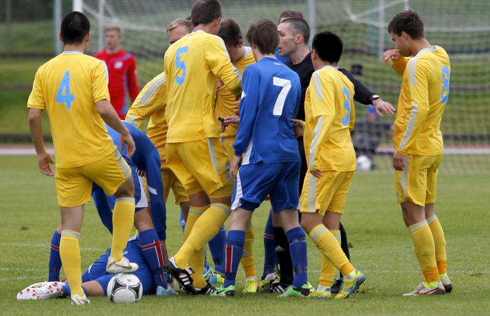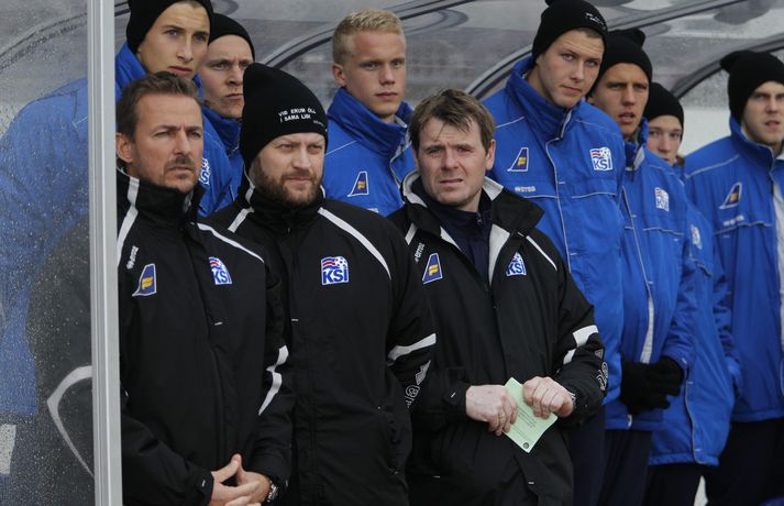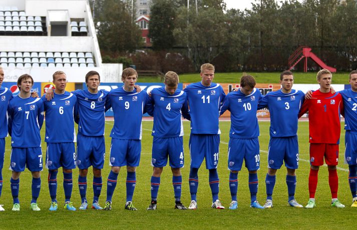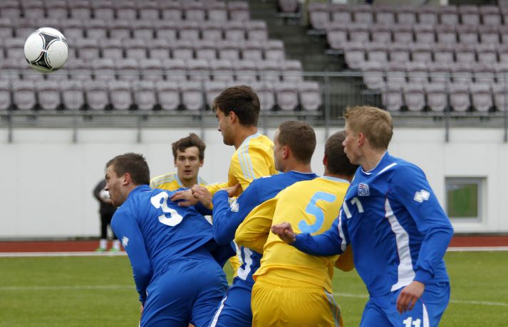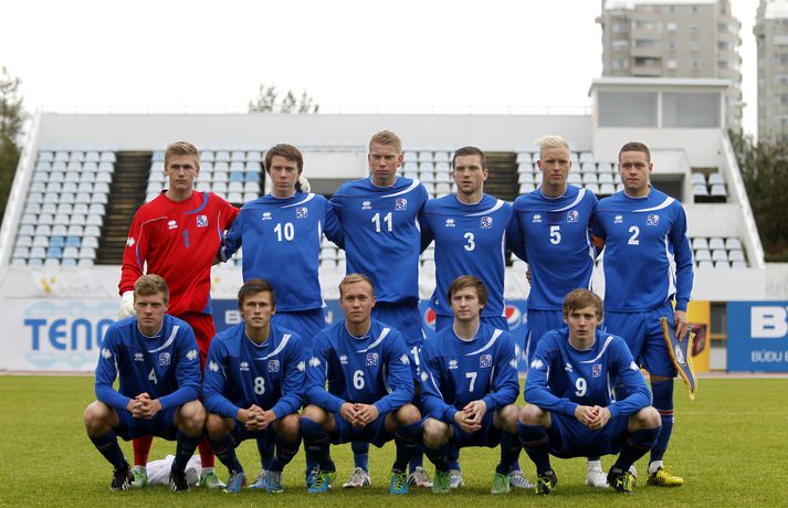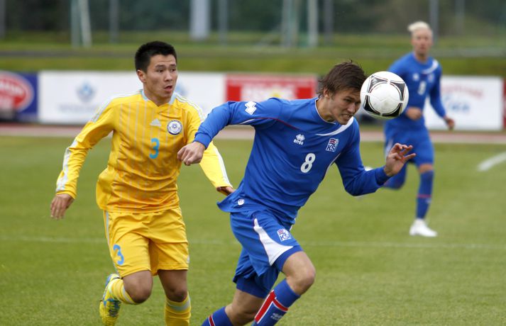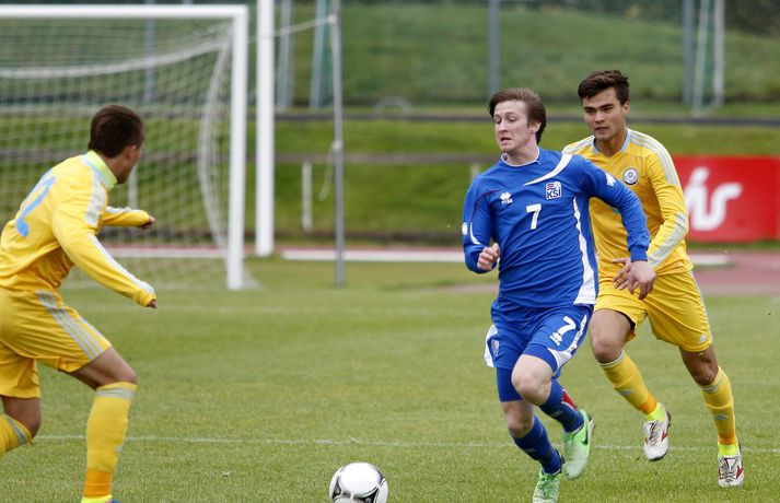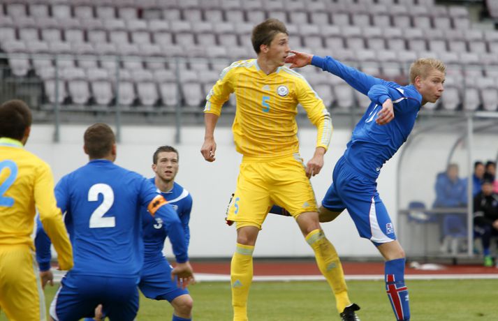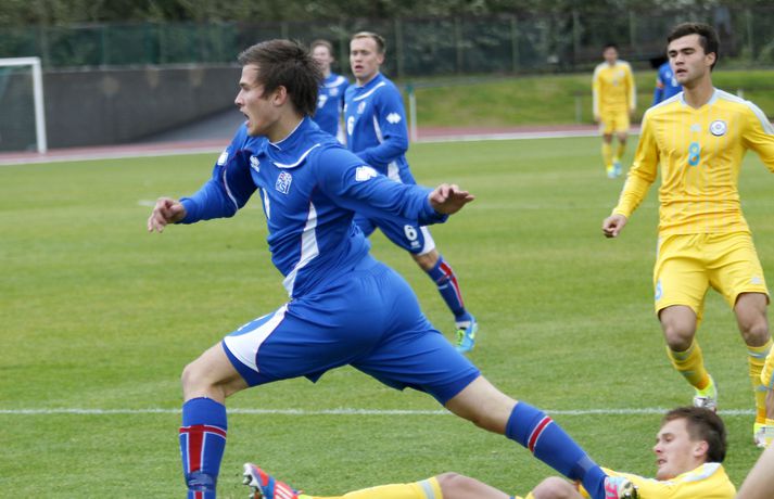 Íslenska ungmennalandsliðið er sem fyrr á sigurbraut en liðið vann sinn fjórða leik í röð í undankeppni EM í dag. Þá skelltu strákarnir liði Kasakstan. Fyrri hálfleikur fór fjörlega af stað og voru íslensku piltarnir mun sterkari í upphafi. Veðrið setti sterkan svip á leikinn og vindurinn blés duglega á leikmenn. Ísland skapaði sér nokkur ágætis færi í fyrri hálfleik og ber þar helst að nefna skot frá Herði Björgvini Magnússyni á 7. mínútu leiksins. Hörður skaut af 35 metra færi en Sergey Tkachuk, markmaður Kazakhstan varði vel. Andri Rafn Yeoman fékk úrvalsfæri a 22. mínútu eftir flott spil íslenska liðsins en skot hans sleikti stöngina. Gestirnir ógnuðu ekki mikið í fyrri hálfleik og hvorugt lið náði að setja marks sitt á leikinn. Staðan var markalaus eftir 45. mínútur. Seinni hálfleikur hófst eins og þeim fyrri lauk. Ísland var meira með boltann og alltaf líklegri en gestirnir. Á 57. mínutu fékk Ísland hornspyrnu sem Guðmundur Þórarinsson tók. Hann sendi boltann in á teig og þar var Keflvíkingurinn Arnór Ingvi Traustason réttur maður á réttum stað. Boltinn skoppaði í grasið og þaðan til Arnórs sem setti boltann yfir línuna. Veðrið var enn verra í síðari hálfleik og spilamennskan eftir því. Langar sendingar voru erfiðar sem og þær stuttu rötuðu oft illa á samherja. En íslensku strákarnir sýndu mátt sinn og skoruðu annað markið á 84. mínútu. Það mark kom einnig eftir hornspyrnu frá Guðmundi. Hornspyrnan fór á hættulegt svæði inn í teig gestanna og eftir mikinn vandræðagang og klafs skoraði Emil Atlason. Eftir seinna markið var það aldrei spurning hver tæki stigin þrjú hérna í kvöld. Sanngjarn íslenskur sigur á Kópavogsvelli í dag. Ísland er búið að vinna alla leikina sína fjóra í riðlunum og eru efstir með tólf stig.Eyjólfur: Við gerðum okkur grein fyrir því að þetta yrði þolinmæðis leikur „Ég er virkilega ánægður. Við gerðum okkur grein fyrir því að þetta yrði þolinmæðis leikur. Erfiðar Aðstæður og andstæðingurinn með marga menn í vörn. Við biðum eftir rétta tækifærinu og bættum vel í í síðari hálfleik,“ sagði Eyjólfur Sverrisson þjálfari Íslands eftir leikinn. Var veðrið að valda ykkur vandræðum hérna í dag? „Já það gerði það mjög mikið. Þetta var erfitt fyrir bæði lið og við sjáum að þeir voru í vandræðum líka. Þá er þetta spurning um karakter sem þarf að hafa og að vera alltaf skrefi á undan. Alltaf með tána á undan í boltann og við gerðum það hérna í dag,“ sagði Eyjólfur. Tólf stig úr fjórum leikjum hlýtur að teljast mjög góður árangur? „Já, það er ekki hægt að gera betur en það. Þetta er með algjörum ólíkindum. Þetta er virkilega gaman og við erum hrærðir yfir þessum áfanga,“ „Við stefnum alltaf á sigur í hverjum einasta leik og þar af leiðandi viljum við komast í þetta umspil inn í lokakeppnina og meðan við höfum fræðilegan möguleika á því gerum við það.“ Sagði Eyjólfur Sverrisson sáttur með sína menn í lokin.Arnór: Alltaf gaman að vinna landsleik „Það eru allir sáttir eftir þennan leik. Alltaf gaman að vinna landsleik,“ sagði Arnór Ingvi Traustason, sem skoraði fyrra mark Íslands, eftir leikinn. „Við mættum út á völlinn í seinnihálfleik mjög stemdir. Við fengum hornspyrnu og ég var mættur á fjær. Við vorum búnir að tala um það boltinn kæmi oftast þangað. Þannig að ég var mættur þangað og setti hann inn,“ „Það er ekkert spes að spila í svona vondu veðri en maður verður bara að reyna spila sinn leik sama hvernig veðrið er. „Við settum okkur markmið um að komast á lokakeppnina og við erum í ágætis stöðu hvað það varðar,“ sagði Arnór Ingvi að lokum.