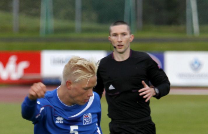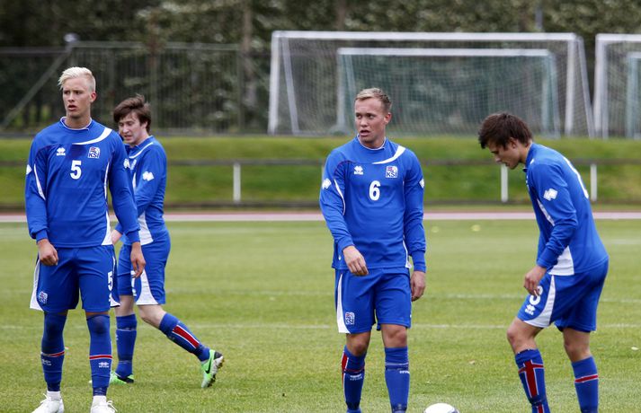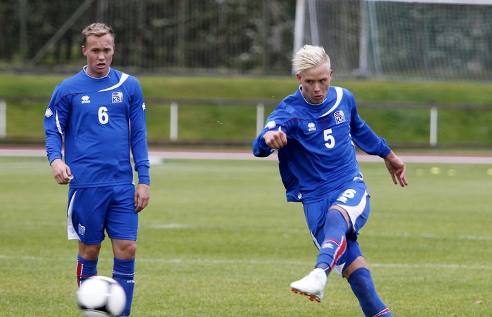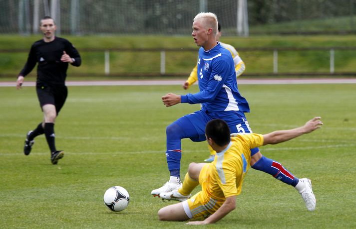 Umfjöllun, viðtöl og myndir: Ísland U-21 - Kasakstan U-21 2-0 Sigmar Sigfússon á Kópavogsvelli skrifar 10. september 2013 08:58 Arnór Ingvi á ferðinni í dag. mynd/pjetur Íslenska ungmennalandsliðið er sem fyrr á sigurbraut en liðið vann sinn fjórða leik í röð í undankeppni EM í dag. Þá skelltu strákarnir liði Kasakstan. Fyrri hálfleikur fór fjörlega af stað og voru íslensku piltarnir mun sterkari í upphafi. Veðrið setti sterkan svip á leikinn og vindurinn blés duglega á leikmenn. Ísland skapaði sér nokkur ágætis færi í fyrri hálfleik og ber þar helst að nefna skot frá Herði Björgvini Magnússyni á 7. mínútu leiksins. Hörður skaut af 35 metra færi en Sergey Tkachuk, markmaður Kazakhstan varði vel. Andri Rafn Yeoman fékk úrvalsfæri a 22. mínútu eftir flott spil íslenska liðsins en skot hans sleikti stöngina. Gestirnir ógnuðu ekki mikið í fyrri hálfleik og hvorugt lið náði að setja marks sitt á leikinn. Staðan var markalaus eftir 45. mínútur. Seinni hálfleikur hófst eins og þeim fyrri lauk. Ísland var meira með boltann og alltaf líklegri en gestirnir. Á 57. mínutu fékk Ísland hornspyrnu sem Guðmundur Þórarinsson tók. Hann sendi boltann in á teig og þar var Keflvíkingurinn Arnór Ingvi Traustason réttur maður á réttum stað. Boltinn skoppaði í grasið og þaðan til Arnórs sem setti boltann yfir línuna. Veðrið var enn verra í síðari hálfleik og spilamennskan eftir því. Langar sendingar voru erfiðar sem og þær stuttu rötuðu oft illa á samherja. En íslensku strákarnir sýndu mátt sinn og skoruðu annað markið á 84. mínútu. Það mark kom einnig eftir hornspyrnu frá Guðmundi. Hornspyrnan fór á hættulegt svæði inn í teig gestanna og eftir mikinn vandræðagang og klafs skoraði Emil Atlason. Eftir seinna markið var það aldrei spurning hver tæki stigin þrjú hérna í kvöld. Sanngjarn íslenskur sigur á Kópavogsvelli í dag. Ísland er búið að vinna alla leikina sína fjóra í riðlunum og eru efstir með tólf stig.Eyjólfur: Við gerðum okkur grein fyrir því að þetta yrði þolinmæðis leikur „Ég er virkilega ánægður. Við gerðum okkur grein fyrir því að þetta yrði þolinmæðis leikur. Erfiðar Aðstæður og andstæðingurinn með marga menn í vörn. Við biðum eftir rétta tækifærinu og bættum vel í í síðari hálfleik,“ sagði Eyjólfur Sverrisson þjálfari Íslands eftir leikinn. Var veðrið að valda ykkur vandræðum hérna í dag? „Já það gerði það mjög mikið. Þetta var erfitt fyrir bæði lið og við sjáum að þeir voru í vandræðum líka. Þá er þetta spurning um karakter sem þarf að hafa og að vera alltaf skrefi á undan. Alltaf með tána á undan í boltann og við gerðum það hérna í dag,“ sagði Eyjólfur. Tólf stig úr fjórum leikjum hlýtur að teljast mjög góður árangur? „Já, það er ekki hægt að gera betur en það. Þetta er með algjörum ólíkindum. Þetta er virkilega gaman og við erum hrærðir yfir þessum áfanga,“ „Við stefnum alltaf á sigur í hverjum einasta leik og þar af leiðandi viljum við komast í þetta umspil inn í lokakeppnina og meðan við höfum fræðilegan möguleika á því gerum við það.“ Sagði Eyjólfur Sverrisson sáttur með sína menn í lokin.Arnór: Alltaf gaman að vinna landsleik „Það eru allir sáttir eftir þennan leik. Alltaf gaman að vinna landsleik,“ sagði Arnór Ingvi Traustason, sem skoraði fyrra mark Íslands, eftir leikinn. „Við mættum út á völlinn í seinnihálfleik mjög stemdir. Við fengum hornspyrnu og ég var mættur á fjær. Við vorum búnir að tala um það boltinn kæmi oftast þangað. Þannig að ég var mættur þangað og setti hann inn,“ „Það er ekkert spes að spila í svona vondu veðri en maður verður bara að reyna spila sinn leik sama hvernig veðrið er. „Við settum okkur markmið um að komast á lokakeppnina og við erum í ágætis stöðu hvað það varðar,“ sagði Arnór Ingvi að lokum. Íslenski boltinn Mest lesið Sjáðu brot af því besta úr enska boltanum í dag Fótbolti „Gott að við gátum verið liðið sem kláraði þetta“ Körfubolti Erfitt kvöld fyrir Ármann og Tindastól Körfubolti Juventus landaði sigri í fyrsta leik Spalletti Fótbolti Tvöföld tvenna Tryggva í tæpu tapi Körfubolti Liverpool loks á sigurbraut á ný Enski boltinn Uppgjörið: Valur - KR | 93-100 | KR hafði betur í slag Reykjavíkurstórveldanna Körfubolti Andri Lucas var kóngurinn á King Power í dag Enski boltinn Harma rasíska og transfóbíska grein liðsfélaga Sveindísar Fótbolti Valencia engin fyrirstaða fyrir Real Madrid Fótbolti Fleiri fréttir Sjáðu brot af því besta úr enska boltanum í dag Juventus landaði sigri í fyrsta leik Spalletti Liverpool loks á sigurbraut á ný Valencia engin fyrirstaða fyrir Real Madrid Lánleysi Úlfanna algjört og Palace aftur á sigurbraut Pedro afgreiddi Tottenham Arsenal með sjö stiga forystu á toppnum Emelía innsiglaði sigurinn og liðið á toppnum Andri Lucas í beinni í Doc Zone: „Við setjum hann í skeytin“ Glódís Perla og félagar létu ekki áfall í byrjun stoppa sig Amad bjargaði stigi fyrir United Andri Lucas var kóngurinn á King Power í dag Diljá norskur meistari með Brann Alexandra skoraði en hræðilegur fyrri hálfleikur eyðilagði allt Pablo og Óskar Örn inn í þjálfarateymi Hauka Liverpool féll síðast þegar liðið tapaði fimm í röð Fyrrum þjálfari ársins notaði gervigreindina til að hjálpa sér „Ég er ekki Schmeichel í dulargervi“ FH-ingar kveðja Kjartan Henry Arne Slot: „Þetta er síðasta spurningin sem ég átti von á“ 149 tyrkneskir dómarar í bann vegna veðmála Segir sönginn um Jota á tuttugustu mínútu hafa áhrif á leik Liverpool Harma rasíska og transfóbíska grein liðsfélaga Sveindísar Kóngarnir