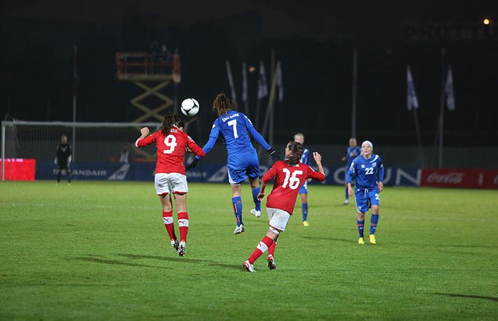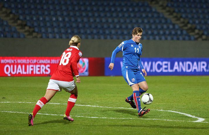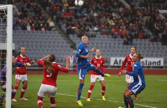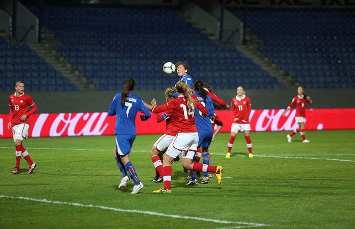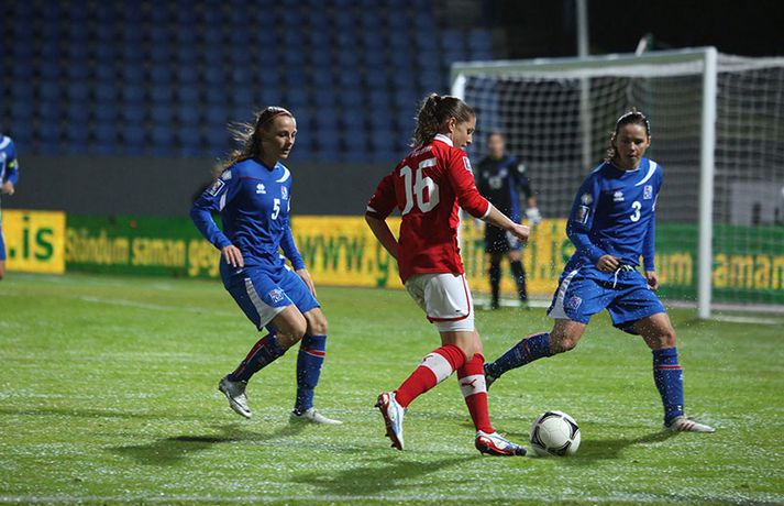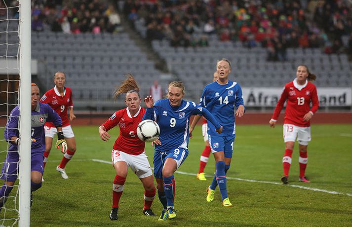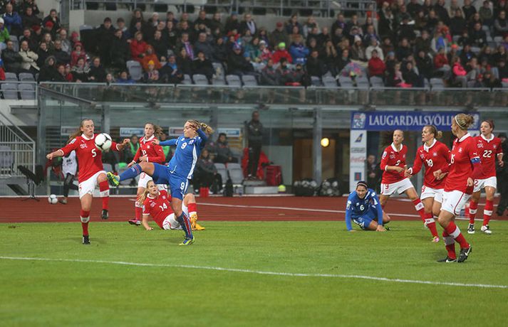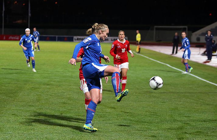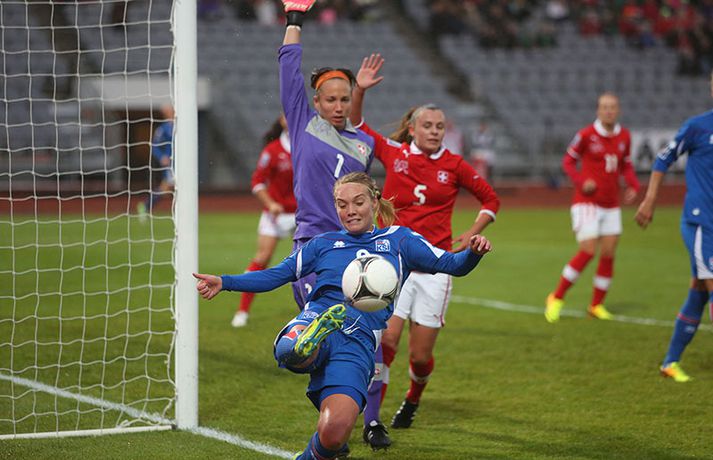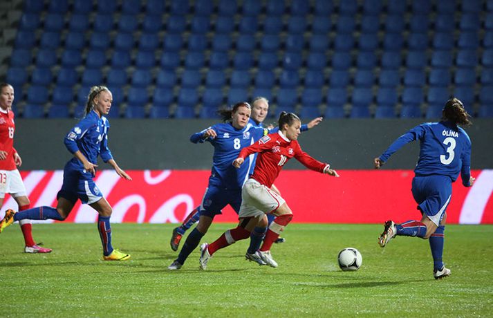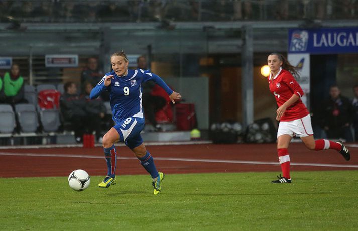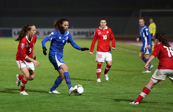 Íslenska kvennalandsliðið byrjar ekki vel undir stjórn Freys Alexanderssonar því liðið tapaði 0-2 á móti Sviss á Laugardalsvellinum í kvöld í fyrsta leik sínum í undankeppni HM 2015. Íslensku stelpurnar réðu ekkert við hápressu Sviss eða hina frábæru Ramonu Bachmann sem fór afar illa með íslensku varnarlínuna allan leikinn. Freyr færði leikmenn til í stöðum í byrjunarliðinu og hvort sem það var ástæðan eða einhver önnur þá náðu íslensku stelpurnar aldrei taktinum í þessum leik. Það er ljóst að svissneska liðið er gríðarlega sterkt og líklegt til afreka í þessum riðli en það eru vissulega mikil vonbrigði að íslensku stelprunar gátu ekki veitt þeim meiri keppni í þessum leik. Sviss vann fyrsta leikinn sinn 9-0 og fylgdi því eftir með góðum sigri í Laugardalnum. Liðið átti alltaf að geta skorað mörk en veikleikarnir áttu að liggja í varnarleiknum. Það reyndi bara aldrei almennilega á varnarlínu Svisslendinga því hápressan sá til þess að íslensku stelpurnar náðu aldrei að spila boltanum upp völlinn af einhverju viti. Ramona Bachmann, framherji Sviss, fór oft illa með íslenska liðið í fyrri hálfeikn með hraða sínum og leikni. Það var hún sem kom Sviss í 1-0 á 9. mínútu eftir að hafa skilið íslensku varnarmennina eftir í sporunum. Seinna í hálfleiknum fíflaði hún þrjá varnarmenn íslenska liðsins en skot hennar fór rétt framhjá. Íslenska liðið ógnaði aðeins í upphafi leiks án þess að ná alvöru skoti á markið og Katrín Jónsdóttir fékk einnig skallafæri eftir hornspyrnu en lengstum var íslenska liðið í tómum vandræðum með hápressu svissneska liðsins. Freyr Alexandersson gerði engar breytingar í hálfleik og svissneska liðið var áfram með öll völd á vellinum. Ramona Bachmann var búin að sprengja upp íslensku vörnina tvisvar sinnum þegar sprettur hennar riðlaði íslensku vörninni enn á ný. Það endaði með því að Glódís Perla varði boltann með hendi innan teigs og Sviss fékk vítaspyrnu. Lara Dickenmann skoraði af öryggi úr vítaspyrnunni. Freyr kallaði þá á Fanndísi Friðriksdóttur, tók Ólínu Guðbjörgu Viðarsdóttur útaf og færði Hallberu og Hólmfríði í sínar "venjulegu" stöður. Hólmfríður var fljót að leggja upp færi fyrir Dóru Maríu Lárusdóttur og stuttu seinna fiskaði hún gult spjald á bakvörð svissneska liðsins. Hólmfríður fékk þó bara sjö mínútur í "sinni" stöðu því hún varð að fara meidd af velli á 64. mínútu þá komin á appelsínugult spjald. Ramona Bachmann átti eftir að stríða íslensku vörninni nokkrum sinnum til viðbótar en GUðbjörg Gunnarsdóttir varði nokkrum sinnum mjög auk þess að íslenska liðið hafði heppnina með sér. Lokatölurnar urðu því 0-2 en þetta hefði getað endað miklu verr í kvöld enda yfirburðir svissneska liðsins miklir. Glódís: Vorum stressaðar á boltanum„Þetta var bara svekkjandi, við ætluðum okkur að gera mun betur í dag og vinna þennan leik en það gekk ekki upp í dag,“ sagði Glódís Perla Viggósdóttir að leik loknum. „Leikskipulagið þeirra kom okkur ekki á óvart, við vissum að þær myndu pressa hátt með tvo leikmenn og við ætluðum að leysa það betur. Okkur gekk hinsvegar illa að ráða við þessa pressu, við vorum stressaðar á boltanum á þungum velli og pressan þeirra gekk vel,“ Íslenska liðinu gekk illa að skapa sér færi og náðu varla að ógna marki gestanna í leiknum. „Þetta á ekki að vera svona, við eigum að geta brugðist betur við þessum aðstæðum. Við hefðum þurft að stíga upp fyrr og skora áður en þær skoruðu annað markið. Það var rosalega svekkjandi að fá það á sig, mér fannst þetta ekki vera víti.“ „Það voru jákvæðir punktar í leiknum hjá okkur, við förum núna inn í klefa og ræðum málin og reynum að bæta okkar leik fyrir næsta leik,“ sagði Glódís að lokum. Dóra: Við reynum að þrýsta á Katrínu„Við ætluðum okkur þrjú stig á heimavelli, við vissum að við værum að mæta góðu liði en voru betri en við bjuggumst við,“ sagði Dóra María Lárusdóttir eftir leikinn. „Þær voru með góða leikmenn í öllum stöðum svo þetta var erfitt. Við vorum undir í baráttunni og þrátt fyrir að koma vel undirbúnar náðum við ekki að pressa þær nægilega vel,“ Skipulag íslenska liðsins gekk illa í leiknum og var fátt um fína drætti í sóknarleik liðsins. „Þótt völlurinn hafi verið okkur erfiður var hann ekki erfiður fyrir þær svo það þarf að skoða hvað fór úrskeiðis. Við náðum ekki að skapa okkur nóg af færum og misstum boltann of oft,“ Ramona Bachmann reyndist íslenska liðinu erfið, hún skoraði eitt mark og var sífellt ógnandi íslenska liðinu. „Við getum alveg unnið þetta lið en þær eru með gríðarlega öfluga framlínu og Ramona fór á kostum í dag,“ Katrín Jónsdóttir spilaði í kvöld sinn síðasta leik fyrir íslenska landsliðið og kveður Dóra hana með söknuði. „Það eru forréttindi að fá að spila með henni, hún er gæðaleikmaður og frábær karakter og það verður erfitt að sjá á eftir henni. Það er leiðinlegt að seinustu tveir leikir hennar hafi verið tapleikir en svona er þetta. Við stelpurnar verðum að reyna að þrýsta á hana að halda áfram, maður sendir henni línu á Facebook,“ sagði Dóra létt í lokin.Dóra María í leiknum í kvöld.Úr leiknum í kvöld.