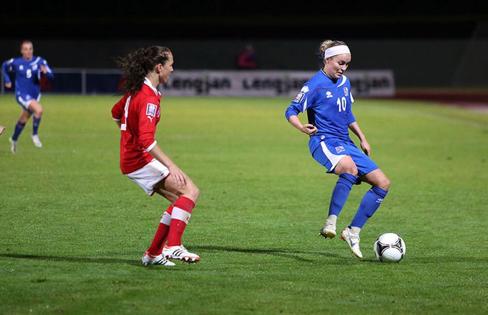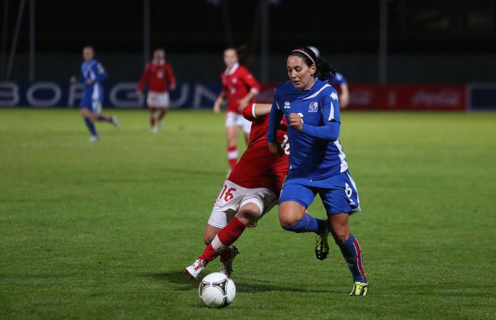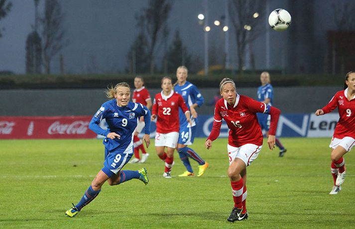 Umfjöllun, viðtöl, einkunnir og myndir: Ísland - Sviss 0-2 Óskar Ófeigur Jónsson á Laugardalsvellinum skrifar 26. september 2013 15:42 Margrét Lára á ferðinni í kvöld. Mynd/Daníel Íslenska kvennalandsliðið byrjar ekki vel undir stjórn Freys Alexanderssonar því liðið tapaði 0-2 á móti Sviss á Laugardalsvellinum í kvöld í fyrsta leik sínum í undankeppni HM 2015. Íslensku stelpurnar réðu ekkert við hápressu Sviss eða hina frábæru Ramonu Bachmann sem fór afar illa með íslensku varnarlínuna allan leikinn. Freyr færði leikmenn til í stöðum í byrjunarliðinu og hvort sem það var ástæðan eða einhver önnur þá náðu íslensku stelpurnar aldrei taktinum í þessum leik. Það er ljóst að svissneska liðið er gríðarlega sterkt og líklegt til afreka í þessum riðli en það eru vissulega mikil vonbrigði að íslensku stelprunar gátu ekki veitt þeim meiri keppni í þessum leik. Sviss vann fyrsta leikinn sinn 9-0 og fylgdi því eftir með góðum sigri í Laugardalnum. Liðið átti alltaf að geta skorað mörk en veikleikarnir áttu að liggja í varnarleiknum. Það reyndi bara aldrei almennilega á varnarlínu Svisslendinga því hápressan sá til þess að íslensku stelpurnar náðu aldrei að spila boltanum upp völlinn af einhverju viti. Ramona Bachmann, framherji Sviss, fór oft illa með íslenska liðið í fyrri hálfeikn með hraða sínum og leikni. Það var hún sem kom Sviss í 1-0 á 9. mínútu eftir að hafa skilið íslensku varnarmennina eftir í sporunum. Seinna í hálfleiknum fíflaði hún þrjá varnarmenn íslenska liðsins en skot hennar fór rétt framhjá. Íslenska liðið ógnaði aðeins í upphafi leiks án þess að ná alvöru skoti á markið og Katrín Jónsdóttir fékk einnig skallafæri eftir hornspyrnu en lengstum var íslenska liðið í tómum vandræðum með hápressu svissneska liðsins. Freyr Alexandersson gerði engar breytingar í hálfleik og svissneska liðið var áfram með öll völd á vellinum. Ramona Bachmann var búin að sprengja upp íslensku vörnina tvisvar sinnum þegar sprettur hennar riðlaði íslensku vörninni enn á ný. Það endaði með því að Glódís Perla varði boltann með hendi innan teigs og Sviss fékk vítaspyrnu. Lara Dickenmann skoraði af öryggi úr vítaspyrnunni. Freyr kallaði þá á Fanndísi Friðriksdóttur, tók Ólínu Guðbjörgu Viðarsdóttur útaf og færði Hallberu og Hólmfríði í sínar "venjulegu" stöður. Hólmfríður var fljót að leggja upp færi fyrir Dóru Maríu Lárusdóttur og stuttu seinna fiskaði hún gult spjald á bakvörð svissneska liðsins. Hólmfríður fékk þó bara sjö mínútur í "sinni" stöðu því hún varð að fara meidd af velli á 64. mínútu þá komin á appelsínugult spjald. Ramona Bachmann átti eftir að stríða íslensku vörninni nokkrum sinnum til viðbótar en GUðbjörg Gunnarsdóttir varði nokkrum sinnum mjög auk þess að íslenska liðið hafði heppnina með sér. Lokatölurnar urðu því 0-2 en þetta hefði getað endað miklu verr í kvöld enda yfirburðir svissneska liðsins miklir. Glódís: Vorum stressaðar á boltanum„Þetta var bara svekkjandi, við ætluðum okkur að gera mun betur í dag og vinna þennan leik en það gekk ekki upp í dag,“ sagði Glódís Perla Viggósdóttir að leik loknum. „Leikskipulagið þeirra kom okkur ekki á óvart, við vissum að þær myndu pressa hátt með tvo leikmenn og við ætluðum að leysa það betur. Okkur gekk hinsvegar illa að ráða við þessa pressu, við vorum stressaðar á boltanum á þungum velli og pressan þeirra gekk vel,“ Íslenska liðinu gekk illa að skapa sér færi og náðu varla að ógna marki gestanna í leiknum. „Þetta á ekki að vera svona, við eigum að geta brugðist betur við þessum aðstæðum. Við hefðum þurft að stíga upp fyrr og skora áður en þær skoruðu annað markið. Það var rosalega svekkjandi að fá það á sig, mér fannst þetta ekki vera víti.“ „Það voru jákvæðir punktar í leiknum hjá okkur, við förum núna inn í klefa og ræðum málin og reynum að bæta okkar leik fyrir næsta leik,“ sagði Glódís að lokum. Dóra: Við reynum að þrýsta á Katrínu„Við ætluðum okkur þrjú stig á heimavelli, við vissum að við værum að mæta góðu liði en voru betri en við bjuggumst við,“ sagði Dóra María Lárusdóttir eftir leikinn. „Þær voru með góða leikmenn í öllum stöðum svo þetta var erfitt. Við vorum undir í baráttunni og þrátt fyrir að koma vel undirbúnar náðum við ekki að pressa þær nægilega vel,“ Skipulag íslenska liðsins gekk illa í leiknum og var fátt um fína drætti í sóknarleik liðsins. „Þótt völlurinn hafi verið okkur erfiður var hann ekki erfiður fyrir þær svo það þarf að skoða hvað fór úrskeiðis. Við náðum ekki að skapa okkur nóg af færum og misstum boltann of oft,“ Ramona Bachmann reyndist íslenska liðinu erfið, hún skoraði eitt mark og var sífellt ógnandi íslenska liðinu. „Við getum alveg unnið þetta lið en þær eru með gríðarlega öfluga framlínu og Ramona fór á kostum í dag,“ Katrín Jónsdóttir spilaði í kvöld sinn síðasta leik fyrir íslenska landsliðið og kveður Dóra hana með söknuði. „Það eru forréttindi að fá að spila með henni, hún er gæðaleikmaður og frábær karakter og það verður erfitt að sjá á eftir henni. Það er leiðinlegt að seinustu tveir leikir hennar hafi verið tapleikir en svona er þetta. Við stelpurnar verðum að reyna að þrýsta á hana að halda áfram, maður sendir henni línu á Facebook,“ sagði Dóra létt í lokin.Dóra María í leiknum í kvöld.Úr leiknum í kvöld. Fótbolti Íslenski boltinn Tengdar fréttir Margrét Lára um Ramonu Bachmann: Hún hreyfir sig eins og strákur Svisslendingurinn Ramona Bachmann sýndi heldur betur snilli 