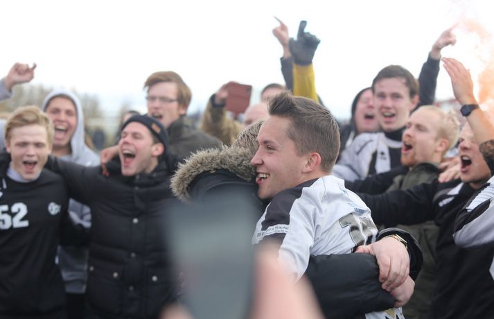 Skortur á unglingastarfi hamlar þátttöku KV í 1. deildinni Óskar Ófeigur Jónsson skrifar 23. september 2013 17:58 Liðsmenn KV fagna hér sæti í 1. deildinni. Mynd/Daníel Knattspyrnufélag Vesturbæjar, KV, tryggði sér sæti í 1. deild karla í fótbolta um helgina þegar liðið varð í öðru sæti í 2. deildinni en KV og HK unnu sér þá sæti í 1. deildinni. Það eru talsverðar kröfur settar á félög sem spila í 1. deild og þurfa þau öll að standast leyfiskerfi KSÍ. KV hefur spilað heimaleiki sína á gervigrasvelli KR-inga sem er ekki löglegur völlur samkvæmt leyfiskerfinu en KV-menn þurfa samt að hafa meiri áhyggjur af því að vera ekki með unglingastarf. KV gæti fengið undanþágu til að leika áfram á gervigrasinu ef lögð verður fram framkvæmdaáætlun og það er því skortur á unglingastarfi sem fyrst og fremst hamlar þátttöku KV í 1. deildinni. Liðin í 1. deild karla þurfa að vera með skriflega áætlun um knattspyrnulegt uppeldi frá níu ára aldri sem KSÍ hefur samþykkt og starfrækja að minnsta kosti fjögur unglingalið hjá félaginu þar af eitt fyrir aldurinn tíu ára og yngri og tvö á aldrinum 11 til 14 ára. „Við höfum verið að fagna um helgina og það sem við förum í núna er að skoða þessi mál. Það þarf enginn að hafa áhyggjur. Við erum rosalega metnaðarfullir og störfum faglega. Það eru fleiri mánuðir í að þetta hefjist og við munum leysa þetta með KSÍ. Við höfum engar áhyggjur," segir Björn Berg Gunnarsson, framkvæmdastjóra KV, í viðtali á vefsíðunni fótbolti.net en hann segir þar íslenska knattspyrnu vera að breytast. „Umræðan í borginni er öll um það að sameina eigi íþróttafélög. Ef það á að gera kröfur um að þriðji aðilinn komi inn með yngri flokka í samkeppni við KR og Gróttu er það algjörlega galið. Ég hef ekki nokkra trú á öðru en að þetta verði bara leyst í sameiningu með KSÍ," sagði Björn Berg en það má sjá alla umfjöllun fótbolta.net um málið með því að smella hér. Íslenski boltinn Mest lesið Sjáðu brot af því besta úr enska boltanum í dag Fótbolti „Gott að við gátum verið liðið sem kláraði þetta“ Körfubolti Erfitt kvöld fyrir Ármann og Tindastól Körfubolti Liverpool loks á sigurbraut á ný Enski boltinn Juventus landaði sigri í fyrsta leik Spalletti Fótbolti Tvöföld tvenna Tryggva í tæpu tapi Körfubolti Harma rasíska og transfóbíska grein liðsfélaga Sveindísar Fótbolti Andri Lucas var kóngurinn á King Power í dag Enski boltinn Uppgjörið: Valur - KR | 93-100 | KR hafði betur í slag Reykjavíkurstórveldanna Körfubolti Valencia engin fyrirstaða fyrir Real Madrid Fótbolti Fleiri fréttir Pablo og Óskar Örn inn í þjálfarateymi Hauka FH-ingar kveðja Kjartan Henry Tölur úr Bestu: Bjartur Bjarmi fór í flestar tæklingar af öllum Gísli semur við Skagamenn Óskar Smári tekur við Stjörnunni Bretinn ráðinn tæknilegur ráðgjafi hjá Val Fram þvertekur fyrir metnaðarleysi og leitar að nýjum þjálfurum Tölur úr Bestu: Hallgrímur Mar bjó til langflest færi „Mjög sáttur með samninginn“ „Hefði séð eftir því alla ævi“ Magnús Már í viðræðum við HK Uppgjörið: Ísland - Norður-Írland 3-0 | Áfram hluti af elítunni Tölur úr Bestu 2025: Klúðraði langflestum dauðafærum í sumar FH bíður með að tilkynna nýjan þjálfara Óskar Hrafn fer ekki fet Birnir frá Akureyri í Garðabæ Hættir með Fram Heimir kynntur til leiks í Árbænum Túfa rekinn frá Val Leyndarmáli ljóstrað upp þegar Heimir og Björn kvöddu Leikmenn kusu Patrick og Guðmund Sjáðu bananabombu Antons Loga og önnur síðustu mörk tímabilsins Uppgjörið: Stjarnan - Breiðablik 2-3 | Stjarnan í Evrópu þrátt fyrir tap „Held að ég geti ekki gert mikið meira“ Uppgjörið: Vestri - KR 1-5 | KR bjargaði sér og sendi Vestra í Lengjudeildina Uppgjörið: ÍA - Afturelding 1-0 | Afturelding staldraði stutt við í efstu deild Uppgjörið: Víkingur - Valur 2-0 | Meistararnir klára tímabilið með stæl Uppgjörið: ÍBV - KA 3-4 | KA tryggði sér Forsetabikarinn þriðja árið í röð Ráðast örlög Aftureldingar inni í höll? „Þetta verður bara veisla fyrir vestan“ Sjá meira