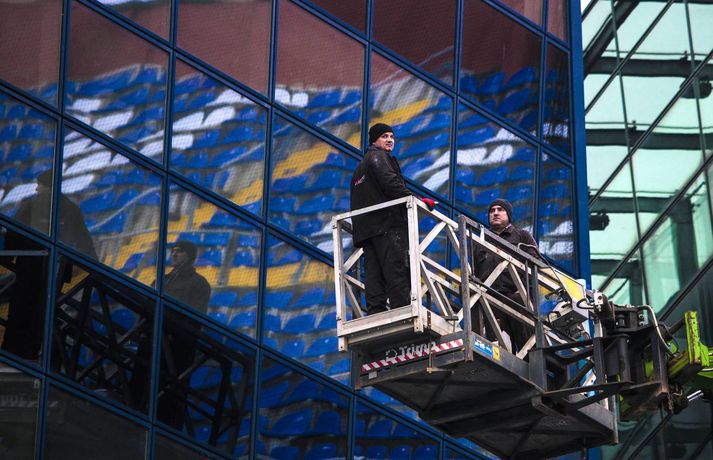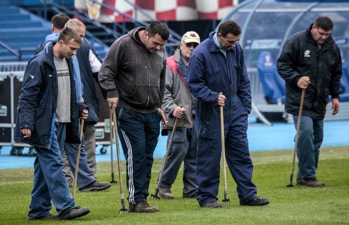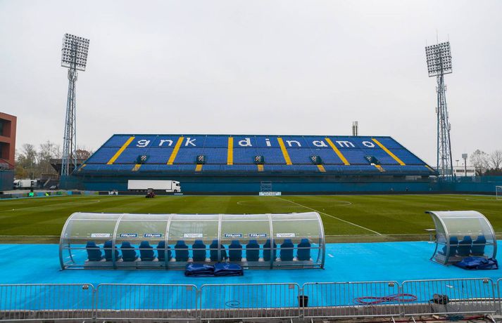 Íslenskir blaðamenn hafa verið við störf á Maksimir-leikvanginum í Zagreb í dag. Leikvangurinn er rúmlega aldargamall og margt áhugavert að sjá. Stúkur eru á öllum endum vallarins en þær passa ekkert sérstaklega vel saman. Þá eru engin þök yfir stúkunum en til samanburðar er þess krafist að öll lið í efstu deild karla á Íslandi spili heimaleiki sína á völlum með stúku með þaki. Hlaupabraut er svo allan hringinn. Króatíski blaðamaðurinn Aleksandar Holiga sagði í viðtali við Fréttablaðið á dögunum að leikvangurinn væri illa liðinn. „Við köllum leikvanginn ýmist þann ljótasta í Evrópu eða skömm Maksimir,“ segir Holiga en Maksimir er nafn á hverfinu í Zagreb þar sem má meðal annars finna stóran almenningsgarð og dýragarð auk leikvangsins. Í glugganum að ofan má sjá skemmtilegar myndir sem Vilhelm Gunnarsson, ljósmyndari Fréttablaðsins og Vísis, tók á leikvanginum í dag.Mynd/Vilhelm