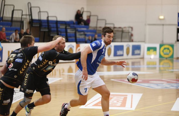 Fram vann Akureyri í æsispennandi leik í Safamýrinni í kvöld. Lokatölur urðu 23-22, en þetta er fjórði leikurinn af fjórum sem Framarar vinna á heimavelli í Olís-deildinni. Gestirnir frá Akureyri byrjuðu leikinn af miklum krafti og komust í 3-0 og þar af voru tvö mörk frá Kristjáni Orra úr vonlausum færum í horninu. Þá vöknuðu heimamenn og skoruðu þrjú mörk í röð. Liðin héldust nánast í hendur þangað til í stöðunni 5-5. Þá gáfu heimamenn í en náðu þó bara mest tveggja marka forystu. Akureyringar sýndu mikinn karakter í þessum leik og komu oft til baka. Það gerðu þeir í lok fyrri hálfleiks og Heimir Örn Árnason jafnaði metin í 10-10. Heimir skoraði tvö mörk í röð undir lok fyrri hálfleiks og átti eftir að reynast drjúgur. Gestirnir voru klaufar í lok fyrri hálfleiks og misstu Framara enn og aftur Fram úr sér. Staðan í hálfleik 13-10. Það virtist vera sem allur botn væri úr gestunum í byrjun síðari hálfleiks. Framarar náðu fimm marka forystu og Heimir Örn fékk fjórar mínútur. Fyrst tvær mínútur fyrir brot sem var afar vafasamur dómur og lét svo skapið hlaupa með sig í gönur og sparkaði í brúsa á hliðarlínunni. Það var Guðjón L. Sigurðsson eftirlitsdómari ekki sáttur með og lét dómarana gefa Heimi tvær mínútur í refsingu í viðbót. Við þetta vöknuðu Akureyringar og kom þvílík stemning í þeirra lið, samstaðan var mikil og söxuðu þeir hægt og rólega á heimamenn. Dramatíkin var mikil undir lokin og Bjarni Fritzson minnkaði muninn í eitt mark þegar ein mínúta var eftir með frábæru sirkusmarki. Framarar fóru í sókn og misstu boltann og gestirnir héldu í sókn. Heimir Örn lék þá á Garðar B. Sigurjónsson og virtist vera fara komast auðveldlega í gegn þegar Garðar greip í hann og Heimir féll. Dómarar leiksins dæmdu hins vegar bara aukakast um leið og flautan gall við litla hrifningu gestanna. Bjarni Fritzson tók aukakastið, en Stephan varði frá honum. Stefán Baldvin var markahæstur í liði gestanna með fimm mörk, en hann skoraði mörg mikilvæg mörk og átti virkilega góðan leik. Sigfús Páll og Garðar Sigurjónsson komu næstir með fjögur mörk. Í markinu varði Stephan Nielsen tíu skot. Bjarni Fritzson var frábær í liði Akureyrar, þá sérstaklega í síðari hálfleik og steig upp, en hann skoraði fimm mörk. Heimir Örn Árnason og Kristján Orri skoruðu fjögur mörk. Jovan Kukobat átti fínan leik í markinu og varði þrettán skot. Heimir Örn: Menn hlógu að því að ekki var dæmt víti„Þetta er mikið svekkelsi að fá ekki víti þarna í lokin. Menn eins og Siffi (Sigfús Páll Sigfússon, leikmaður Fram) eru hlæjandi hérna að hann hafi ekki dæmt víti. Hann lét löppina og sparkaði henni bara undan mér. Ég var búinn að finta Garðar hérna upp úr skónum og bara ótrúlegt. En í heildina dæmdu þeir mjög vel og mjög ánægður með þá. Bara besta dómgæsla sem ég hef séð lengi," sagði Heimir Örn Árnason, spilandi þjálfari Akureyrar, við Vísi að leik loknum. „Við klikkuðum á of mörgum færum í fyrri hálfleik. Við vorum ekki að leysa einfaldlega júgga-hreyfingu hjá þeim og Svenni og Elías voru að valda okkur smá usla. Í heildina var þetta ágætis leikur." „Ég sé eigilega ekkert jákvætt eftir að hafa tapað þessum leik. Ég er bara ómyrkur í máli núna. Ég trúi ekki að ég hafi ekki fengið stig. Ég trúi ekki heldur að ég hafi ekki fengið víti, en ég vil taka það aftur fram - þeir dæmdu mjög vel," sagði Heimir að lokum. Stefán Baldvin: Auðvitað vill Heimir fá víti„Frábær tvö stig. Rosalega ánægður með stigin tvö. Ég var ánægðastur með baráttuna og að við hættum aldrei. Náðum góðri forystu og áttum að klára leikinn á tímabili þarna í síðari hálfleik, þeir saxa á okkur en við náðum að kreista út sigur," sagði Stefán við Vísi eftir leik. Aðspurður um hvað honum hafi fundist um atriðið undir lokin þegar gestirnir vildu fá víti: „Heimir vill auðvitað fá víti. Þetta var klárlega aukakast," sagði Stefán og glotti. „Dómararnir byrjuðu mjög vel og svo komu nokkrir svona vafadómar í síðari hálfleik. Ég held ekki að það hafi hallað á annað liðið, en það er erfitt að segja svona strax eftir leik." „Ég er virkilega ánægður og við þurfum að halda áfram. Við eigum HK í næsta leik og þurfum að fá sigur þar. Við getum spilað betur en í dag og höfum verið að gera það og þurfum að ná því upp aftur," sagði Stefán kampakátur eftir leik.