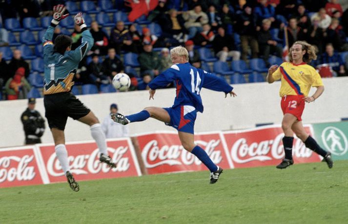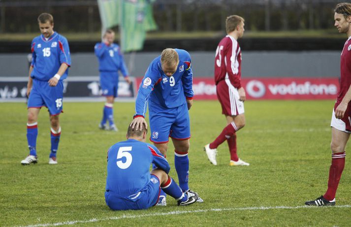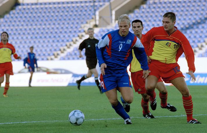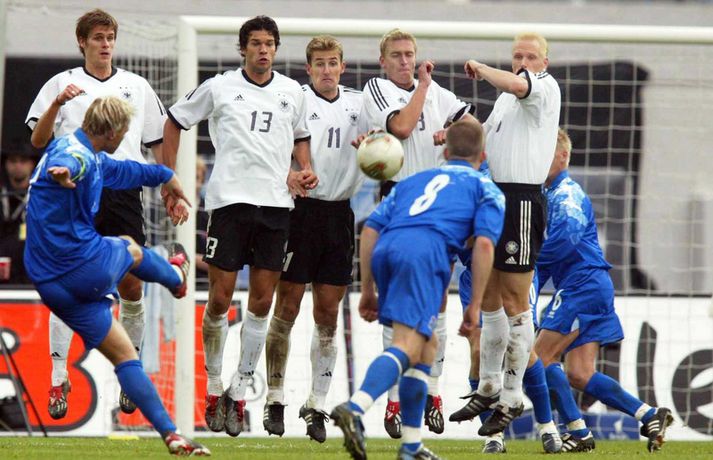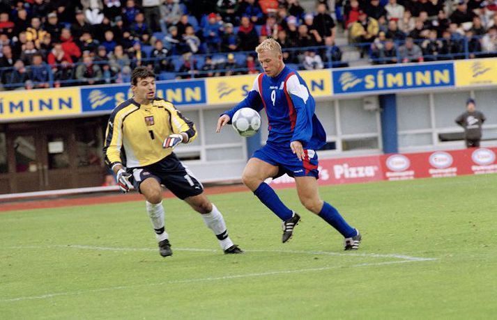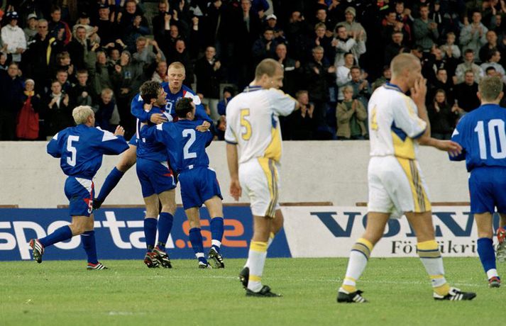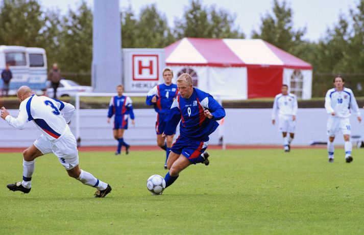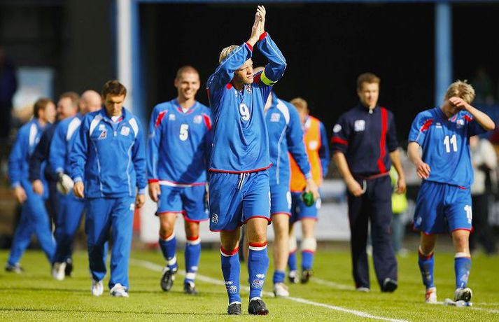 Á þriðjudagskvöldið voru liðin 17 ár, 6 mánuðir og 26 dagar síðan Eiður Smári Guðjohnsen spilaði sinn fyrsta A-landsleik og það er hætt við því að íslenska þjóðin hafi klökknað með honum þegar hann brotnaði niður í beinni sjónvarpsútsendingu og tilkynnti að hann væri búinn að spila sinn síðasta landsleik. Það er samt við hæfi að Eiður Smári hætti með landsliðinu á hæsta stalli í sögu þess þótt markmiðið hafi alltaf verið að enda landsliðsferilinn á HM í Brasilíu næsta sumar. Hann lokaði dyrunum á landsliðsferlinum samt með sviðsljós heimsins á sér en allur heimurinn fylgdist með hvort litla Íslandi tækist að setja heimsmet og komast á HM alveg eins og heimurinn fylgdist með sögulegri stundi í Eistlandi á síðustu öld þegar feðgarnir Eiður Smári og Arnór Guðjohnsen spiluðu næstum því saman með íslenska landsliðinu. Eiður Smári kveður landsliðið sem langmarkahæsti landsliðsmaður sögunnar. Hann bætti markamet Ríkharðs Jónssonar á endanum um sjö mörk og er kominn upp í fjórða sætið yfir leikjahæstu landsliðsmenn Íslands enda kominn með 78 A-landsleiki á ferilskrána. Eiður Smári upplifði vissulega hæðir og lægðir með íslenska landsliðinu en hann var í liðinu á þremur góðæristímum – í frábæru gengi liðsins undir stjórn Guðjóns Þórðarsonar, sigursælu liði sumarið 2003 undir stjórn Ásgeirs Sigurvinssonar og Loga Ólafssonar og loks hjálpaði hann framtíðarlandsliði Íslands alveg að þröskuldi þess að komast á sitt fyrsta stórmót. Það er af nógu að taka af frábærum stundum Eiðs Smára með íslenska landsliðinu en hér á síðunni smá sjá tíu magnaðar stundir frá mögnuðum landsliðsferli. Það þarf síðan mikið til að taka Eið Smára af stallinum sem besta landsliðsmann Íslands frá upphafi.1. 24. apríl 1996, Tallinn í Eistlandi Eiður Smári kemur inn á sem varamaður fyrir föður sinn í 3-0 sigri á Eistlandi. Þeir áttu að fá að byrja saman í næsta leik en það varð aldrei að því þar sem Eiður Smári meiddist mjög illa á ökkla í unglingalandsleik í maí og Arnór Guðjohnsen spilaði sinn síðasta landsleik árið eftir.2. 4. september 1999, Laugardalsvöllur Annar landsleikurinn og sá fyrsti eftir ökklabrotið í maí 1996, 40 mánuðum áður. Eiður Smári kemur inn á sem varamaður á 75. mínútu og skorar sitt fyrsta landsliðsmark á lokamínútunni þegar hann skallar inn fyrirgjöf frá Bjarna Guðjónssyni.3. 16. ágúst 2000, Laugardalsvöllur Fyrsti landsleikur Eiðs Smára í byrjunarliði A-landsliðsins. Ísland vinnur Svía 2-1, sinn fyrsta sigur á Svíum í 49 ár eða frá 4-3 sigri á Svíþjóð á Melavellinum 1951. Eiður Smári fiskar vítið sem ræður úrslitum en Helgi Sigurðsson skoraði sigurmarkið úr vítaspyrnunni.4. 16. október 2002, Laugardalsvöllur Eiður Smári skorar tvö mörk í 3-0 sigri á Litháum og komu þau bæði í seinni hálfleiknum. Hann fékk tækifæri til að skora þrennu eftir að hafa verið felldur í vítateignum tveimur mínútum fyrir leikslok. Eiður Smári skaut hins vegar hátt yfir mark Litháa úr spyrnunni.5. Sumarið 2003 á Laugardalsvelli, í Vilnius og í Þórshöfn Íslenska landsliðið vinnur þrjá fyrstu leiki sína eftir að Eiður Smári fær fyrirliðabandið. Liðið vinnur 2-1 sigur á Færeyjum bæði á Laugardalsvelli og í Þórshöfn og í millitíðinni vinnur liðið 3-0 sigur út í Litháen. Þetta var í fyrsta sinn sem Ísland vinnur þrjá leiki í röð í keppni. Eiður Smári skorar tvö mörk í þessum leikjum og leggur upp önnur þrjú.6. 18. ágúst 2004, Laugardalsvöllur Eiður Smári skorar fyrra markið í 2-0 sigri á Ítölum fyrir framan 20.204 áhorfendur en þetta áhorfendamet stendur enn þann daginn í dag. Eiður skoraði þarna framhjá Gianlugi Buffon en tæpum tveimur árum seinna urði Ítalir heimsmeistarar undir stjórn Marcello Lippi sem stjórnaði ítalska landsliðinu þarna í fyrsta sinn.7. 2. september 2006, Belfast Eiður Smári skorar þriðja markið í 3-0 útisigri á Norður-Írum í fyrsta leik Íslands í undankeppni EM 2008. Þetta var 17. landsliðsmark Eiðs Smára í hans 41. landsleik og hann jafnaði þar með markamet Ríkharðs Jónssonar sem hafði átti metið frá árinu 1947.8. 13. október 2007, Laugardalsvöllur Eiður Smári skorar tvö mörk í 2-4 tapi á móti Lettlandi og á nú markamet landsliðsins einsamall en hann hafði þá ekki skorað fyrir landsliðið í eitt ár og sex leikjum. Ríkharður Jónsson var ekki lengur á toppi listans en hann hafði þá verið markahæsti landsliðsmaður Íslands í 60 ár.9. 6. september 2008, Ósló Eiður Smári skorar stórglæsilegt mark beint úr aukaspyrnu og tryggir íslenska landsliðinu 2-2 jafntefli á móti Norðmönnum á Ullevaal-leikvanginum í fyrsta leiknum í undankeppni HM 2010. Eiður Smári var næstum því búinn að leggja upp sigurmarkið líka en Veigar Páll Gunnarsson átti þá skot í innanverða stöngina og út á 86. mínútu leiksins.10. 5. september 2009, Laugardalsvöllur Eiður Smári tryggir íslenska liðinu 1-1 jafntefli á móti Norðmönnum í undankeppni HM 2010 með fallegu skallamarki. Þetta var 60. landsleikur Eiðs Smára sem átti frábæran leik og 24. landsliðsmarkið hans. Eiður Smári skoraði ekki í síðustu 18 landsleikjum sínum.Uppklappið - Haustið 2013 á Laugardalsvelli, í Bern og í Osló Eiður Smári hjálpar ungu og upprennandi íslensku landsliði að ná sögulegum árangri með því að komast í fyrsta sinn í umspil um sæti á HM. Hann spilar byrjar fjóra af fimm síðustu leikjum liðsins í keppninni en síðasti landsleikurinn er 2-0 tapleikur á móti Króatíu í Zagreb.