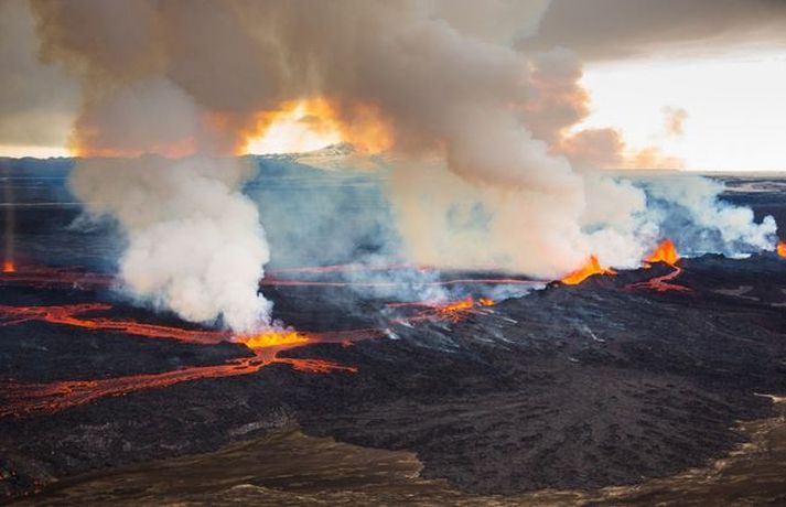 Vísbendingar eru um að kvikuflæðið undir Bárðarbungu sé að breytast og hafa GPS mælingar sýnt óreglulegar jarðskorpuhreyfingar síðustu daga. Þá sjást jafnframt óverulegar breytingar á vatnamælum. Þetta er meðal þess sem kom fram á reglulegum fundi Vísindamannaráðs almannavarna í morgun. Skjálftavirkni hefur verið nokkuð öflug síðastliðinn sólarhringinn en í gær mældust sjö skjálftar stærri en 3,0 í Bárðarbungu. Þeir stærstu voru 5,4 og 4,8 í gærkvöld. Smærri skjálftar mældust í Dyngjujökli og norðurhluta berggangsins. Sigið í ösku Bárðarbungu er með svipuðu móti og hefur verið, en hún sígur um 50 sentímetra á sólarhring. Búast má við gasmengun vestan og norðvestan gosstöðvanna í dag. Mengunarsvæðið nær vestur yfir Hofsjökul og norður að Skagafirði. morgun er búist við að mengunarsvæðið nái yfir Miðhálendið vestan og suðvestan gosstöðvanna. Ekki er hægt að útiloka að mengunarinnar verði vart á stærra svæði.visir/auðunnvisir/auðunn