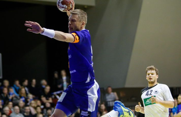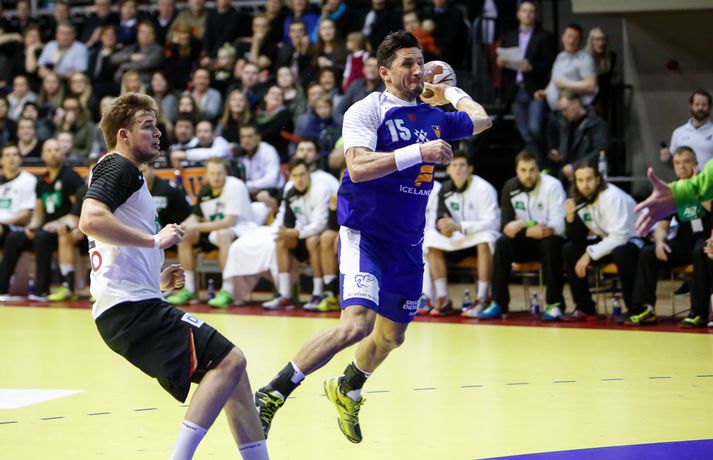 Umfjöllun, viðtöl og myndir: Ísland - Þýskaland 25-24 | Strákarnir kvöddu með sigri Guðmundur Marinó Ingvarsson í Laugardalshöllinni skrifar 5. janúar 2015 11:52 Snorri Steinn með boltann á Höllinni í kvöld. Vísir/Ernir Ísland vann sinn síðasta heimaleik fyrir HM í Katar með því að leggja lærisveina Dags Sigurðssonar í þýska landsliðinu að velli með minnsta mun.Ernir Eyjólfsson, ljósmyndari Fréttablaðsins og Vísis, var í Laugardalshöllinni í kvöld og tók myndirnar sem fylgja umfjölluninni. Eftir flotta byrjun datt botninn úr leik liðsins en strákarnir héldu þó jafnri stöðu eftir fyrri hálfleik, 12-12. Strákarnir byrjuðu svo síðari hálfleikinn vel og héldu undirtökunum allt til loka, þrátt fyrir æsispennandi lokamínútur. Alexander Petersson og Sigurbergur Sveinsson voru markahæstu menn Íslands með fimm mörk hvor en Sigurbergur átti fína sprett í leiknum, eins og fleiri. Vörn íslenska liðsins var svo lengi vel góð. Sigurbergur Sveinsson, Kári Kristján Kristjánsson og Aron Rafn Eðvarðsson fengu tækifærið í byrjunarliði Íslands og viðeigandi að Íslandi hafi komist yfir með marki Kára eftir línusendingu Sigurbergs. Aron byrjaði að tefla fram 6-0 vörninni sem hélt vel í upphafi leiks. Strákarnir komust í 10-6 forystu með flottum sóknarleik þar sem vinstri vængurinn var að gefa mun betur af sér en í leik liðanna í gær. Þjóðverjar lentu einnig í vandræðum í undirtölu og strákarnir refsuðu Degi Sigurðssyni, þjálfara þýska liðsins, fyrir að taka Carsten Lichtlein úr þýska markinu í sóknunum sínum með því að skora tvívegis í autt markið eftir að hafa unnið boltann.vísir/ernirSóknarleikurinn hrundi svo á síðustu tíu mínútum fyrri hálfleiksins og leikur Íslands um leið. Þjóðverjar gengu á lagið, skoruðu fimm mörk í röð og komust yfir. Alexander og Arnór komu íslensku sókninni aftur í gang og staðan í hálfleik var 12-12. Eftir smá hikst í upphafi síðari hálfleiks fór allt á fullt skrið hjá Íslandi. Alexander hélt uppteknum hætti og Björgvin Páll kom sér vel í gang fyrir aftan fína vörn Íslands og varði tvö vítaköst þar að auki. Strákarnir komust í 17-13 forystu en eftir að Sverre fékk brottvísun náðu Þjóðverjar að svara með þremur mörkum í röð. Það kom meiri ákefð í leikmenn eftir því sem leið á leikinn og riðlaðist skipulagið nokkuð í takt við það. Það var þó ágætt í íslenska liðinu þegar strákarnir fengu tækifæri til að stilla upp og þeir héldu áfram undirtökunum í leiknum og voru með forystu, 21-19, þegar tæpar tólf mínútur voru eftir. Þrátt fyrir að gestirnir skoruðu næstu tvö mörkin í leiknum létu okkar menn ekki slá sig út af laginu og náðu aftur undirtökunum. Þjóðverjar héldu spennu í leiknum með því að nýta sér mistök Ásgeirs Arnar sem kastaði boltanum frá sér í tvígang. Sigurbergur kom svo Íslandi yfir þegar rúm mínúta var eftir en það var hans þriðja mark í röð í leiknum. Björgvin Páll tryggði svo íslenskan sigur þegar hann varð skot Patrick Wiencek á lokasekúndunum. Sigurbergur: Var afslappaðari í kvöldvísir/ernir„Mér leið betur í dag en í gær. Það þurfti einn leik til að hrista úr sér jólin og áramótin,“ sagði Sigurbergur Sveinsson sem átti góðan leik fyrir Ísland í kvöld. „Við höfum náð fáum æfingum og mér leið einfaldlega betur í kvöld. Þetta var aðallega hugarfarið í gær og mér leið ekkert sérstaklega vel yfir þessu. Ég var afslappaðari í kvöld og lét leikinn koma til mín. Það var betra flæði í þessu. „Þetta er skref hjá okkur. Þetta var betra í dag en í gær og vonandi verður þetta svona hjá okkur þangað til við komum til Katar,“ sagði Sigurbergur sem átti frábæra innkomu undir lokin á leiknum eftir stutta hvíld. „Það var gott að fá að pústa aðeins og koma aftur inn á. Ég náði að setjast á bekkinn og núllstilla þetta aðeins. Svo fékk ég góð færi. Lexi (Alexander Petersson) dregur mikið til sín. „Það er mikilvægt að geta nýtt breiddina og sérstaklega á svona móti eins og við erum að fara á. Það eru margir leikir á skömmum tíma og eins og handbolti er í dag þá ertu ekkert að fara að spila þetta á sjö, átta mönnum. Það er alveg á hreinu,“ sagði Sigurbergur. Bjarki Már: Mátti búast við vörninni sterkrivísir/ernir„Það er mikill léttir að hafa unnið hérna þó þetta skipti í rauninni engu máli. Það er alltaf gaman að vinna,“ sagði Bjarki Már Gunnarsson sem lék allan leikinn í vörn íslenska liðsins. „Leikurinn okkar hrundi í gær en í kvöld náðum við að halda dampi út báða hálfleikana. Við fengum mörg hraðaupphlaup í bakið en vörnin var að halda ágætlega. Markvarslan var góð. Það er lítið hægt að kvarta.“ Bjarki lék ýmist með Vigni Svavarsson eða Sverra Jakobsson sér við hlið í vörninni í kvöld. „Það er þvílíkt gaman að spila með þessum jöxlum. Maður verður bara að standa og fá áfram sénsinn. Ég ætla mér að vera þarna áfram. „Það mátti alveg búast við vörninni sterkri. Við höfum aðallega æft varnarleik á æfingum. Sóknarleikurinn á eftir að slípast. „Það er líka gott hvað markvarslan hefur verið stöðug. Þeir eru að taka bæði skot utan af velli og dauðafæri,“ sagði Bjarki. Ísland hefur æft 3-2-1 vörn en notaði hana ekkert í kvöld. „Við fengum í rauninni ekki tækifæri til þess. Við ætluðum að sjá til með að nota hana. Við förum yfir hana úti í staðin. Við höfum farið yfir vinnureglur og byrjað á þessu. Þetta er djörf vörn. „Það er alltaf gott að geta brotið upp leikinn og fengið andstæðinginn til að slútta snemma. 3-2-1 vörnin er til þess,“ sagði Bjarki Már. Arnór Þór: 