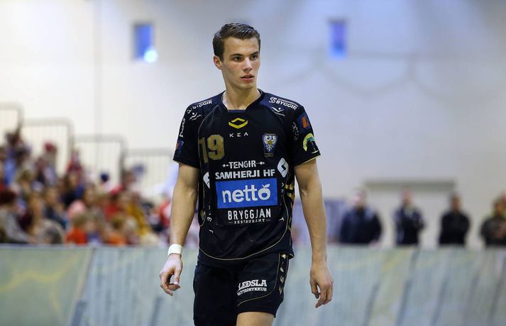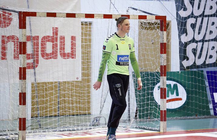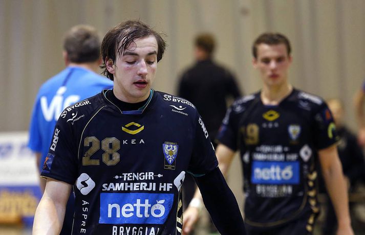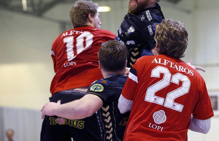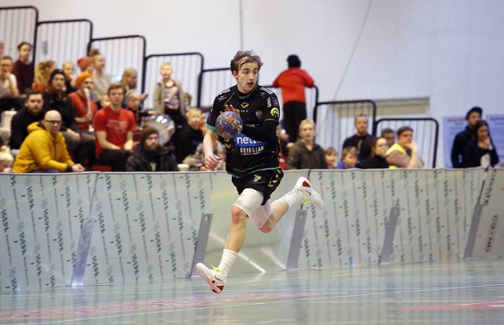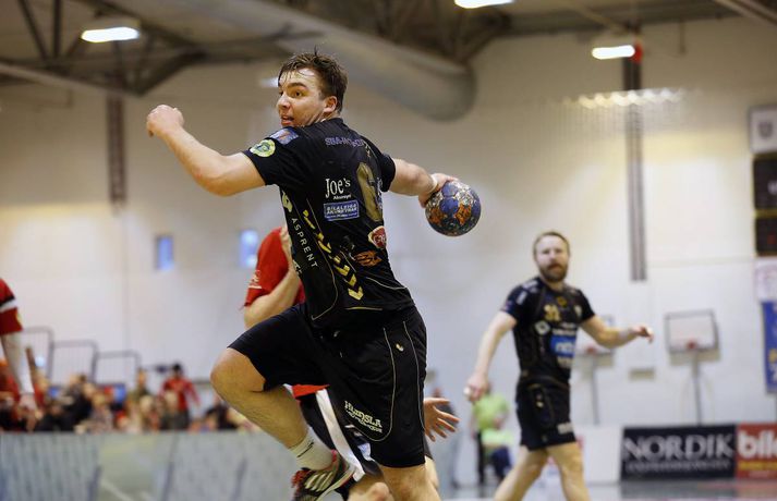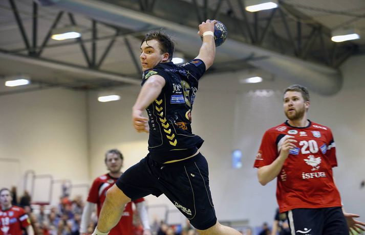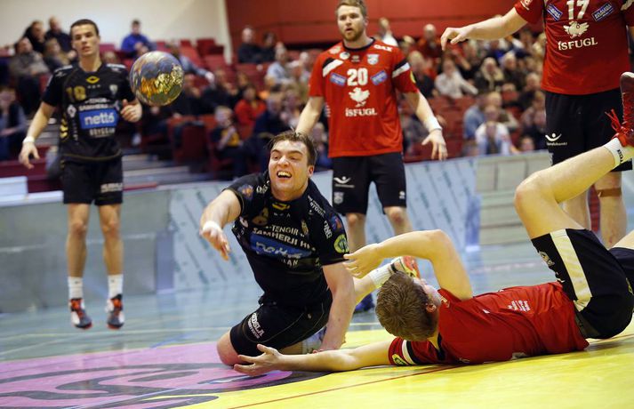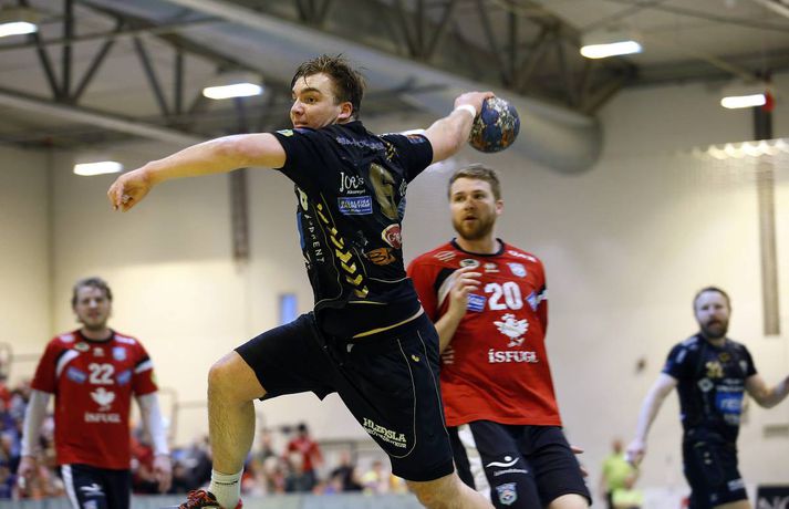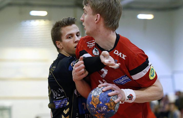 Árni Bragi Eyjólfsson var hetja Aftureldingar þegar liðið lagði Akureyri að velli, 27-26, í miklum spennuleik í N1-höllinni í Mosfellsbæ í 19. umferð Olís-deildar karla í dag. Lokamínútur leiksins voru gríðarlega spennandi. Gestirnir náðu þrívegis forystunni á síðustu fimm mínútum leiksins en tókst þrátt fyrir það ekki að halda inn stig. Ingimundur Ingimundarson kom Akureyri yfir, 25-26, þegar tvær mínútur en Örn Ingi Bjarkason jafnaði að bragi með sínu 10. marki í leiknum. Akureyringar töpuðu boltanum klaufalega í næstu sókn og í kjölfarið fékk Sverre Jakobsson 2ja mínútna brottvísun. Heimamenn opnuðu vinstra hornið fyrir Kristin Bjarkason en Hreiðar Levý Guðmundsson sá við honum. Mosfellingar héldu þó boltanum og opnuðu því næst hægra hornið fyrir Árna Braga Eyjólfsson. Honum urðu ekki á nein mistök, setti boltann í stöng og inn og tryggði sínum mönnum stigin tvö. Akureyringum tókst ekki að opna vörn Aftureldingar á þeim sekúndum sem eftir voru af leiknum og heimamenn fögnuðu sínum þriðja deildarsigri í jafn mörgum leikjum eftir vetrarfríið. Gestirnir að norðan byrjuðu leikinn betur og það var allt annað að sjá sóknarleik þeirra en í leik liðanna á fimmtudaginn. Boltinn gekk vel og Norðanmenn voru duglegir að opna hornin fyrir Heiðar Þór Aðalsteinsson og Kristján Orra Jóhannsson sem skoruðu sex af tólf mörkum liðsins í fyrri hálfleik. Afturelding komst 2-1 yfir eftir fjórar mínútur en þá kom frábær kafli hjá gestunum sem skoruðu sjö mörk gegn einu Aftureldingar. Gestirnir náðu tvívegis fimm marka forystu í fyrri hálfleik og voru með góð tök á leiknum. Uppstilltur sóknarleikur heimamanna var mjög stirður og í þau fáu skipti sem þeir náðu að spila sig í góð færi þá varði Tomas Olason oftar en ekki. Um miðjan fyrri hálfleikinn kom Jóhann Gunnar Einarsson inn á fyrir Birki Benediktsson, sem hafði skotið eintómum púðurskotum fram að því, og Frammarinn fyrrverandi breytti sóknarleik Mosfellinga sem fóru að saxa á forskot gestanna. Afturelding vann síðustu níu mínútur fyrri hálfleiks 6-2 og þegar liðin gengu til búningsherbergja var staðan jöfn, 12-12. Liðin héldust í hendur framan af seinni hálfleik en í stöðunni 17-16 fyrir heimamenn komu fjögur mörk frá Akureyringum í röð. Afturelding vann sinn hins vegar aftur inn í leikinn og náði að jafna, þökk sé frábæru framlagi frá Erni Inga, Jóhanni Gunnari og Pálmari Péturssyni sem varði 13 skot í marki heimamanna eftir að hann kom inn á í fyrri hálfleik. Lokamínútur voru svo æsispennandi og dramatískar í meira lagi eins og áður var lýst. Lokatölur 27-26, Aftureldingu í vil. Örn Ingi var markahæstur í liði Mosfellinga með tíu mörk eins og áður sagði. Jóhann Gunnar kom næstur með sjö mörk. Ingimundur Ingimundarson, Nicklas Selvig og Heiðar Þór Aðalsteinsson voru markahæstir í liði Akureyrar með fimm mörk hver. Tomas átti einnig góðan leik í markinu með 17 skot varin. Norðanmenn hafa aðeins fengið eitt stig af sex mögulegum eftir vetrarfríið en þrátt fyrir tapið í dag geta þeir tekið margt jákvætt út úr leiknum.Örn Ingi: Erum með tvo frábæra markmenn Örn Ingi Bjarkason átti frábæran leik þegar Afturelding bar sigurorð af Akureyri, 27-26, í miklum spennuleik í N1-höllinni í dag. Leikstjórnandinn skoraði tíu mörk í leiknum og átta mörk í leiknum gegn Norðanmönnum á fimmtudaginn. Það er því eðlilegt að spyrja hvort Örn vilji ekki spila við Akureyri í hverri einustu umferð? "Jú, þetta gengur vel hjá liðinu og gengur vel hjá mér. Mér líður mjög vel," sagði hann og hló. "Þeir eru með hörkuvörn og það var gaman að geta gert eitthvað af viti í þessum leikjum," sagði Örn en Mosfellingar voru lengi í gang í dag og lentu tvívegis fimm mörkum undir í fyrri hálfleik. "Við vorum mjög slakir í byrjun leiks og vorum bara ekki vaknaðir. Við virkuðum þungir og áhugalausir en náðum svo að koma varnarleiknum í lag og halda þeim í fáum mörkum. "Við það fengum við sjálfstraust í sóknarleiknum og svo kom þetta koll af kolli," sagði leikstjornandinn knái sem bar lof á markvörðinn Pálmar Pétursson sem varði vel eftir að hann kom inn á í fyrri hálfleik. "Við erum með tvo frábæra markmenn og þeir skipta sköpum í nánast hverjum leik."Kristján Orri: Mikil framför frá síðasta leik Kristján Orri Jóhannsson, hægri hornamaður Akureyrar, var súr í broti eftir tapið gegn Aftureldingu í dag. "Þetta er ógeðslegt. Þetta er grátlegt. Mér fannst við eiga allavega eitt stig skilið út úr þessum leik. En svona er boltinn, hann er stundum ósanngjarn," sagði Kristján sem skoraði fjögur mörk úr fimm skotum í dag. Þrátt fyrir vonda niðurstöðu spilaði Akureyri mun betur en í leiknum gegn Aftureldingu á fimmtudaginn þar sem liðið tapaði með fimm mörkum, 22-17. Kristján sá marga ljósa punkta í leik Norðanmanna í dag. "Þetta var mikil framför frá síðasta leik og það er mjög jákvætt. Mér fannst ekki koma langur lélegur kafli eins og hefur komið í síðustu þremur leikjum. "Grimmdin og áræðnin var til staðar allan tímann, sem er mjög gott, og með því áframhaldi munum við ná hala inn einhver stig," sagði Kristján sem var ánægður með sóknarleik Akureyrar í dag. "Sóknarleikurinn kom vel út og við getum byggt á því. Það var bara eitt mark sem skildi liðin að og það er erfitt að finna hvaða atriði urðu þess valdandi að við töpuðum," sagði Kristján að lokum.vísir/stefánvísir/stefán
