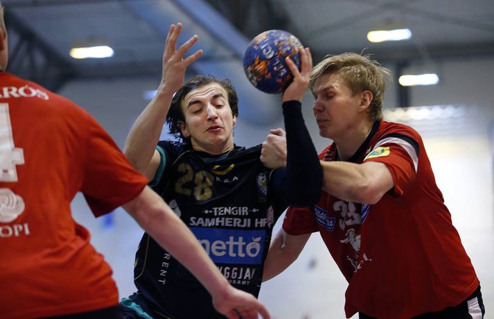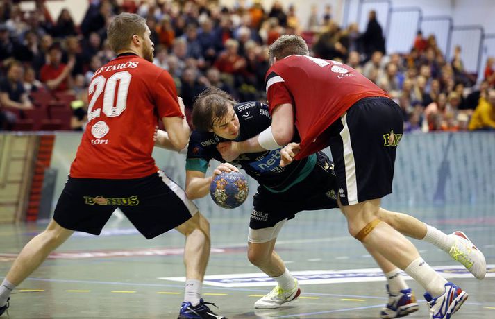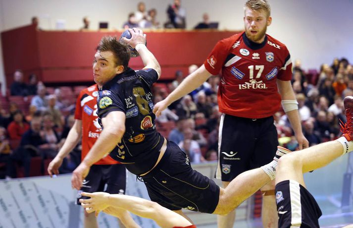 Umfjöllun, viðtöl og myndir: Afturelding - Akureyri 27-26 | Árni gerði engin mistök Ingvi Þór Sæmundsson að Varmá skrifar 15. febrúar 2015 12:47 Úr leik liðanna í dag. vísir/stefán Árni Bragi Eyjólfsson var hetja Aftureldingar þegar liðið lagði Akureyri að velli, 27-26, í miklum spennuleik í N1-höllinni í Mosfellsbæ í 19. umferð Olís-deildar karla í dag. Lokamínútur leiksins voru gríðarlega spennandi. Gestirnir náðu þrívegis forystunni á síðustu fimm mínútum leiksins en tókst þrátt fyrir það ekki að halda inn stig. Ingimundur Ingimundarson kom Akureyri yfir, 25-26, þegar tvær mínútur en Örn Ingi Bjarkason jafnaði að bragi með sínu 10. marki í leiknum. Akureyringar töpuðu boltanum klaufalega í næstu sókn og í kjölfarið fékk Sverre Jakobsson 2ja mínútna brottvísun. Heimamenn opnuðu vinstra hornið fyrir Kristin Bjarkason en Hreiðar Levý Guðmundsson sá við honum. Mosfellingar héldu þó boltanum og opnuðu því næst hægra hornið fyrir Árna Braga Eyjólfsson. Honum urðu ekki á nein mistök, setti boltann í stöng og inn og tryggði sínum mönnum stigin tvö. Akureyringum tókst ekki að opna vörn Aftureldingar á þeim sekúndum sem eftir voru af leiknum og heimamenn fögnuðu sínum þriðja deildarsigri í jafn mörgum leikjum eftir vetrarfríið. Gestirnir að norðan byrjuðu leikinn betur og það var allt annað að sjá sóknarleik þeirra en í leik liðanna á fimmtudaginn. Boltinn gekk vel og Norðanmenn voru duglegir að opna hornin fyrir Heiðar Þór Aðalsteinsson og Kristján Orra Jóhannsson sem skoruðu sex af tólf mörkum liðsins í fyrri hálfleik. Afturelding komst 2-1 yfir eftir fjórar mínútur en þá kom frábær kafli hjá gestunum sem skoruðu sjö mörk gegn einu Aftureldingar. Gestirnir náðu tvívegis fimm marka forystu í fyrri hálfleik og voru með góð tök á leiknum. Uppstilltur sóknarleikur heimamanna var mjög stirður og í þau fáu skipti sem þeir náðu að spila sig í góð færi þá varði Tomas Olason oftar en ekki. Um miðjan fyrri hálfleikinn kom Jóhann Gunnar Einarsson inn á fyrir Birki Benediktsson, sem hafði skotið eintómum púðurskotum fram að því, og Frammarinn fyrrverandi breytti sóknarleik Mosfellinga sem fóru að saxa á forskot gestanna. Afturelding vann síðustu níu mínútur fyrri hálfleiks 6-2 og þegar liðin gengu til búningsherbergja var staðan jöfn, 12-12. Liðin héldust í hendur framan af seinni hálfleik en í stöðunni 17-16 fyrir heimamenn komu fjögur mörk frá Akureyringum í röð. Afturelding vann sinn hins vegar aftur inn í leikinn og náði að jafna, þökk sé frábæru framlagi frá Erni Inga, Jóhanni Gunnari og Pálmari Péturssyni sem varði 13 skot í marki heimamanna eftir að hann kom inn á í fyrri hálfleik. Lokamínútur voru svo æsispennandi og dramatískar í meira lagi eins og áður var lýst. Lokatölur 27-26, Aftureldingu í vil. Örn Ingi var markahæstur í liði Mosfellinga með tíu mörk eins og áður sagði. Jóhann Gunnar kom næstur með sjö mörk. Ingimundur Ingimundarson, Nicklas Selvig og Heiðar Þór Aðalsteinsson voru markahæstir í liði Akureyrar með fimm mörk hver. Tomas átti einnig góðan leik í markinu með 17 skot varin. Norðanmenn hafa aðeins fengið eitt stig af sex mögulegum eftir vetrarfríið en þrátt fyrir tapið í dag geta þeir tekið margt jákvætt út úr leiknum.Örn Ingi: Erum með tvo frábæra markmenn Örn Ingi Bjarkason átti frábæran leik þegar Afturelding bar sigurorð af Akureyri, 27-26, í miklum spennuleik í N1-höllinni í dag. Leikstjórnandinn skoraði tíu mörk í leiknum og átta mörk í leiknum gegn Norðanmönnum á fimmtudaginn. Það er því eðlilegt að spyrja hvort Örn vilji ekki spila við Akureyri í hverri einustu umferð? "Jú, þetta gengur vel hjá liðinu og gengur vel hjá mér. Mér líður mjög vel," sagði hann og hló. "Þeir eru með hörkuvörn og það var gaman að geta gert eitthvað af viti í þessum leikjum," sagði Örn en Mosfellingar voru lengi í gang í dag og lentu tvívegis fimm mörkum undir í fyrri hálfleik. "Við vorum mjög slakir í byrjun leiks og vorum bara ekki vaknaðir. Við virkuðum þungir og áhugalausir en náðum svo að koma varnarleiknum í lag og halda þeim í fáum mörkum. "Við það fengum við sjálfstraust í sóknarleiknum og svo kom þetta koll af kolli," sagði leikstjornandinn knái sem bar lof á markvörðinn Pálmar Pétursson sem varði vel eftir að hann kom inn á í fyrri hálfleik. "Við erum með tvo frábæra markmenn og þeir skipta sköpum í nánast hverjum leik."Kristján Orri: Mikil framför frá síðasta leik Kristján Orri Jóhannsson, hægri hornamaður Akureyrar, var súr í broti eftir tapið gegn Aftureldingu í dag. "Þetta er ógeðslegt. Þetta er grátlegt. Mér fannst við eiga allavega eitt stig skilið út úr þessum leik. En svona er boltinn, hann er stundum ósanngjarn," sagði Kristján sem skoraði fjögur mörk úr fimm skotum í dag. Þrátt fyrir vonda niðurstöðu spilaði Akureyri mun betur en í leiknum gegn Aftureldingu á fimmtudaginn þar sem liðið tapaði með fimm mörkum, 22-17. Kristján sá marga ljósa punkta í leik Norðanmanna í dag. "Þetta var mikil framför frá síðasta leik og það er mjög jákvætt. Mér fannst ekki koma langur lélegur kafli eins og hefur komið í síðustu þremur leikjum. "Grimmdin og áræðnin var til staðar allan tímann, sem er mjög gott, og með því áframhaldi munum við ná hala inn einhver stig," sagði Kristján sem var ánægður með sóknarleik Akureyrar í dag. "Sóknarleikurinn kom vel út og við getum byggt á því. Það var bara eitt mark sem skildi liðin að og það er erfitt að finna hvaða atriði urðu þess valdandi að við töpuðum," sagði Kristján að lokum.vísir/stefánvísir/stefán Olís-deild karla Mest lesið Hetja Engl