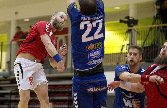 Haukar tóku forystuna í einvíginu við Val eftir stórsigur í fyrsta leik liðanna í undanúrslitum Olís-deildar karla í handbolta. Lokatölur 24-32, Hafnfirðingum í vil. Haukarnir höfðu mikla yfirburði og spiluðu líklega sinn besta leik í vetur.Stefán Karlsson, ljósmyndari Fréttablaðsins og Vísis, var í Vodafone-höllinni og tók myndirnar sem fylgja umfjölluninni. Sóknarleikurinn, sem hefur verið akkilesarhæll Hauka á undanförnum árum, gekk frábærlega, líkt og í einvíginu gegn FH. Árni Steinn Steinþórsson hélt uppteknum hætti frá því í FH-seríunni og skoraði fjögur af fyrstu sex mörkum Hauka sem komust í 1-6 eftir níu mínútna leik. Valsvörnin var heillum horfin og Haukarnir skoruðu hver markið á fætur öðru með skotum meðfram síðum varnarmanna Valsmanna. Stephen Nielsen átti erfitt uppdráttar í markinu og fyrir vikið hrönnuðust Haukamörkin upp. Varnarleikur Hauka var einnig mjög sterkur og dró tennurnar úr sóknarmönnum Vals, að frátöldum Elvari Friðrikssyni sem skoraði fimm af 10 mörkum Vals í fyrri hálfleik. Síðustu sekúndur fyrri hálfleiks voru lýsandi fyrir vandræði Vals. Eftir að Kári Kristján Kristjánsson minnkaði muninn í 10-18 af vítalínunni fékk Guðmundur Hólmar Helgason, fyrirliði Vals, að líta rauða spjaldið fyrir brot á Janusi Daða Smárasyni. Og til að bæta gráu ofan á svart skoraði Adam Haukur Baumruk með skoti beint úr aukakastinu sem dæmt var. Haukar leiddu því með níu mörkum í hálfleik gegn deildarmeisturunum, 10-19. Seinni hálfleikurinn var aldrei spennandi og í raun bara spurning hversu mikill munurinn á liðunum yrði. Haukarnir voru duglegir að láta reka sig út af í byrjun seinni hálfleiks en Valsmönnum tókst ekki að nýta sér það sem skyldi. Gestirnir frá Hafnarfirði hleyptu Valsmönnum nær en sjö mörk og svo fór að þeir hrósuðu sigri, 24-32. Janus var markahæstur í liði Hauka með níu mörk en hann átti auk þess fjölda stoðsendinga. Árni Steinn kom næstur með sjö mörk en fjórir leikmenn Hauka gerðu þrjú mörk. Elvar var atkvæðamestur í liði Vals með sex mörk. Bjartur Guðmundsson nýtti sínar mínútur vel og skoraði fjögur mörk, líkt og Ómar Ingi Magnússon sem átti auk þess glæsilegar stoðsendingar á félaga sína.vísir/stefánPatrekur: Besti leikur okkar í vetur Patrekur Jóhannesson, þjálfari Hauka, sagði að frammistaðan gegn Val hefði verið sú besta hjá sínu liði í vetur. „Já, ég held það. Ég var ánægður með hvernig við komum inn í leikinn, hvernig hugarfarið og hvernig við nálguðumst þetta erfiða verkefni,“ sagði Patrekur. „Við vorum mjög þéttir og það var mikil samstaða í liðinu. Sóknarleikurinn var fjölbreyttur og það var frábært að skora 19 mörk í fyrri hálfleik gegn jafn öflugu liði og Val. „Það skiluðu allir frábærri vinnu og liðsheildin var sterk,“ sagði Patrekur en sóknarleikur Hauka var flottur í kvöld líkt og í seríunni gegn FH. „Það eru reyndar ekki bara þessir FH-leikir. Við höfum bætt okkur mikið eftir áramót eftir að hafa verið slakir fyrri hluta móts,“ sagði Patrekur sem var ánægður með hvernig Haukaliðið spilaði í seinni hálfleik en Hafnfirðingar gáfu ekkert eftir þrátt fyrir að leiða með níu mörkum í hálfleik. „Við erum að spila í úrslitakeppni og á móti toppliði sem er með frábæra leikmenn svo það þýðir ekkert að slaka á. Ég lagði áherslu á það og það er það sem maður er alltaf að reyna sem þjálfari, að einbeita sér að því sem maður getur stjórnað.“ Þrátt fyrir öruggan og sannfærandi sigur í kvöld er Patrekur á jörðinni en Haukar og Valur mætast öðru sinni í Schenker-höllinni á laugardaginn. „Við erum bara 1-0 yfir og undirbúningurinn verður sá sami. Við greinum þennan leik og höldum áfram að bera virðingu fyrir andstæðingnum. Við mætum með heilbrigt sjálfstraust í næsta leik og vitum að við getum spilað góðan handbolta. „En það er ekkert sjálfgefið og menn þurfa alltaf að sanna sig upp á nýtt,“ sagði Patrekur að endingu.vísir/stefánJanus Daði: Skytturnar voru heitar Janus Daði Smárason átti afbragðs leik í liði Hauka í kvöld, skoraði níu mörk og átti auk þess fjölda stoðsendinga á samherja sína. Hann var að vonum sáttur eftir leikinn. „Við höfum verið að spila okkur í gang í vetur. Við spiluðum líka gríðarlega vel gegn FH í átta-liða úrslitunum,“ sagði Janus og bætti við: „Við komum einbeittir til leiks í kvöld og kláruðum þetta í fyrri hálfleik. „Þetta gekk voða vel hjá okkur í fyrri hálfleik og skytturnar voru heitar. Árni (Steinn Steinþórsson) setti boltann alltaf í skeytin, það var sama hvar hann stóð,“ sagði Janus sem átti sjálfur frábæran leik eins og áður sagði. „Ég klikkaði reyndar á víti eins og við höfum verið að gera í vetur. Við klikkuðum reyndar bara á einu í kvöld sem er jákvætt. „En þetta spilaðist nokkuð vel fyrir okkur í kvöld,“ sagði Janus en við hverju býst hann á laugardaginn? „Bara hörkuleik. Þeir koma örugglega grimmari til leiks en við verðum á heimavelli og þurfum að berjast fyrir sigrinum.“vísir/stefánFinnur Ingi: Þurfum að laga allt fyrir næsta leik „Það fór allt úrskeiðis,“ sagði Finnur Ingi Stefánsson, hornamaður Vals, aðspurður um hvað hafi orðið Valsmönnum að falli gegn Haukum í kvöld. „Við vorum lélegir í vörn og fengum þar af leiðandi ekki markvörslu og hraðaupphlaup. „Við vorum líka að ströggla í sóknarleiknum og þurftum að hafa mikið fyrir öllu,“ sagði Finnur en Valsliðinu tókst aldrei að minnka muninn að neinu ráði í seinni hálfleik, þrátt fyrir að Haukar væru mikið einum færri. „Við spiluðum illa í yfirtölunni. Það er ekkert hægt a
