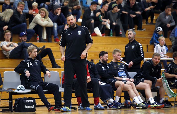 FH lagði Akureyri í fyrsta leik fimmtu umferðar Olís deildar karla í handbolta í dag 28-27 í Kaplakrika. FH var 18-12 yfir í hálfleik.Stefán Karlsson, ljósmyndari Fréttablaðsins og Vísis, var á vellinum í dag og tók myndirnar sem fylgja fréttinni. FH náði mest átta mark forystu snemma í seinni hálfleik og virtist ætla að keyra yfir slaka gestina að norðan sem sáu vart til sólar framan af leik. FH-ingar geta sjálfum sér um kennt að hafa ekki farið með enn betra forskot inn í seinni hálfleik. FH keyrði áætlunarferðir inn í galopna miðja vörn Akureyringa og vandræðagangurinn sem einkennt hefur sóknarleik gestanna það sem af er tímabili var áþreifanlegur þó liðið næði að skora 12 mörk í fyrir hálfleik. Varnarleikur FH fyrir hlé var ekki góður og voru leikmenn liðsins helst til of gjarnir við að keyra óþolinmóðir út úr vörninni þegar sóknir Akureyrar voru við það að sigla í strand. Akureyringar virtust búnir að gefast upp fyrir hlé en Sverre Jakobsson tók sér allan þann tíma sem hann mátti í hálfleik til að berja baráttuanda í brjóst sinna manna. Akureyringar fögnuðu hverju marki í seinni hálfleik og var allt annað að sjá varnarleik liðsins. Hægt og örugglega náði liðið að vinna upp átta marka forystu FH áður en aðeins einu marki munaði þegar skammt var til leiksloka. Bæði lið áttu í miklum vandræðum með að skora úr uppstilltum sóknarleik undir lokin og voru það hraðaupphlaup sem FH fékk þegar skammt var eftir sem að lokum skilaði sigrinum. Eins og Akureyri lék í fyrri hálfleik voru nánast allir í húsinu búnir að dæma liðið niður og það án stiga. Hvernig liðið brást við mótlætinu og vann sig inn í leikinn ætti að gefa liðinu trú á að það geti unnið sig úr vandræðunum en eftir situr að liðið skortir áþreifanlega skotógnun fyrir utan. Sem dæmi um vandræðaganginn í sókninni er að Bergvin Gíslason, öllu jöfnu öflugur leikmaður, leikur fyrir utan lungan úr leiknum en meiðsli á öxl valda því að hann getur varla skotið á markið. Þetta þarf liðið enn að laga þó það geti tekið margt annað út úr leiknum. Akureyri er enn án stiga en FH er nú með fjögur stig og ljóst að liðið þarf að leika betur til að vera ekki í fallbaráttu í allan vetur. FH varð fyrir því að missa Ísak Rafnsson útaf eftir höfuðhögg um miðbik seinni hálfleiks og munaði mjög mikið um það. Sóknarleikur liðsins í seinni hálfleik var ekki vænlegur til árangurs og leikmenn liðsins verða að ná að temja sér þolinmæði í vörninni, annars gefur liðið allt of mörg auðveld færi á sér.Sverre: Tókum skref áfram í seinni hálfleik „Ég get ekki annað en verið stoltur af liðinu. Menn komu því miður of spenntir inn í leikinn en við náum að vinna upp 8 marka mun á 30 mínútum og með smá heppni og auka skynsemi hefðum við getað unnið þennan leik,“ sagði Sverre Jakobsson þjálfari Akureyrar. „Þetta skref sem við tókum hérna í seinni hálfleik ætla ég að taka með mér. Við sýndum frábæran karakter og ég er mjög ánægður með það en gríðarlega sár með að tapa.“ Aðall Akureyrar á tímabilinu hefur verið öflug vörn. Hana var ekki að finna í fyrri hálfleik. „Varnarleikurinn var ekki eins og við lögðum upp með og ég verð að taka það aðeins á mig. Við byrjuðum aðeins í annarri vörn sem hefur reyndar gengið vel hjá okkur en svo bökkuðum við og samt fengum við allt of mörg mörk á okkur á línu. „Við náðum að loka á það og spila okkar varnarleik í seinni hálfleik og fengum okkar markvörslu. „Við höfum ekki skorað svona mörg mörk í vetur og við verðum að taka það jákvæða út úr þessu. Það tekur stórt hjarta að koma til baka eftir að hafa verið átta mörkum undir,“ sagði Sverre.Einar Rafn: Þvílíkur léttir „Við slökuðum full mikið á í seinni hálfleik. Við hættum keyra hraðaupphlaupin og seinni bylgjuna,“ sagði Einar Rafn Eiðsson markahæsti leikmaður FH í dag. FH-ingar gerðust oft óþolinmóðir í vörninni og æddu út í von um að vinna boltann þegar Akureyringar voru komnir í vandræði í sókninni. „Þetta er það sem við höfum verið að tala um í byrjun veturs, að halda aga og skipulagi í vörninni. Vera ekki að hlaupa út og gefa hinu liðinu of auðveld mörk. Það var aðallega það og svo var Hreiðar (Leví Guðmundsson) leiðinlegur við okkur í þessum leik.“ FH hefur átt í vandræðum og var búið að tapa þremur leikjum í röð fyrir þennan leik. Það er því hætt við að farið hafi um leikmenn liðsins þegar Akureyri vann upp gott forskot liðsins. „Það var ekkert sérstök tilfinning en við héldum áfram og það er að það eina sem skilar okkur stigum. Þetta er þvílíkur léttir,“ sagði Einar Rafn um stigin tvö sem komu í hús.vísir/stefánEinar Rafn skoraði átta mörk í dag.vísir/stefánSverre hefur verk að vinna með lið Akureyrar.vísir/stefánvísir/stefán