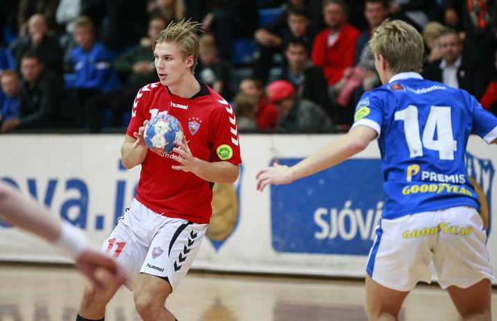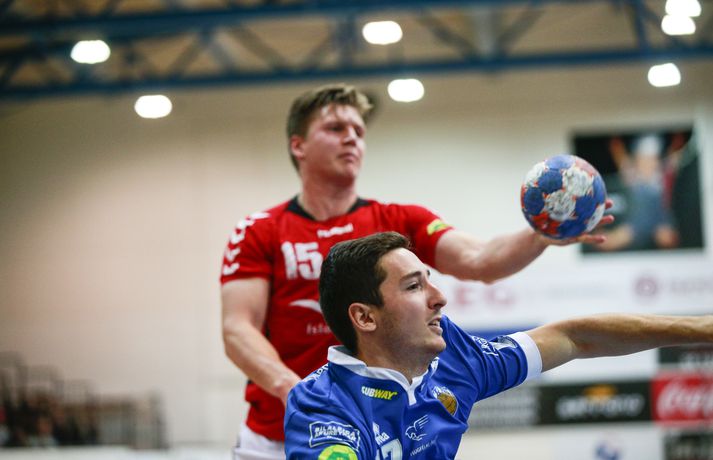 Valur vann baráttuna um Reykjavík þegar liðið lagði Fram, 22-25, í Safamýrinni í kvöld. Framarar voru betri í fyrri hálfleik en það kom allt annað Valslið til leiks í þeim síðari.Vilhelm Gunnarsson, ljósmyndari Fréttablaðsins og Vísis, var á vellinum og tók meðfylgjandi myndir. Leikurinn hófst vel fyrir heimamenn í Fram og voru lærisveinar Guðlaugs Arnarsonar vel klárir í þennan slag. Valsarar voru á hælunum í upphafi leiksins og gekk ekkert upp sóknarlega hjá liðinu. Ómar Ingi Magnússon var með einhverju lífsmarki hjá Val en aðrir fjarverandi. Hlynur Morthens átti reyndar fína spretti í marki Vals. Framarar voru allir að skila sínu og dreifðu álaginu vel. Safamýramenn komust mest 11-6 yfir í fyrri hálfleiknum en Valsmenn komu örlítið til baka undir lok hálfleiksins og var staðan 12-9 eftir 30 mínútur. Gestirnir í Val byrjuðu síðari hálfleik vel og voru leikmenn mun ákveðnari. Þeir komust yfir,15-14, þegar tæplega tuttugu mínútur voru eftir af leiknum og allt annað að sjá til liðsins. Framarar voru ekkert hættir og jafnræði var á með liðunum næstu mínútur. Þegar tíu mínútur voru til leiksloka var staðan 18-18 og mikil spenna í Safamýrinni. Það voru Valsmenn sem voru einfaldlega sterkari undir lokin og tóku betri ákvarðanir. Leiknum lauk með sigri Vals 25-22 en Ómar Ingi Magnússon var frábær í liði vals með 8 mörk og Sveinn Aron Sveinsson gerði sjö fyrir þá rauðu. Hjá Fram var það Garðar Sigurjónsson sem gerði sex mörk, þar af fimm úr víti. Guðmundur Hólmar: Ólíkt okkur að vera agaðir og taka réttar ákvarðanir„Við vorum eiginlega að elta þá í 45 mínútur og því eru tvö stig mjög kærkomin,“ segir Guðmundur Hólmar Helgason, fyrirliði Vals, eftir leikinn í kvöld. Valsmen voru mikið betri í síðari hálf en þeim fyrri. „Við töluðum bara um að halda haus í hálfleik. Það vantaði bara fimm prósent upp á hjá okkur grimmd og þá myndi þetta fara detta fyrir okkur.“ Guðmundur segir að vörn og markvarsla hafi verið fín hjá liðinu allan leikinn. Undir lok leiksins spiluðu Valsmenn mjög skynsaman sóknarleik og tóku réttar ákvarðanir. „Þetta var í raun mjög ólíkt okkur, að taka réttar ákvarðanir. Við höfum verið að taka rangar ákvarðanir á köflum á tímabilinu og því var þetta bara skemmtileg tilbreyting.“ Guðlaugur: Enn einu sinn köstum við leiknum frá okkur„Ég er bara svolítið svekktur að hafa ekki unnið leikinn,“ segir Guðlaugur Arnarson, þjálfari Fram, eftir leikinn. „Heilt yfir erum við bara að spila vel og ég hefði viljað taka meira út úr leiknum.“ Framarar voru sterkari aðilinn í fyrri hálfleiknum en Valsmenn tóku þann síðari. „Við vorum bara pínu klaufar í síðari hálfleiknum. Við erum í góðri stöðu þegar við byrjum að kasta boltanum bara frá okkur. Þá hleypum við þeim bara inn í leikinn.“ Fram er með fjögur stig eftir fjórar umferðir í Olís-deildinni. „Við erum bara í fínu standi, í raun er þetta þannig að ef þetta hefði spilast rétt fyrir okkur þá ættum við að vera með átta stig. Við köstuðum fyrsta leiknum frá okkur og erum að gera það aftur hér í kvöld.“vísir/vilhelmvísir/vilhelm
