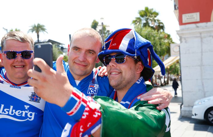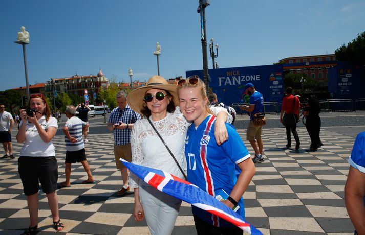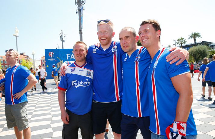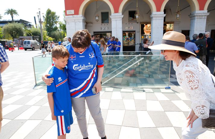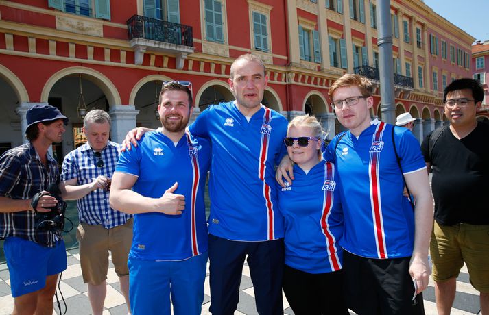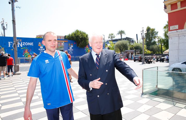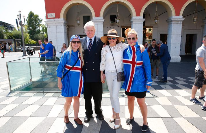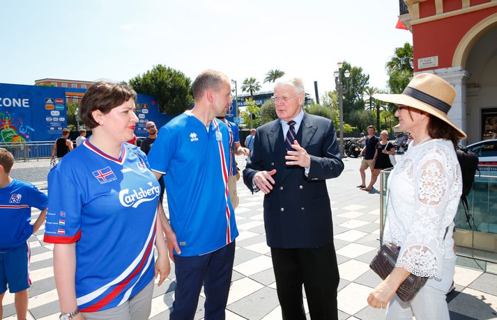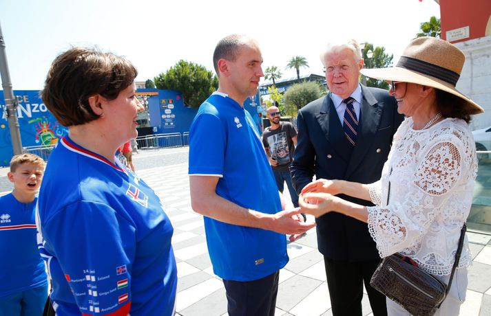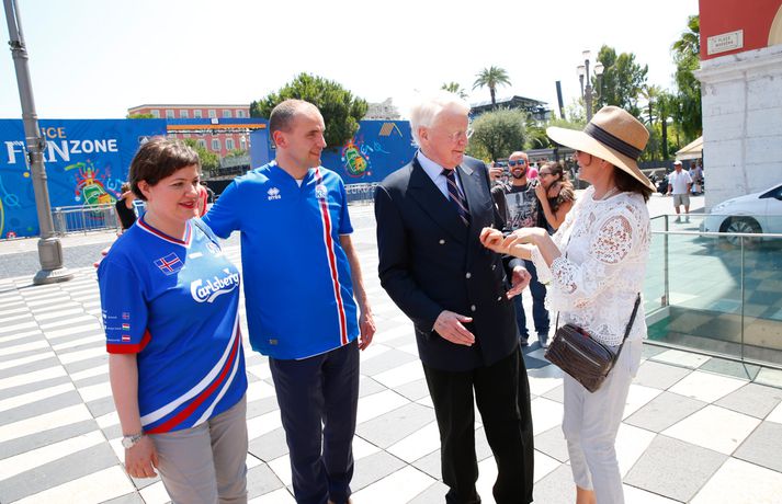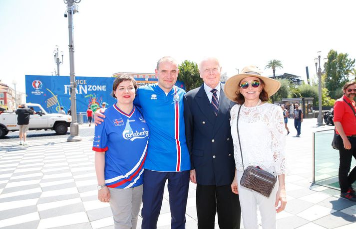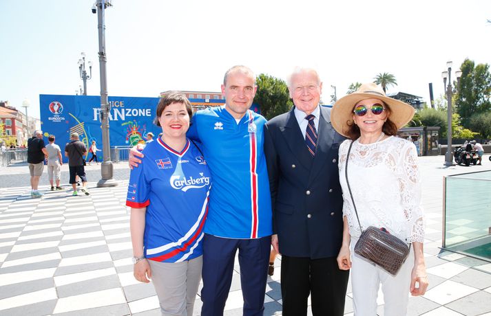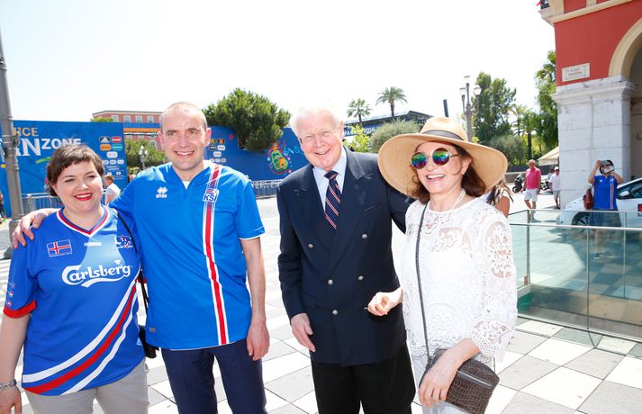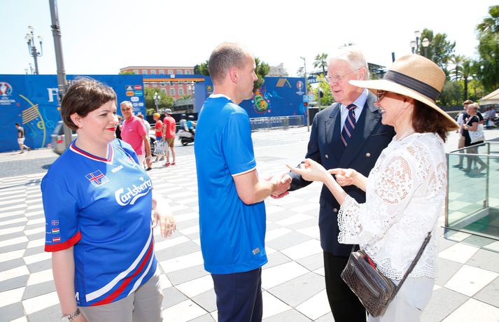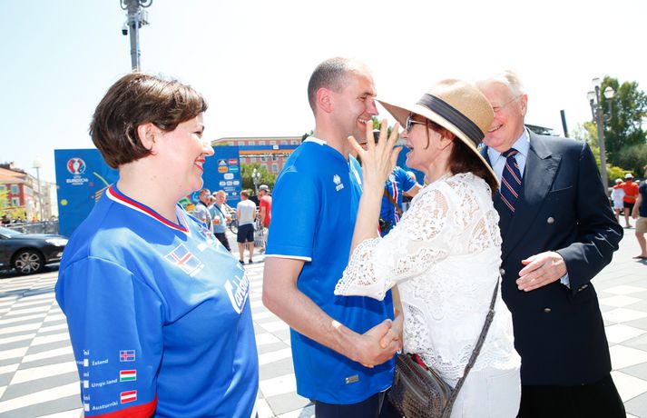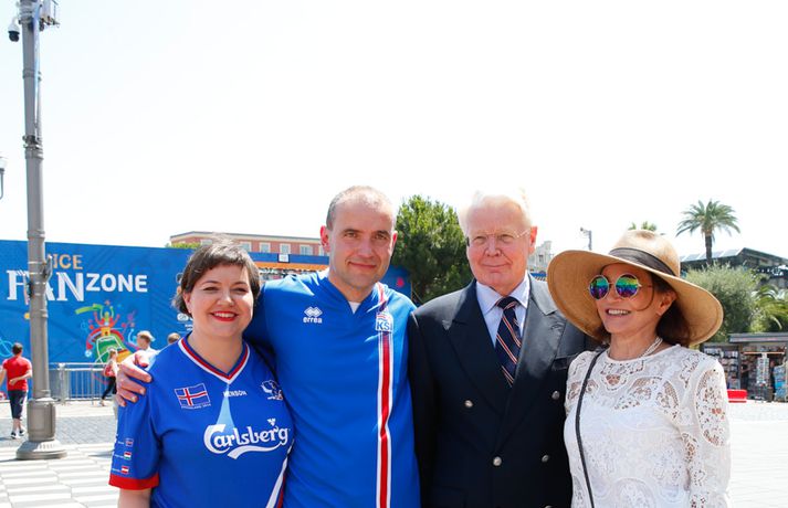 Verðandi forsetahjón, þau Guðni Th. Jóhannesson og Eliza Reid, hittu núverandi forsetahjón, Ólaf Ragnar Grímsson og Dorrit Moussaieff, í Nice í Frakklandi í dag en þau ætla öll á leik Íslands og Englands í 16-liða úrslitum Evrópumótsins sem fram fer í kvöld. Ef sagnfræðin bregst ekki blaðamanni Vísis er þetta í fyrsta skipti í Íslandssögunni sem verðandi forsetahjón hitta núverandi forsetahjón í kjölfar forsetakjörs. Sveinn Björnsson lést í embætti og hitti ekki eftirmann sinn, Ásgeir Ásgeirsson. Eiginkona Ásgeirs lést svo árið 1964 en árið 1968 var Kristján Eldjárn kjörinn forseti. Vigdís Finnbogadóttir átti síðan ekki maka, hvorki þegar hún tók við embætti 1980 né þegar hún lét af embætti 1996. Vilhelm Gunnarsson, ljósmyndari Vísis og Fréttablaðsins, er í Nice og náði meðfylgjandi myndum af forsetahjónunum tveimur í dag á sögulegri stund ef svo má að orði komast.vísir/vilhelm