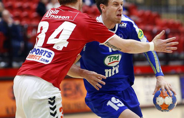 Eftir tvo mánuði án sigurs vann Stjarnan loksins leik þegar liðið sótti Val heim í Olís-deild karla í kvöld. Lokatölur 26-31, Stjörnunni í vil. Um miðjan fyrri hálfleik benti ekkert til þess að Stjarnan myndi fá neitt út úr leiknum, enda 11-4 undir.Stefán Karlsson, ljósmyndari Fréttablaðsins og Vísis, tók myndirnar sem má sjá hér að ofan. En frammistaða Stjörnunnar í lok fyrri hálfleiks og öllum seinni hálfleiknum var frábær og liðið verðskuldaði bæði stigin. Fyrstu 16 mínútur leiksins spilaði Stjarnan hins vegar eins og botnlið. Vonleysið virtist skína úr augum leikmanna liðsins sem voru ráðalausir í sókn og sofandi í vörn. Valsmenn byrjuðu leikinn af miklum krafti, spiluðu öfluga framliggjandi vörn og röðuðu inn mörkum á hinum enda vallarins. Þegar 16 mínútur voru liðnar af leiknum kom Anton Rúnarsson Val sjö mörkum yfir, 11-4. Á þeim tímapunkti leit allt út fyrir auðveldan sigur heimamanna. En Valsmenn tóku fótinn af bensíngjöfinni og Stjarnan vann sig inn í leikinn. Sóknin snarbatnaði og með hverju markinu jókst sjálfstraustið. Ari Magnús Þorgeirsson dró vagninn í sókninni og skoraði fjögur mörk á síðustu 14 mínútum fyrri hálfleiks. Stjarnan náði tvívegis að minnka muninn í eitt mark og fékk tækifæri til að jafna metin í lokasókn fyrri hálfleiks. Það gekk þó ekki og Valur leiddi með einu marki í hálfleik, 14-13. Stjörnumenn hófu seinni hálfleikinn eins og þeir enduðu þann fyrri. Þeir skoruðu þrjú fyrstu mörk seinni hálfleiks og náðu forystunni, 14-16. Sóknarleikur Vals var steingeldur í seinni hálfleik gegn sterki Stjörnuvörn. Þá hrökk Sveinbjörn Pétursson í gang í markinu og það var flottur taktur í sóknarleiknum. Á meðan varði Hlynur Morthens varla skot í marki Vals. Þjálfarar liðsins virtust ekki hafa mikla trú á varamarkverðinum, Guðmundi Eyjólfi Kristjánssyni, sem fékk að reyna sig við tvö skot áður en hann var tekinn út af aftur. Stjarnan bætti jafnt og þétt við forystuna og átti svör við öllum varnarafbrigðum Vals. Á endanum munaði fimm mörkum á liðunum, 26-31, og kærkomin Stjörnusigur staðreynd. Ari Magnús og Hjálmtýr Alfreðsson skoruðu sex mörk hvor fyrir Stjörnuna. Garðar B. Sigurjónsson skoraði fimm mörk og Starri Friðriksson fjögur úr jafn mörgum skotum. Sveinbjörn varði 16 skot í markinu (42%). Heiðar Þór Aðalsteinsson var markahæstur í liði Vals með fimm mörk en þau komu öll úr vítum. Valsmenn hafa nú tapað tveimur leikjum í röð gegn botnliðum deildarinnar með samtals 12 marka mun og þurfa að hugsa sinn gang fyrir leikinn gegn ÍBV á fimmtudaginn.Óskar Bjarni: Dómgæslan var skrítin Óskar Bjarni Óskarsson, annar þjálfara Vals, var ekki sáttur í leikslok, hvorki með sína menn né dómara leiksins. „Við misstum allt saman; vörnina, sóknina og allan pakkann. Þeir fóru að njóta þess að spila og fögnuðu öllu. Svo fannst mér dómgæslan mjög skrítin. Þeir fengu gult spjald á bekkinn og þá snerist þetta algjörlega,“ sagði Óskar Bjarni. „Mér fannst þeir lélegir en það er erfitt að tala um það þegar við vorum svona lélegir sjálfir. Við vorum varla með varinn bolta í seinni hálfleik og það skipti engu hvaða vörn við spiluðum. Þetta var því miður áframhald af Fram-leiknum,“ sagði Óskar Bjarni og vísaði til leiksins í síðustu umferð sem Valur tapaði 30-23. En hefur þetta eitthvað með hugarfarið að gera, þessi tvö slæmu töp fyrir liðum í kjallara deildarinnar? „Það er alltaf hægt að segja það. Þú ert 11-4 yfir og tapar. Þetta er sitt lítt af hverju og auðvitað spilar hugarfarið stóran þátt í öllu,“ sagði Óskar Bjarni. „Við verðum bara að vinna úr þessu. Við lentum í slæmri byrjun og höfum nú tapað tveimur leikjum. Við þurfum að komast aftur á beinu brautina og sem betur fer er leikur aftur á fimmtudaginn.“Einar: Sýndum gríðarlegan karakter Einar Jónsson, þjálfari Stjörnunnar, sá sína menn vinna langþráðan sigur á Val í kvöld. Þetta var fyrsti sigur Garðbæinga frá 13. október. Leikurinn byrjaði þó ekki gæfulega fyrir Stjörnuna sem var 11-4 undir eftir 16 mínútur. „Manni hefur oft liðið betur en mér fannst góður andi í liðinu. Svo sýndum við gríðarlegan karakter að koma okkur aftur inn í leikinn og sigla svo fram úr. Mér fannst þessi frammistaða endurspegla vinnuna í aðdraganda leiksins,“ sagði Einar. Stjarnan náði góðu áhlaupi undir lok fyrri hálfleiks og hélt svo áfram á sömu braut í seinni hálfleiknum sem Garðbæingar unnu 18-12. „Menn voru staðráðnir í að halda áfram þar sem frá var horfið og spila nákvæmlega eins í vörn og sókn. Þetta skilaði okkur góðum úrslitum í dag,“ sagði Einar. Sveinbjörn Pétursson hefur verið besti leikmaður Stjörnunnar í vetur og hann var frábær í seinni hálfleiknum í kvöld. Einar segist þó hafa séð Sveinbjörn spila betur en hann gerði í kvöld. „Þetta var bara ágætis leikur hjá Sveinbirni að mínu mati. Vörnin var frábær í seinni hálfleik sem og Sveinbjörn,“ sagði Einar. „En í ljósi þess hvernig þetta er búið að vera, þá stendur sóknarleikurinn upp úr. Ég tala nú ekki um á móti sennilega sterkasta varnarliði deildarinnar. Það er virkilega öflugt að skora 31 mark á Val.“
