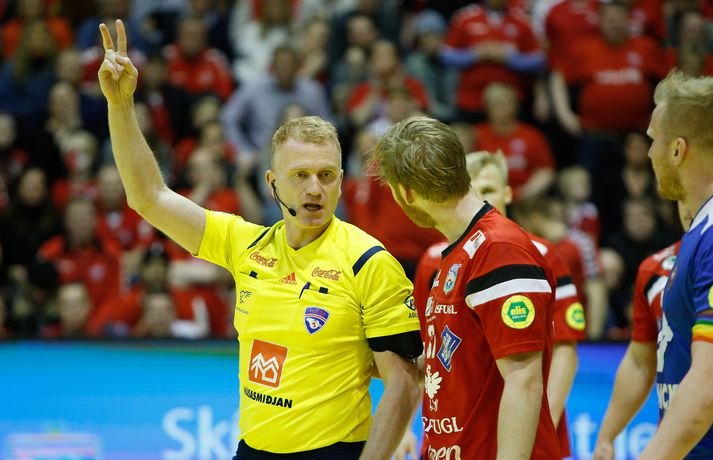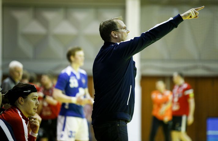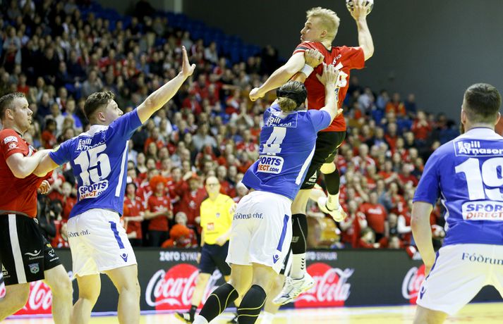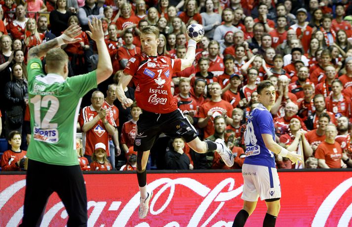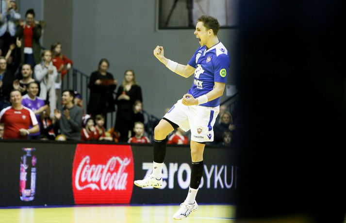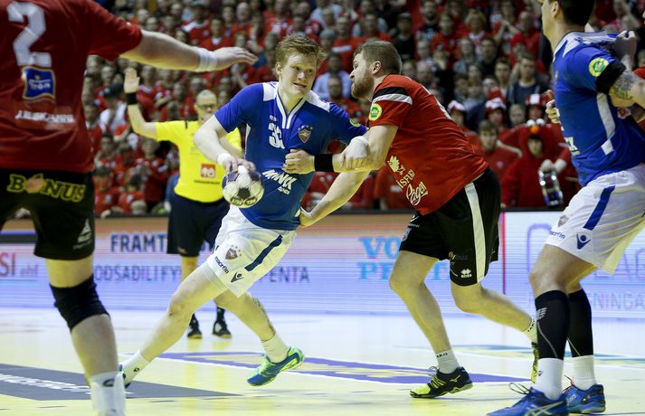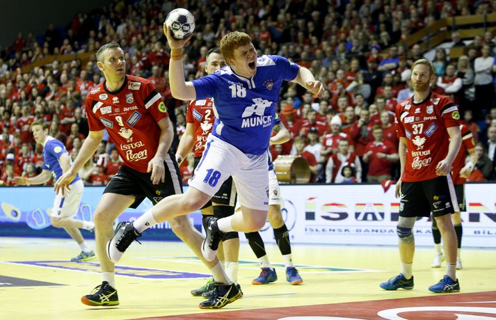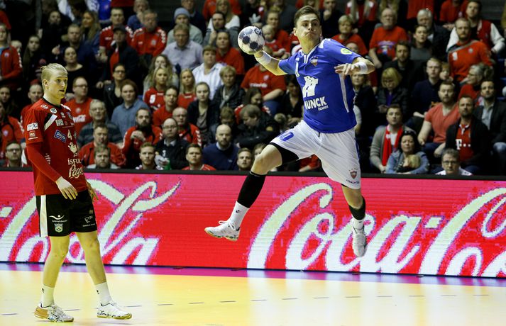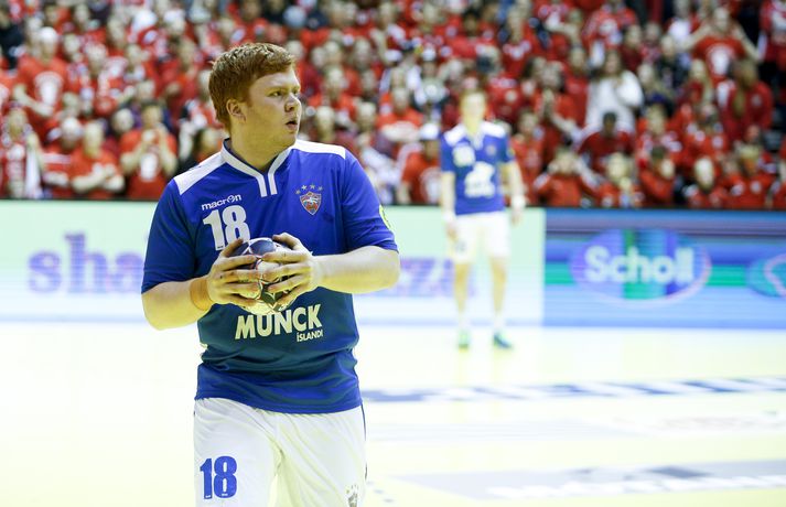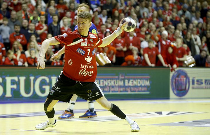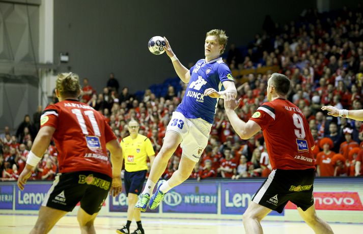 „Hann er frábær handboltamaður. Hann átti ekki góðan leik í gær og þegar það gerist biður hann okkur þjálfarana afsökunar. Við vorum nokkuð vissir um að hann yrði góður í dag. Fólk gleymir því stundum að hann er bara fæddur árið 1995. Þetta er mikill sigurvegari og hefur styrkt okkur vel,“ sagði Óskar Bjarni.