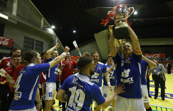 Anton og Orri Freyr taka við bikarnum með innlifun í dag.