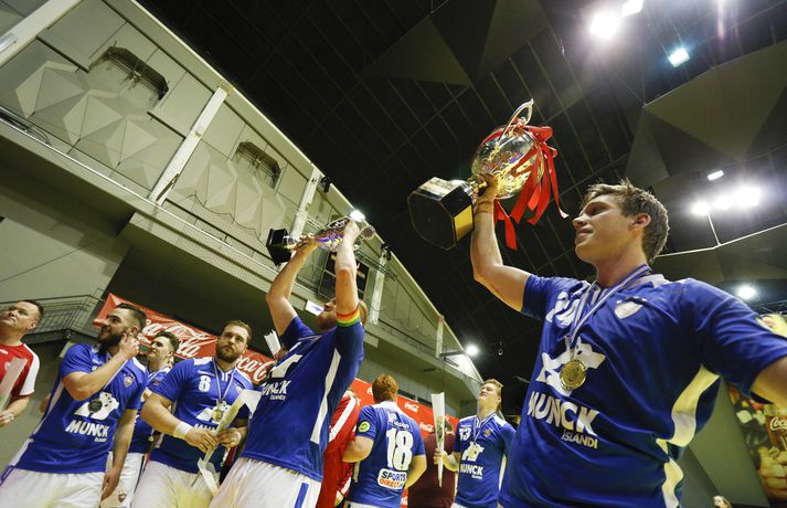 Anton og Orri Freyr taka við bikarnum með innlifun í dag. Vísir/Andri Marinó