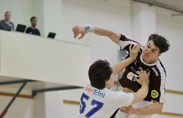 Umfjöllun, viðtöl og myndir: Grótta - Selfoss 29-29 | Jafnt í háspennu leik Guðmundur Marinó Ingvarsson í Hertz-höllinni skrifar 6. mars 2017 21:30 Unglingalandsliðsmennirnir Elvar Örn Jónsson og Aron Dagur Pálsson takast á. vísir/anton Grótta og Selfoss skildu jöfn 29-29 í 21. umferð Olís-deildar karla í handbolta á Seltjarnanesi í kvöld. Selfoss var 15-13 yfir í hálfleik.Anton Brink, ljósmyndari Fréttablaðsins og Vísis, var í Hertz-höllinni í kvöld og tók meðfylgjandi myndir. Leikurinn var jafn frá fyrstu mínútu til þeirrar síðustu. Ungir og efnilegir leikstjórnendur liðanna stýrðu spilinu vel og var leikurinn heilt yfir vel leikinn þó spennan hafi haft sín áhrif á gæðin undir lokin. Aron Dagur Pálsson hjá Gróttu lék samherja sína vel uppi og Elvar Örn Jónsson stýrði góðu flæði í sóknarleik Selfoss. Fyrir vikið var leikurinn hin besta skemmtun. Grótta skoraði tvö fyrstu mörk leiksins en það var í eina skiptið sem það munaði meira en einu marki á liðunum þar til þrjár mínútur voru til hálfleiks. Selfoss lagði grunninn að forystu sinni í hálfleik með fjórum af sex síðustu mörkum hálfleiksins. Grótta byrjaði seinni hálfleikinn vel og komst yfir og var með frumkvæðið lengst af seinni hálfleik en bæði lið fengu tækifæri til að tryggja sér sigur á síðustu mínútunni. Einar Sverrisson fékk fínt færi til að tryggja Selfossi sigurinn en Lárus Helgi Ólafsson varði frá honum áður en leiktíminn rann út. Þetta var aðeins annað stig Selfoss í fimm leikjum eftir að deildin fór af stað eftir frí en liðið er með 18 stig, þremur stigum frá fallsæti. Grótta er í 8. sæti með 16 stig í harðri fimm liða fallbaráttu. Finnur Ingi: Það er ekkert óvart í þessu sporti„Ég hugsa að þetta sé sanngjarnt. Þetta sveiflast til og frá. Við náum ágætis sprett í byrjun seinni hálfleiks og þeir koma til baka,“ sagði Finnur Ingi Stefánsson sem átti góðan leik fyrir Gróttu þrátt fyrir að fá rautt spjald þegar tíu mínútur voru eftir. „Þetta er fram og til baka og það hefði verið djöfullegt ef þeir hefðu skorað í síðustu sókninni. Þeir fá færi til þess og frákastið poppar út í horn. Ég veit ekki af hverju það var enginn þar en það er önnur saga. „Sem betur fer rann þetta en ég held að þetta sé sanngjarnt,“ sagði Finnur. Grótta er nú með stigi meira en tvö neðstu lið deildarinnar í harðri og jafnri fallbaráttu. Liðið hefur þó náð í fimm stig í fimm leikjum eftir jólafrí og lítur ágætlega út. „Við erum innbyrðis á móti Selfossi og það getur talið fyrir rest. Það er fínt. En þetta er svakalegur fimm liða pakki sem Selfoss er komið ofan í núna. „Það er ómögulegt að segja þegar sex leikir eru eftir. Þetta getur farið allavega. Þetta er gott fyrir áhorfandann. „Við höfum verið að bæta okkar leik undanfarið eftir pásuna. Það er svo mikið undir í þessum leik að gæði falla kannski aðeins í kvöld. Lengi framan af voru gæðin ágæt en við vorum að drífa okkur allt of mikið í byrjun leiks, þar á meðal ég. „Ég held að gæðin hafi verið upp á við hjá okkur,“ sagði Finnur sem gat lítið kvartað undan rauða spjaldinu sem hann fékk fyrir að fara aftan í skothöndina á Hergeiri Grímssyni í vinstra horninu hjá Selfossi. „Það er eiginlega ekkert við því að segja. Þetta var eins óvart og það verður en þeir segja að það sé ekkert óvart í sportinu. Við flækjum hendur saman. „Þetta lítur illa út og þeir dæma rautt eftir því. Ég held að það sé lítið við því að segja þó þetta sé grautfúlt þegar það gerist. En hann á skot og skorar og ég vil meina að það sýni aðeins að ég reyndi að forðast snertinguna þegar ég fann að hún hana,“ sagði Finnur Ingi. Einar: Barátta upp á líf og dauða í hverjum leikEinar Sverrisson fékk tækifæri til að skora sitt níunda mark fyrir Selfoss í kvöld rétt áður en leiknum lauk og var að vonum svekktur að hafa ekki stolið báðum stigunum eftir jafnan leik á Nesinu í kvöld. „Djöfull hefði ég viljað bæði stigin. Það hefði verið kærkomið,“ sagði Einar. „Við vorum skrefinu á undan í fyrri hálfleik og þeir í seinni hálfleik og svo var þetta jafnt í restina og hefði getað dottið báðum megin. „Ég fékk fínt skotfæri, Þráinn (Orri Jónsson) var með fjærhornið og Lalli (Lárus Helgi Ólafsson) lagðist í nær. Svo dettur frákastið fyrir hornamanninn okkar og það munar sekúndu. Svona er þetta stundum.“ Þetta var aðeins annað stigið sem Selfoss nær í eftir áramót í fimm leikjum og hefur liðið sogast niður í fimm liða fallbaráttu. „Þetta er einn klumpur þarna neðri hlutinn og hvert stig er dýrmætt. Við tökum þessu stigi þó það hefði verið ennþá betra að taka bæði stigin. „Eftir áramót er þetta búið að vera upp og ofan. Við höfum átt fína kafla en það dugir ekki. Ég vona að þetta sé að koma hjá okkur. „Það er barátta upp á líf og dauða í hverjum leik. Við erum í baráttu um að halda okkur í deildinni,“ sagði stórskyttan að lokum. Olís-deild karla Mest lesið Harma rasíska og transfóbíska grein liðsfélaga Sveindísar Fótbolti Liverpool loks á sigurbraut á ný Enski boltinn Amad bjargaði stigi fyrir United Enski boltinn Gjöf frá mömmu vatt rækilega upp á sig Sport Alfreð hissa: Veit að Íslendingar geta mun betur Handbolti Andri Lucas var kóngurinn á King Power í dag Enski boltinn „Fannst þetta verða svartara og svartara“ Handbolti Segir sönginn um Jota á tuttugustu mínútu hafa áhrif á leik Liverpool Enski boltinn Arsenal með sjö stiga forystu á toppnum Enski boltinn Liverpool féll síðast þegar liðið tapaði fimm í röð Enski boltinn Fleiri fréttir KA/Þór gerð