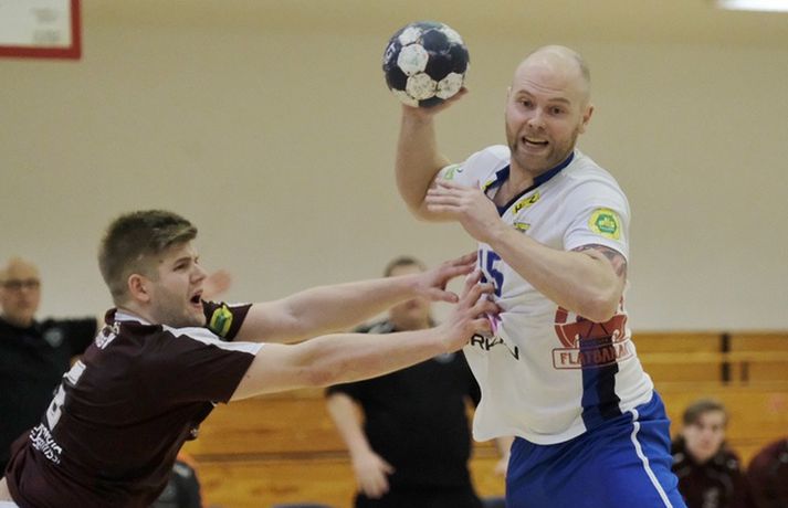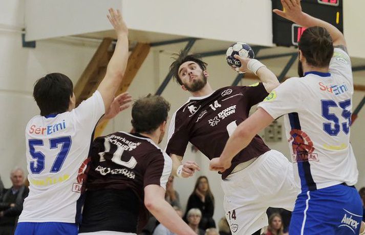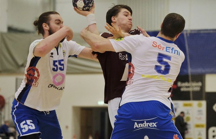 Grótta og Selfoss skildu jöfn 29-29 í 21. umferð Olís-deildar karla í handbolta á Seltjarnanesi í kvöld. Selfoss var 15-13 yfir í hálfleik.Anton Brink, ljósmyndari Fréttablaðsins og Vísis, var í Hertz-höllinni í kvöld og tók meðfylgjandi myndir. Leikurinn var jafn frá fyrstu mínútu til þeirrar síðustu. Ungir og efnilegir leikstjórnendur liðanna stýrðu spilinu vel og var leikurinn heilt yfir vel leikinn þó spennan hafi haft sín áhrif á gæðin undir lokin. Aron Dagur Pálsson hjá Gróttu lék samherja sína vel uppi og Elvar Örn Jónsson stýrði góðu flæði í sóknarleik Selfoss. Fyrir vikið var leikurinn hin besta skemmtun. Grótta skoraði tvö fyrstu mörk leiksins en það var í eina skiptið sem það munaði meira en einu marki á liðunum þar til þrjár mínútur voru til hálfleiks. Selfoss lagði grunninn að forystu sinni í hálfleik með fjórum af sex síðustu mörkum hálfleiksins. Grótta byrjaði seinni hálfleikinn vel og komst yfir og var með frumkvæðið lengst af seinni hálfleik en bæði lið fengu tækifæri til að tryggja sér sigur á síðustu mínútunni. Einar Sverrisson fékk fínt færi til að tryggja Selfossi sigurinn en Lárus Helgi Ólafsson varði frá honum áður en leiktíminn rann út. Þetta var aðeins annað stig Selfoss í fimm leikjum eftir að deildin fór af stað eftir frí en liðið er með 18 stig, þremur stigum frá fallsæti. Grótta er í 8. sæti með 16 stig í harðri fimm liða fallbaráttu. Finnur Ingi: Það er ekkert óvart í þessu sporti„Ég hugsa að þetta sé sanngjarnt. Þetta sveiflast til og frá. Við náum ágætis sprett í byrjun seinni hálfleiks og þeir koma til baka,“ sagði Finnur Ingi Stefánsson sem átti góðan leik fyrir Gróttu þrátt fyrir að fá rautt spjald þegar tíu mínútur voru eftir. „Þetta er fram og til baka og það hefði verið djöfullegt ef þeir hefðu skorað í síðustu sókninni. Þeir fá færi til þess og frákastið poppar út í horn. Ég veit ekki af hverju það var enginn þar en það er önnur saga. „Sem betur fer rann þetta en ég held að þetta sé sanngjarnt,“ sagði Finnur. Grótta er nú með stigi meira en tvö neðstu lið deildarinnar í harðri og jafnri fallbaráttu. Liðið hefur þó náð í fimm stig í fimm leikjum eftir jólafrí og lítur ágætlega út. „Við erum innbyrðis á móti Selfossi og það getur talið fyrir rest. Það er fínt. En þetta er svakalegur fimm liða pakki sem Selfoss er komið ofan í núna. „Það er ómögulegt að segja þegar sex leikir eru eftir. Þetta getur farið allavega. Þetta er gott fyrir áhorfandann. „Við höfum verið að bæta okkar leik undanfarið eftir pásuna. Það er svo mikið undir í þessum leik að gæði falla kannski aðeins í kvöld. Lengi framan af voru gæðin ágæt en við vorum að drífa okkur allt of mikið í byrjun leiks, þar á meðal ég. „Ég held að gæðin hafi verið upp á við hjá okkur,“ sagði Finnur sem gat lítið kvartað undan rauða spjaldinu sem hann fékk fyrir að fara aftan í skothöndina á Hergeiri Grímssyni í vinstra horninu hjá Selfossi. „Það er eiginlega ekkert við því að segja. Þetta var eins óvart og það verður en þeir segja að það sé ekkert óvart í sportinu. Við flækjum hendur saman. „Þetta lítur illa út og þeir dæma rautt eftir því. Ég held að það sé lítið við því að segja þó þetta sé grautfúlt þegar það gerist. En hann á skot og skorar og ég vil meina að það sýni aðeins að ég reyndi að forðast snertinguna þegar ég fann að hún hana,“ sagði Finnur Ingi. Einar: Barátta upp á líf og dauða í hverjum leikEinar Sverrisson fékk tækifæri til að skora sitt níunda mark fyrir Selfoss í kvöld rétt áður en leiknum lauk og var að vonum svekktur að hafa ekki stolið báðum stigunum eftir jafnan leik á Nesinu í kvöld. „Djöfull hefði ég viljað bæði stigin. Það hefði verið kærkomið,“ sagði Einar. „Við vorum skrefinu á undan í fyrri hálfleik og þeir í seinni hálfleik og svo var þetta jafnt í restina og hefði getað dottið báðum megin. „Ég fékk fínt skotfæri, Þráinn (Orri Jónsson) var með fjærhornið og Lalli (Lárus Helgi Ólafsson) lagðist í nær. Svo dettur frákastið fyrir hornamanninn okkar og það munar sekúndu. Svona er þetta stundum.“ Þetta var aðeins annað stigið sem Selfoss nær í eftir áramót í fimm leikjum og hefur liðið sogast niður í fimm liða fallbaráttu. „Þetta er einn klumpur þarna neðri hlutinn og hvert stig er dýrmætt. Við tökum þessu stigi þó það hefði verið ennþá betra að taka bæði stigin. „Eftir áramót er þetta búið að vera upp og ofan. Við höfum átt fína kafla en það dugir ekki. Ég vona að þetta sé að koma hjá okkur. „Það er barátta upp á líf og dauða í hverjum leik. Við erum í baráttu um að halda okkur í deildinni,“ sagði stórskyttan að lokum.