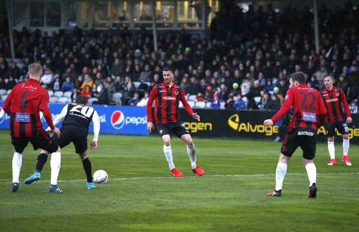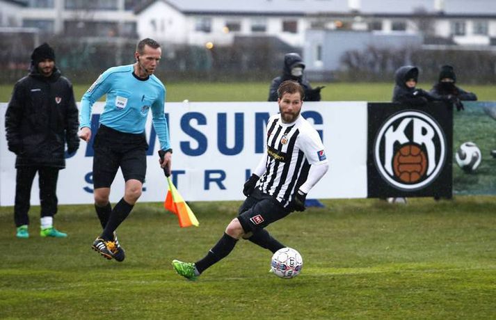 Umfjöllun, viðtöl og einkunnir: KR - Víkingur R. 1-2 | Víkingur sótti sigur í Vesturbæinn Smári Jökull Jónsson á Alvogen-vellinum skrifar 1. maí 2017 22:30 KR-ingurinn Tobias Thomsen umkringdur Víkingum. Vísir/Stefán Víkingar unnu sætan sigur á KR í 1.umferð Pepsi-deildar karla í Vesturbænum í kvöld. KR komst yfir í fyrri hálfleik en gestirnir svöruðu með tveimur mörkum í þeim síðari. KR byrjaði mun betur og strax á 9.mínútu skoraði Tobias Thomsen eftir góða sendingu frá landa sínum Morten Beck. Eftir markið voru það gestirnir sem voru sterkari og hefðu getað jafnað fyrir hlé. Þeir fengu færi og það besta fékk Arnþór Ingi Kristinsson en Stefán Logi Magnússon í marki KR varði vel. Seinni hálfleikur byrjaði rólega en á 60.mínútu jafnaði Dofri Snorrason eftir góða sendingu frá Ívari Erni Jónssyni. Gestirnir notuðu síðan svo til sömu uppskrift þegar þeir komust í 2-1 á 72.mínútu. Þá fóru þeir upp hægra megin og Vladimir Tufegdzig sendi boltann fyrir á Geoffrey Castillion sem skoraði af markteig. Það sem eftir var sóttu KR-ingar meira en náðu aldrei að ógna marki Víkinga að ráði.Af hverju vann Víkingur?Þeir voru einfaldlega beittari í sínum sóknaraðgerðum og lokuðu svo vel á leikmenn KR í sínum aðgerðum. Eftir að Óskar Örn Hauksson hafði átt ágæta spretti í byrjun leiks náðu varnar- og miðjumenn Víkinga algjörlega að spila hann út úr leiknum og Milos þjálfari Víkinga talaði um það eftir leik að þeir hefðu lagt sérstaka áherslu á að stoppa Óskar Örn. Sóknarlega þurfa KR-ingar að skoða sinn leik því þeir náðu lítið að ógna marki Víkinga í síðari hálfleiknum og var sérstakt að sjá hvernig leikur heimamanna koðnaði niður fljótlega eftir að þeir komust yfir.Hverjir stóðu uppúr? Hjá Víkingum var Ívar Örn Jónsson öflugur vinstra megin og átti ófáa sprettina upp kantinn. Hann lagði upp markið fyrir Dofra og átti góðan leik fyrir gestina. Geoffrey Castillion sýndi ekki mikið framan af leik en vann sig ágætlega inn í spilið og skoraði gott sigurmark í síðari hálfleik. Miðverðir Víkinga, þeir Halldór Smári Sigurðsson og Alan Lowing, áttu sömuleiðis fínan leik sem og Dofri Snorrason sem skoraði jöfnunarmarkið.Hvað gekk illa? KR-ingum gekk bölvanlega að skapa sér einhver færi að ráði eftir að þeir skoruðu mark sitt í upphafi. Sóknarleikur þeirra gekk mikið út á það að finna Óskar Örn Hauksson og virtist lítið gerast nema hann fengi boltann. Víkingum tókst hins vegar að loka mjög vel á hann. Í fyrri hálfleiknum gekk mönnum frekar illa að hafa hemil á tæklingunum og fóru fimm gul spjöld á loft á fyrstu 45 mínútunum. Þau hefðu getað orðið fleiri í þeim síðari og var Skúli Jón Friðgeirsson til dæmis heppinn að fá ekki sitt annað gula spjald seint í leiknum þegar hann braut á leikmanni Víkinga í skyndisókn.Hvað gerist næst? KR heldur næst til Ólafsvíkur og mætir hinu Víkingsliðinu í deildinni. Þar verða þeir að sækja sigur því annars fer að fara um menn í Vesturbænum. Víkingar fá heimaleik í næstu umferð gegn Grindavík sem gerði jafntefli við Stjörnuna í kvöld. Milos þjálfari vildi halda sínum mönnum á jörðinni eftir leikinn í kvöld því hann talaði um að leikurinn gegn nýliðunum af Suðurnesjunum yrði ekkert auðveldari en sá gegn KR.Einkunnir leikmanna: KR (3-4-3) Stefán Logi Magnússon 6 - Arnór Sveinn Aðalsteinsson 5, Skúli Jón Friðgeirsson 4, Gunnar Þór Gunnarsson 4 - Morten Beck 6, Pálmi Rafn Pálmson 4, Finnur Orri Margeirsson 5, Ástbjörn Þórðarson 3 - Óskar Örn Hauksson 5, Tobias Thomsen 6, Kennie Chopart 5. Víkingur (4-3-3) Róbert Örn Óskarsson 6 - Dofri Snorrason 6, Alan Lowing 6, Halldór Smári Sigurðsson 7, Ívar Örn Jónsson 7 (maður leiksins) - Arnþór Ingi Kristinsson 5, Milos Ozegovic 5, Alex Freyr Hilmarsson 6 - Vladimir Tufegdzig 6, Geoffrey Castillion 7, Ragnar Bragi Sveinsson 5. Milos: Finnst þetta sanngjarn sigurMilos Milojevic þjálfari Víkinga var hæstánægður með sigur sinna manna á KR-vellinum. Hann talaði um það fyrir leik að það væri frábært að hefja mótið gegn KR. „Ég vissi af hverju ég var að segja þetta. Það þarf ekki að mótivera leikmenn fyrir leik á móti KR og FH, þeir gíra sig sjálfir upp. Það var í raun okkur að falli í upphafi því við vorum of spenntir. Eftir að þeir skora mark þá jöfnum við okkur og byrjum að spila,“ sagði Milos í samtali við Vísi eftir leikinn í kvöld. „Það hefði ekki verið ósanngjarnt ef við hefðum jafnað fyrir hálfleik en það kom á réttum tíma í þeim síðari. Síðustu 30 mínútur fannst mér við spila virkilega vel og eins og ég vil sjá okkur spila,“ bætti Milos við en KR ógnaði marki Víkinga lítið eftir að þeir komust yfir. KR byrjaði þó leikinn betur og komust yfir strax á 9.mínútu. Þá tóku Víkingar sig hins vegar á og hefðu vel getað jafnað fyrir hlé. „Við vorum aðeins of feimnir í byrjun og sýndum þeim of mikla virðingu. Þeir eru með mjög gott og skipulagt lið og þegar leikurinn byrjar þá þarftu að vera hugrakkur og hafa trú á því sem þú gerir. Ég bað menn um það í hálfleik og mínir gerðu það frábærlega. Þetta var erfiður leikur og á einhverjum tímapunkti gat sigurinn lent hvoru megin sem var en mér fannst þetta sanngjarn sigur.“ Varnarlega voru Víkingar öflugir og virtust leggja mikla áherslu á að stoppa Óskar Örn Hauksson sem var frábær á undirbúningstímabilinu. „Það eru engin geimvísindi að þeirra besti maður er Óskar Örn. Ég hef hælt honum mikið og hann skorar alltaf á móti okkur. Við unnum virklega vel í kringum hann, hann átti nokkra spretti en átti ekki sinn besta leik.“ „Við missum okkur ekkert yfir þessum þremur s