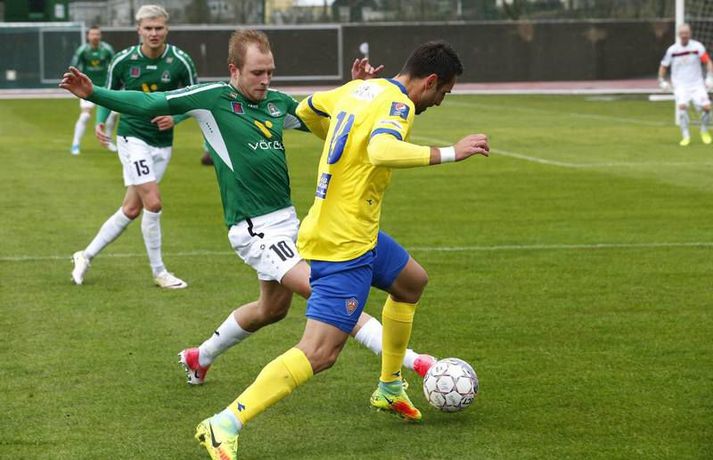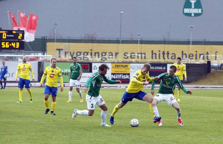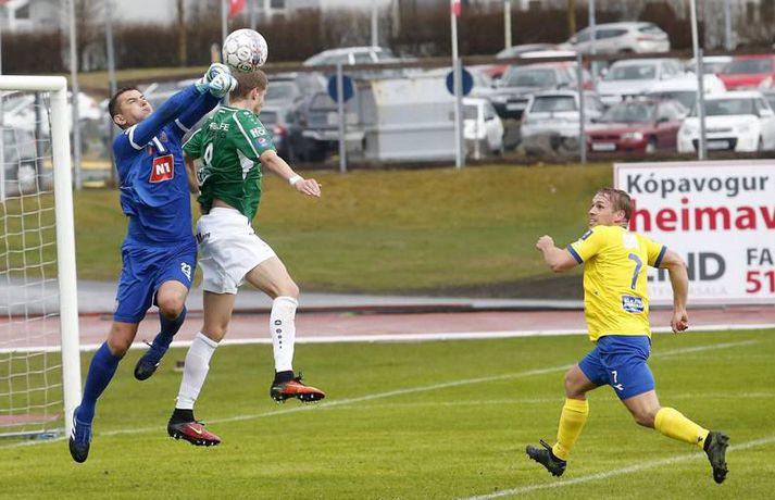 KA-menn byrja vel á sínu fyrsta tímabili í efstu deild í þrettán ár en þeir sóttu þrjú stig á Kópavogsvöll í 1. umferð Pepsi-deildar karla í fótbolta í kvöld. KA skoraði tvö mörk í fyrri hálfleiknum og vann á endanum 3-1 sigur eftir að Blikar minnkuðu muninn í lokin. Darko Bulatovic, Elfar Árni Aðalsteinsson og Ásgeir Sigurgeirsson skoruðu mörkin en Hallgrímur Mar Steingrímsson lagði upp tvö þeirra. Þetta er því annað árið í röð sem Blikar byrja Íslandsmótið á því að tapa á heimavelli á móti nýliðum í fyrstu umferðinni. Akureyringar byrjuðu leikinn af krafti og settu pressu á vörn Blika nánast frá fyrstu mínútu. Aðstæður voru erfiðar, rok og mikil rigning, en það var ekki að sjá að það skipti Akureyringa nokkru máli - þeir létu vel fyrir sér finna. Þessi pressa borgaði sig þegar Bulatovic skoraði með góðu skoti eftir sendingu Steinþórs Freys Þorsteinssonar, sem var að spila sinn fyrsta leik í Pepsi-deildinni eftir langa fjarveru í atvinnumennsku. Eina sem skyggði á fyrri hálfleikinn hjá KA var að hann fór meiddur af velli. Pressan hélt áfram hjá KA-mönnum og Elfar Árni Aðalsteinsson, sem var að spila á sínum gamla heimavelli, skoraði á 43. mínútu eftir mistök hjá Gunnleifi Gunnleifssyni, markverði Blika. Heimamenn reyndu að róa taugarnar og koma sér aftur inn í leikinn í upphafi síðari hálfleiks, en það bar lítinn árangur. Akureyringar vörðust vel og uppskáru þriðja markið eftir laglega sókn, er Hallgrímur Mar Steingrímsson renndi boltanum á Ásgeir sem skoraði með föstu skoti. Andri Rafn Yeoman nýtti sér slæma hreinsun Guðmans Þórissonar á 70. mínútu og skoraði fyrsta mark Blika með góðu skoti en við markið rönkuðu heimamenn loksins við sér. Þrátt fyrir nokkur hálffæri á lokakafla leiksins var forystu KA aldrei ógnað að verulegu ráði. Oliver Sigurjónsson átti reyndar skot í slána úr aukaspyrnu en nær komust Blikar ekki.Af hverju vann KA? Nýliðarnir frá Akureyri voru mun grimmari í öllum sínum aðgerðum og stjórnuðu leiknum fyrstu 70 mínúturnar, þar til að Blikar gerðu sig loksins líklega til að ógna marki gestanna að einhverju ráði. Margir í liði KA áttu góðan dag á meðan að sárafáir, ef nokkrir, voru líkir sjálfum sér í liði heimamanna. KA var reiðubúið í baráttuna í slagviðrinu frá fyrstu mínútu og það gerði útslagið. Það er áhyggjuefni fyrir Blika að þeir virtust engan vegir tilbúnir í þennan slag.Hverjir stóðu upp úr? Guðmann Þórisson átti góðan dag í vörn KA á gamla heimavellinum sínum en allir í liði KA voru sannfærandi í kvöld. Aleksandar Trninic og Darko Bulatovic líta báðir mjög vel út og Ásgeir Sigurgeirsson átti góða spretti - engan betri en þegar hann skoraði markið sitt. Hallgrímur Mar átti líka skínandi góðan leik og þannig mætti lengi áfram telja.Hvað gekk illa? Það er áhyggjuefni fyrir Blika að þeir virðist ætla að byrja þetta mót jafn illa og þeir enduðu síðasta tímabil. Hvort sama vandamálið sé enn við lýði og á haustmánuðum síðasta tímabils skal ósagt látið en það er eðlilegt að velta því fyrir sér. Það býr heilmikið í liði Blika en það sýndu þeir engan veginn í kvöld. Sérstakt áhyggjuefni er sóknarleikur Breiðabliks. Blikar brugðust við markaleysi síðustu ára með því að fá þrjá öfluga sóknarmenn til liðsins en enginn þeira komst í takt við leikinn í kvöld.Hvað gerist næst? KA-menn eiga erfiða leiki í upphafi móts og mæta næst Íslandsmeisturum FH á útivelli. En ef þeir sýna sama kraft og þeir gerðu í kvöld er alveg ljóst að þeir geta valdið lærisveinum Heimis Guðjónssonar usla. Akureyringar eru hungraðir og það er mikill kostur. Blikar eiga næsta leik gegn Fjölni á útivelli en bæði lið eru með óbragð í munni eftir fyrstu umferðinni og vilja sjálfsagt nýta þennan leik til að kvitta fyrir það.Einkunnir leikmanna: Brieðablik (4-3-3): Gunnleifur Gunnleifsson 5 - Davíð Kristján Ólafsson 4, Damir Muminovic 6, Gísli Eyjólfsson 5, Guðmundur Friðriksson 5 - Oliver Sigurjónsson 5, Arnþór Ari Atlason 3 (61. Höskuldur Gunnlaugsson x), Andri Rafn Yeoman 5 (79. Kolbeinn Þórðarson -) - Aron Bjarnaxon 3 (87. Sólon Breki Leifsson -), Martin Lund Pedersen 3, Hrvoje Tokic 3. KA (4-3-3): Srdjan Rajkovic 7, Bjarki Þór Viðarsson 6, Guðmann Þórisson 8 (maður leiksins), Callum Williams 7, Darko Bulotovic 7 - Almarr Ormarsson 6, Aleksandar Trninic 7, Steinþór Freyr Þorsteinsson 7 (33. Emil Lyng 6) - Ásgeir Sigurgeirsson 7 (81. Daníel Hafsteinsson -), Hallgrímur Mar Steingrímsson 7, Elfar Árni Aðalsteinsson 6 (74. Ólafur Aron Pétursson -). Túfa: Baráttan til fyrirmyndarSrdjan Tufegdzic, þjálfari KA.vísir/stefán„Það er frábært að vera kominn með liðið aftur í efstu deild og byrja á svona sigri. Ég er afar stoltur af strákunum í dag,“ sagði Srdjan Tufegdzic, þjálfari KA, eftir góðan 3-0 sigur á Breiðabliki í kvöld. „Við vorum að spila gegn lið sem ætlar sér að verða Íslandsmeistari við erfiðar aðstæður - það var mikill vindur og völlurinn blautur. Við fengum bara tvær æfingar á grasi fyrir norðan en það var alveg fyrir fyrirmyndar hvernig menn voru að berjast fyrir KA í kvöld.“ Hann var afar ánægður með sterka byrjun hans manna í kvöld. „Við mættum inn á leikinn til að vinna hann. Við vorum ekki að verjast og bíða bara eftir því að þeir gerðu mistök. Við settum pressu á boltamanninn þeirra og eltum þá út um allt.“ „Það var svo eðlilegt að við gáfum aðeins eftir þegar við komumst í 3-0 í seinni hálfleik,“ sagði Túfa, eins og hann er yfirleitt kallaður. Hann vildi þó ekkert ræða um hversu hátt hann stefni með lið KA, sem leit vel út í leiknum í kvöld. „