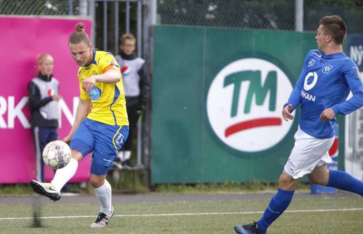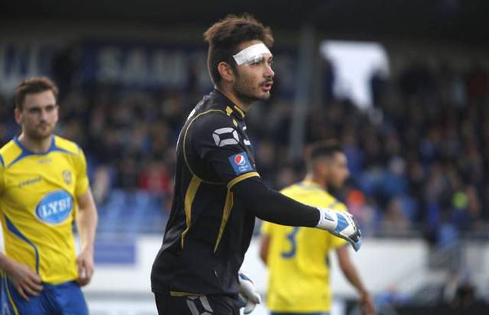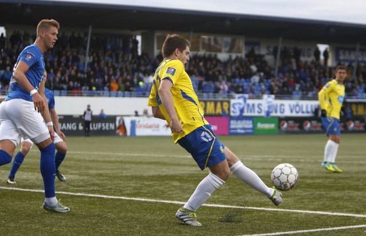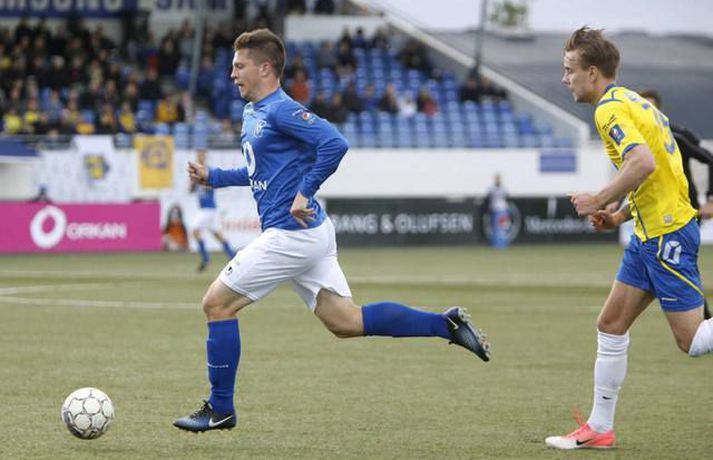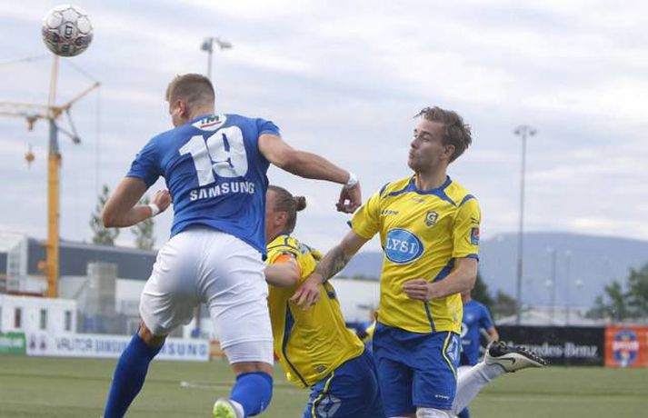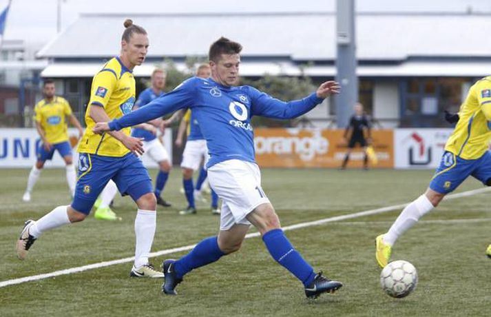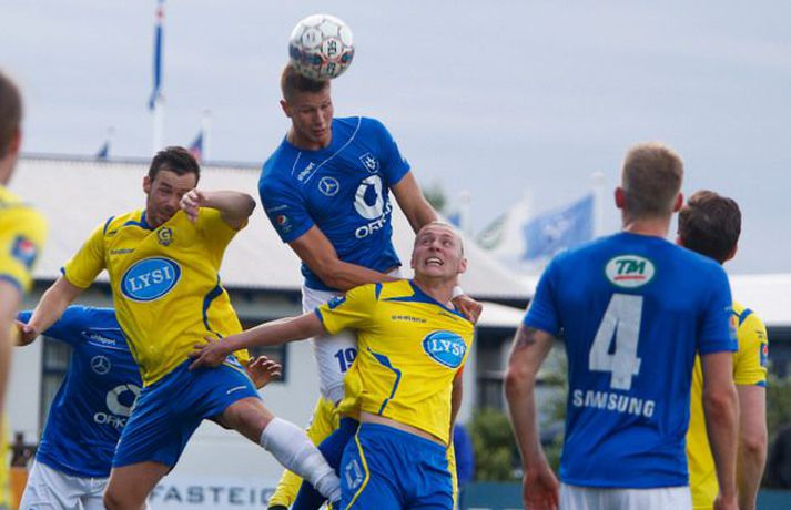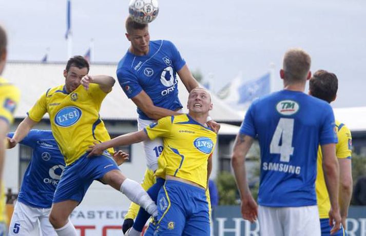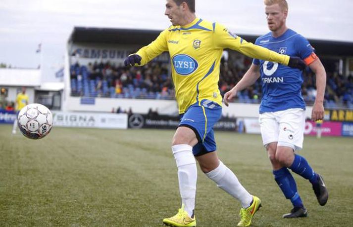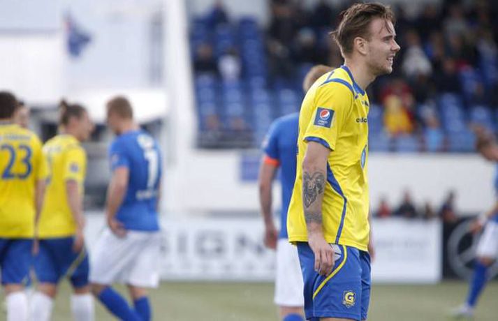 Stjarnan vann 5-0 stórsigur á spútnikliði Grindavíkur í 12.umferð Pepsi-deildarinnar í kvöld. Stjarnan lyftir sér þar með upp í 2.sæti deildarinnar og fer uppfyrir Grindvíkinga á markatölu. Fyrsta markið kom strax eftir 45 sekúndur þegar Baldur Sigurðsson skoraði af harðfylgi í teignum. Grindvíkingar vildu meina að brotið hefði verið á Kristijan Jajalo markverði þeirra og höfðu nokkuð til síns máls en Vilhjálmur Alvar dómari lét markið standa. Staðan í hálfleik var 1-0 en í síðari hálfleik brustu allar flóðgáttir og Stjörnumenn keyrðu yfir gestina. Guðjón Baldvinsson skoraði þrennu á tólf mínútna kafla snemma í hálfleiknum og Hilmar Árni Halldórsson bætti fimmta marki heimamanna við þegar rúmar tíu mínútur voru til leiksloka. 5-0 sigur Stjörnumanna staðreynd og Grindavík búið að fá á sig níu mörk í síðustu tveimur deildarleikjum.Af hverju vann Stjarnan?Stjörnumenn voru einfaldlega betri á öllum sviðum knattspyrnunnar í kvöld. Þeir voru grimmari, baráttuglaðari og tóku Grindvíkinga í ærlega kennslustund. Markið strax í upphafi sló Grindvíkinga út af laginu og Stjörnumenn hefðu hæglega getað skorað fleiri mörk í fyrri hálfleik. Í síðari hálfleik keyrðu heimamenn svo yfir gestina sem vissu ekki hvaðan á sig stóð veðrið. Það fór allt úrskeiðis sem hægt var hjá Grindvíkingum og Stjörnumenn áttu afar auðvelt með að skora gegn andlausu liði gestanna.Hverjir stóðu upp úr?Guðjón Baldvinsson skoraði þrjú mörk og var þar að auki sívinnandi í framlínu Stjörnunnar. Hilmar Árni Halldórsson er sífellt ógnandi og skoraði þar að auki gott mark í lokin. Hann ógnar auðvitað svo alltaf í föstum leikatriðum. Eyjólfur Héðinsson var frábær á miðju heimamanna og Baldur Sigurðsson og Alex Þór Hauksson voru fínir þar að auki. Í raun átti enginn Stjörnumaður slæman dag. Hjá Grindavík er varla hægt að taka neinn út sem stóð fyrir sínu. Jajalo varði í nokkur skipti en þurfti að sækja boltann fimm sinnum í netið. Það er þó erfitt að saka hann um slaka frammistöðu í mörkum Stjörnunnar.Hvað gekk illa?Það gekk allt illa hjá Grindavík. Baráttan, vinnusemin og leikgleðin sem þeir hafa sýnt í Pepsi-deildinni til þessa var ekki til staðar í dag og ljóst að Óli Stefán hefur verk að vinna fyrir næsta leik. Sóknarlega ógnuðu þeir nokkrum sinnum með skyndisóknum, sérstaklega í fyrri hálfleik, en í þeim síðari var afar lítið í gangi. Þeir söknuðu Björn Bryde úr vörninni og Andra Rúnari Bjarnasyni voru afar mislagðir fætur í framlínunni.Hvað gerist næst?Næst eiga Stjörnumenn leik í undanúrslitum Borgunarbikarsins gegn ÍBV sem þeir mæta svo á nýjan leik í Pepsi-deildinni á sunnudag. Báðir leikirnir fara fram á Samsung-vellinum í Garðabæ. Grindvíkingar fá Víking frá Reykjavík í heimsókn á mánudaginn eftir rúma viku. Þar kemur í ljós hvort Grindavíkurblaðran sé sprungin eða hvort eitthvað loft sé enn til staðar.Stjarnan (4-3-3) Haraldur Björnsson 6 – Jóhann Laxdal 7, Óttar Bjarni Guðmundsson 6, Daníel Laxdal 6, Jósef Kristinn Jósefsson 6 (´68 Hörður Árnason 6) – Alex Þór Hauksson 7, Baldur Sigurðsson 7, Eyjólfur Héðinsson 8 (´71 Máni Austmann Hilmarsson) – Hólmbert Aron Friðjónsson 5 (´46 Heiðar Ægisson 7), Guðjón Baldvinsson 9* (Maður leiksins), Hilmar Árni Halldórsson 6.Grindavík (5-4-1) Kristijan Jajalo 5 – Aron Freyr Róbertsson 4, Brynjar Ásgeir Guðmundsson 4, Matthías Örn Friðriksson 3, Fransisco Eduardo Cruz Lemaur 3, Marínó Axel Helgason 3 (´56 William Daniels 4) – Sam Hewson 4, Alexander Veigar Þórarinsson 5 (´68 Nemanja Latinovic 4), Gunnar Þorsteinsson 4, Milos Zeravica 3 (´87 Juan Manuel Ortiz Jimenez) – Andri Rúnar Bjarnason 3. Rúnar Páll: Stoltur af mínu liðiRúnar Páll Sigmundsson þjálfari Stjörnunnar var vitaskuld sáttur eftir 5-0 sigur sinna manna gegn spútnikliði Grindavíkur í kvöld. „Ég er mjög ánægður og stoltur af mínu liði. Það var gríðarlega mikil einbeiting og vinnusemi og við vorum þolinmóðir gegn þeim. Þeir lágu aftarlega og voru hættulegir í skyndisóknum fyrir hlé. En við vorum klókir og klárum þá svo feykivel í seinni hálfleik,“ sagði Rúnar Páll við Vísi eftir leikinn í kvöld. „Þetta er annar leikurinn í röð þar sem við höldum hreinu og Grindavík fékk nú ekki mörg færi í kvöld. Við erum að gera varnarvinnuna vel og það er gríðarleg vinnusemi í liðinu. Það er ekki hægt að vera annað en ánægður eftir svona leik eins og í kvöld. Stigin þrjú eru mikilvæg,“ bætti Rúnar við en Stjörnumenn eru nú í 2.sæti Pepsi-deildarinnar, þremur stigum á eftir Val sem á leik til góða. Guðjón Baldvinsson skoraði þrennu í kvöld og Rúnar Páll var ánægður með framherjann knáa í kvöld. „Hann var mjög góður í kvöld eins og allt liðið. Frábært fyrir hann að skora þrjú mörk og við hefðum getað gert fleiri miðað við færin sem við fengum. Frábær leikur í alla staði.“ Stjörnumenn eru nú þremur stigum á eftir Val sem eiga leik til góða gegn Ólsurum á þriðjudag. „Við verðum bara að hugsa um okkur núna. Næsti leikur er gegn ÍBV í bikarnum og þar ætlum við að eiga góðan leik og komast í úrslitaleikinn. Það er næsta verkefni,“ sagði Rúnar Páll að lokum. Óli Stefán: Í fyrsta sinn sem ég skammast mín fyrir mitt liðvísir/andri marinó„Hvar skal byrja? Í dag vantaði allt. Grunnvinnan var ekki til staðar, við vorum undir í krafti og baráttu. Það var enginn leiðtogi inni á vellinum, við vorum huglausir og agalausir. Við fórum út úr öllum þeim gildum sem við höfum unnið eftir, það var í raun allt að í dag. Þetta er í fyrsta sinn sem ég skammast mín fyrir liðið mitt, svo hörmulegt var