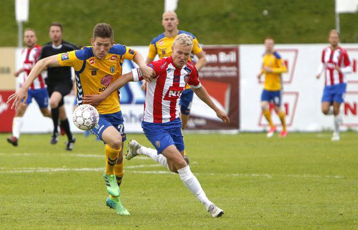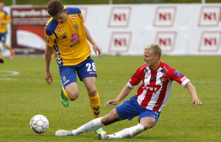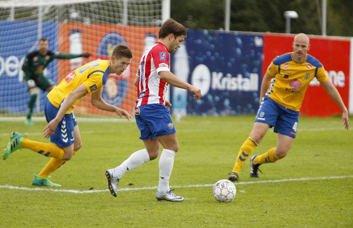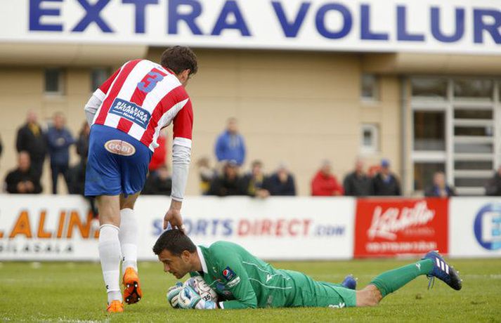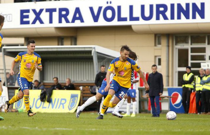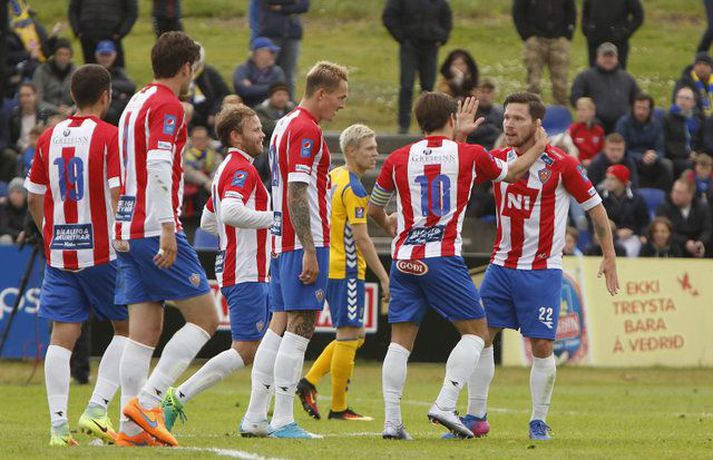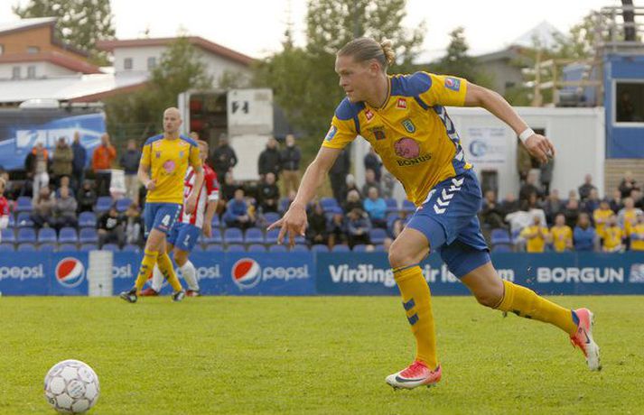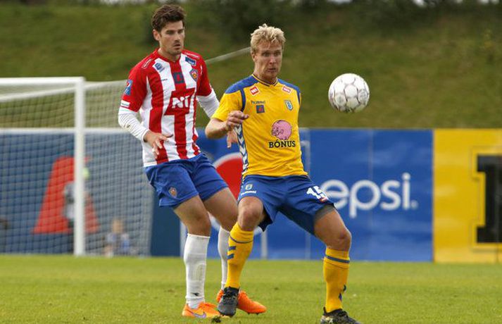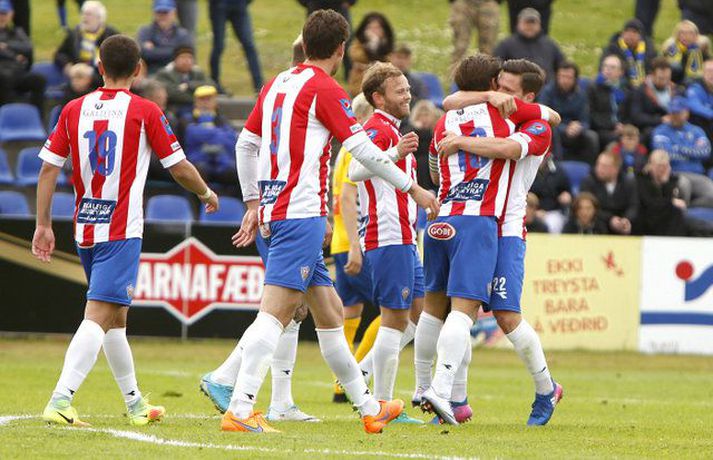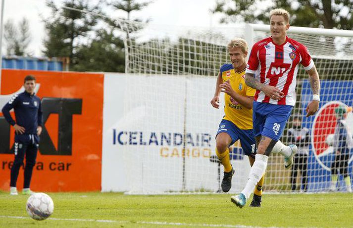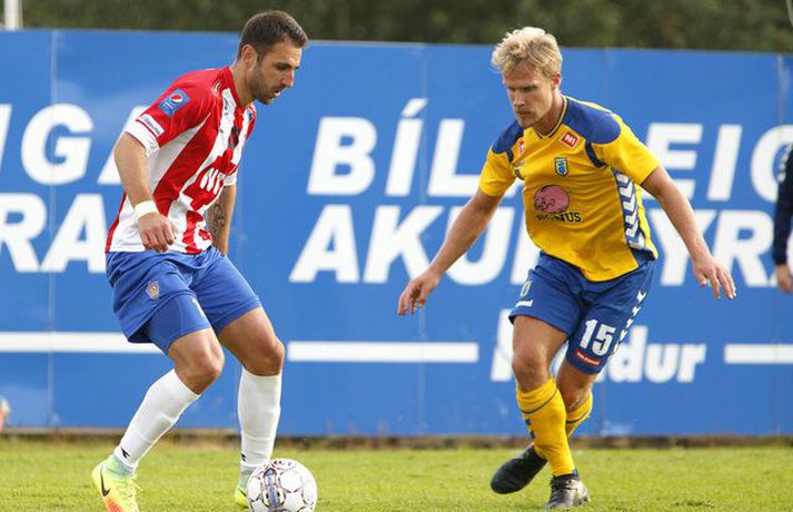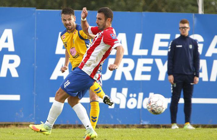 Fjölnir og KA skildu jöfn í Grafarvoginum 2-2 í hörkuleik fyrr í kvöld í 14. umferð Íslandsmótsins í knattspyrnu. Fjölnir er líklega svekktara liðið enda komust þeir í 2-0 eftir miðjan fyrri hálfleik en KA menn sýndu mikinn karakter í að jafna metin í upphafi seinni hálfleiks. Þar skipti miklu máli fyrir þá að ná marki rétt fyrir hálfleik. Leikurinn byrjaði mjög vel og náðu bæði lið að skapa sér sóknir en mið leikmanna var ekki alveg rétt stillt og þurftu markverðir liðanna lítið að hafa sig í frammi. Á 27. mínútu dró til tíðinda en þá rann varnarmaður KA í votu grasinu sem varð til þess að Linus Olsson náði boltanum og renndi honum á Ingimund Níels Óskarsson sem var þá kominn einn á móti markverði. Hann skrúfaði boltann í fjærhornið og kom heimamönnum í 1-0. 11 mínútum síðar gerðu varnarmenn KA sig seka um hræðileg mistök þegar Callum Williams reyndi að vippa boltanum yfir Ægir Jarl Jónasson sem tók boltann niður og sendi gullfallega sendingu á kollinn á Þóri Guðjónss. sem stangaði knöttinn í netið. Barnalegur varnarleikur hjá KA. Undir lok hálfleiksins fengu KA menn svo aukaspyrnu rétt fyrir utan vítateig sem Hallgrímur Mar Steingrímsson framkvæmdi og framkvæmdi vel en hann skrúfaði boltann með jörðinni framhjá veggnum og markverði Fjölnis og gífurlega mikilvægt mark komið hjá KA rétt fyrir hálfleik. Hálfleikurinn var svo 10 mínútna gamall þegar Hrannar Björn Steingrímsson þrumaði knettinum í netið óverjandi fyrir Þórð Ingason marvörð Fjölnis. Eftir markið harðnaði leikurinn og dó eilítið niður. Bæði lið vildu alls ekki tapa leiknum en undir lokin litu nokkur hálffæri ljós sem hefðu getað unnið leikinn fyrir bæði lið. En jafntefli niðurstaðan og líklega sanngjörn í ljósi hvernig leikurinn þróaðist.Afhverju endaði leikurinn með jafntefli?Bæði lið sýndu góða takta í dag og hefðu með eilítið betri færa nýtingu hefði annaðhvort liðið getað fengið öll þrjú stigin. Einnig þá hefði betri einbeiting í vörn KA líklega skilað þeim þremur stigum en á móti kemur að karakter þeirra bjargaði þeim þegar á reyndi. Fjölnismenn hefðu getað haldið kraftinum sem þeir voru með í fyrri hálfleik til að ná í stigin þrjú en eftir að leikurinn harðnaði og jafnaðist út varð fátt um sóknartilburði.Hvað gekk illa?Það gekk illa hjá báðum liðum að halda marki sínu hreinu. Mörkin sem KA fékk á sig voru virikilega klaufaleg og auðveldlega hægt að koma í veg fyrir þau en Fjölnismenn hefðu einnig með smá einbeitingu getað komið í veg fyrir mörk KA manna.Bestu menn vallarins?Ægir Jarl Jónasson var bestur í liði Fjölnis hann lagði upp seinna mark liðsins og átti part í flestum sóknartilburðum þeirra ásamt því að sinna varnarvinnunni vel. Fjölnisliðið lék samt heilt yfir vel eins og KA. Hjá KA er hægt að taka Hallgrím Mar út en ásamt því að skora eitt mark átti hann góða spretti sóknarlega.Hvað gerist næst?Liðin ná að ýta sér einu stigi fjær botni deildarinnar en hefðu líklega bæði fegin tekið þrjú stig. KA menn taka næst á móti Stjörnunni í erfiðum leik en þurfa að ná að halda vörn sinni góðri eins og á móti FH um daginn. Fjölnir hefði átt að mæta FH í næstu umferð en þeim leik hefur verið frestað og ekki er búið að ákveða leikdag. Þeir mæta hinsvegar í þar næstu umferð Stjörnunni á heimavelli. Bæði lið eiga því erfiða leiki fyrir höndum og þurfa að standa sig heldur betur í þeim til að sogast ekki niður í fallbaráttu.Maður leiksins: Ægir Jarl Jónasson, sýndi góðan leik á miðjunni og lagði upp eitt mark.Águst Þór Gylfason: Erum ekki endilega að spá í fallbaráttunniÞjálfari Fjölnis var ekki sáttur við að fá einungis eitt stig úr leik hans mann við KA fyrr í dag. „Ég get ekki sætt mig við stigið, eins og leikurinn þróaðist þá hefði ég viljað klára hann. Við komumst í 2-0 og skorum frábær mörk og eigum gott upphlaup sem hefði getað klárað leikinn. Aftur á móti fáum við mark í andlitið rétt fyrir hálfleik og mjög erfitt að koma inn í seinni hálfleikinn eftir það og að sama skapi gerðu KA menn vel í að koma af krafti út í hálfleik. Við hefðum kannski átt að klára þetta í fyrri hálfleik en úr því sem komið var er eitt stig fínt í hörkuleik. Flottur leikur og mikið aksjón. KA menn spiluðu vel eins og við sem áttum góða kafla“. Ágúst var ekki sammála því að leikurinn hafi koðnað niður og einkennst af því að hvorugt lið hafi verið að reyna að verja stigið. „Mér fannst bæði lið hafa fengið góð færi þó það hafi aðeins dáið niður. Það var allt búið að vera á fullu í 70 mínútur. Bæði lið lögðu sig 100% fram og komu færi hérna í lokin sem hefðu getað klárað leikinn“. Ágúst var spurður að því hvort að hans menn væru komnir með áhyggjur af því að vera að dragast niður í fallbaráttu. „Nei við erum ekkert endilega að spá í það. Við fengum eitt stig í dag sem og liðin fyrir neðan okkur og það er stutt í KA og stutt í allt. Við verðum að halda áfram að spila eins og í dag og þá eigum við eftir að fá fullt af stigum í viðbót“.Srdjan Tufegdzic: Stutt niður og í efri hlutann„Ég held að við getum verið ánægðir með stigið sem við fengum í dag. Eftir að hafa lent 2-0 undir og sýnt vilja og karakter eins og við gerðum til að jafna leikinn og vera nálægt því að vinna leikinn í endann þá verðum við að vera ánægðir með eitt stig“, sagði þjálfari KA manna eftir leik liðsins við Fjölni fyrr í dag. Hann var spurður út í mörkin sem liðið hans fékk á sig í dag en þau voru mjög klaufaleg. „Já það er sama sagan eins og í allt sumar en við ætl