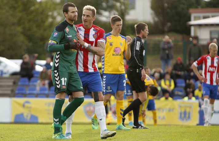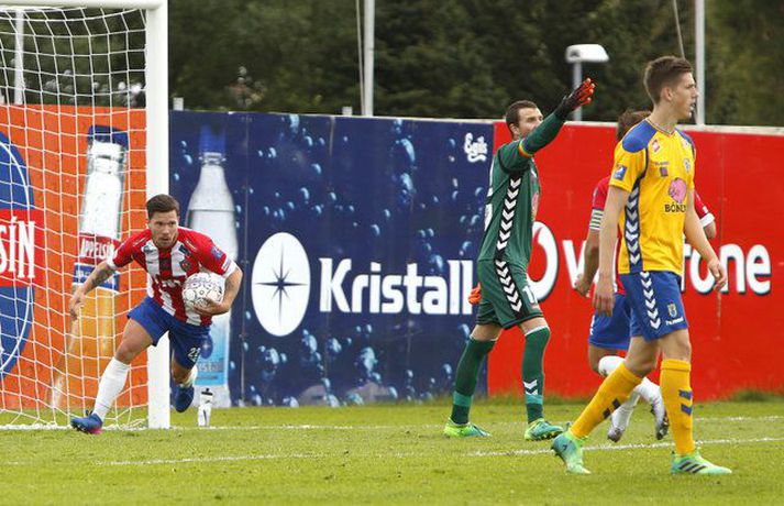 Umfjöllun, viðtöl, myndir og einkunnir: Fjölnir - KA 2-2 | Stigunum bróðurlega skipt í Grafarvoginum Árni Jóhannsson skrifar 9. ágúst 2017 20:45 KA-menn fagna jöfnunarmarki Hrannars Björns Steingrímssonar. Vísir/Andri Marinó Fjölnir og KA skildu jöfn í Grafarvoginum 2-2 í hörkuleik fyrr í kvöld í 14. umferð Íslandsmótsins í knattspyrnu. Fjölnir er líklega svekktara liðið enda komust þeir í 2-0 eftir miðjan fyrri hálfleik en KA menn sýndu mikinn karakter í að jafna metin í upphafi seinni hálfleiks. Þar skipti miklu máli fyrir þá að ná marki rétt fyrir hálfleik. Leikurinn byrjaði mjög vel og náðu bæði lið að skapa sér sóknir en mið leikmanna var ekki alveg rétt stillt og þurftu markverðir liðanna lítið að hafa sig í frammi. Á 27. mínútu dró til tíðinda en þá rann varnarmaður KA í votu grasinu sem varð til þess að Linus Olsson náði boltanum og renndi honum á Ingimund Níels Óskarsson sem var þá kominn einn á móti markverði. Hann skrúfaði boltann í fjærhornið og kom heimamönnum í 1-0. 11 mínútum síðar gerðu varnarmenn KA sig seka um hræðileg mistök þegar Callum Williams reyndi að vippa boltanum yfir Ægir Jarl Jónasson sem tók boltann niður og sendi gullfallega sendingu á kollinn á Þóri Guðjónss. sem stangaði knöttinn í netið. Barnalegur varnarleikur hjá KA. Undir lok hálfleiksins fengu KA menn svo aukaspyrnu rétt fyrir utan vítateig sem Hallgrímur Mar Steingrímsson framkvæmdi og framkvæmdi vel en hann skrúfaði boltann með jörðinni framhjá veggnum og markverði Fjölnis og gífurlega mikilvægt mark komið hjá KA rétt fyrir hálfleik. Hálfleikurinn var svo 10 mínútna gamall þegar Hrannar Björn Steingrímsson þrumaði knettinum í netið óverjandi fyrir Þórð Ingason marvörð Fjölnis. Eftir markið harðnaði leikurinn og dó eilítið niður. Bæði lið vildu alls ekki tapa leiknum en undir lokin litu nokkur hálffæri ljós sem hefðu getað unnið leikinn fyrir bæði lið. En jafntefli niðurstaðan og líklega sanngjörn í ljósi hvernig leikurinn þróaðist.Afhverju endaði leikurinn með jafntefli?Bæði lið sýndu góða takta í dag og hefðu með eilítið betri færa nýtingu hefði annaðhvort liðið getað fengið öll þrjú stigin. Einnig þá hefði betri einbeiting í vörn KA líklega skilað þeim þremur stigum en á móti kemur að karakter þeirra bjargaði þeim þegar á reyndi. Fjölnismenn hefðu getað haldið kraftinum sem þeir voru með í fyrri hálfleik til að ná í stigin þrjú en eftir að leikurinn harðnaði og jafnaðist út varð fátt um sóknartilburði.Hvað gekk illa?Það gekk illa hjá báðum liðum að halda marki sínu hreinu. Mörkin sem KA fékk á sig voru virikilega klaufaleg og auðveldlega hægt að koma í veg fyrir þau en Fjölnismenn hefðu einnig með smá einbeitingu getað komið í veg fyrir mörk KA manna.Bestu menn vallarins?Ægir Jarl Jónasson var bestur í liði Fjölnis hann lagði upp seinna mark liðsins og átti part í flestum sóknartilburðum þeirra ásamt því að sinna varnarvinnunni vel. Fjölnisliðið lék samt heilt yfir vel eins og KA. Hjá KA er hægt að taka Hallgrím Mar út en ásamt því að skora eitt mark átti hann góða spretti sóknarlega.Hvað gerist næst?Liðin ná að ýta sér einu stigi fjær botni deildarinnar en hefðu líklega bæði fegin tekið þrjú stig. KA menn taka næst á móti Stjörnunni í erfiðum leik en þurfa að ná að halda vörn sinni góðri eins og á móti FH um daginn. Fjölnir hefði átt að mæta FH í næstu umferð en þeim leik hefur verið frestað og ekki er búið að ákveða leikdag. Þeir mæta hinsvegar í þar næstu umferð Stjörnunni á heimavelli. Bæði lið eiga því erfiða leiki fyrir höndum og þurfa að standa sig heldur betur í þeim til að sogast ekki niður í fallbaráttu.Maður leiksins: Ægir Jarl Jónasson, sýndi góðan leik á miðjunni og lagði upp eitt mark.Águst Þór Gylfason: Erum ekki endilega að spá í fallbaráttunniÞjálfari Fjölnis var ekki sáttur við að fá einungis eitt stig úr leik hans mann við KA fyrr í dag. „Ég get ekki sætt mig við stigið, eins og leikurinn þróaðist þá hefði ég viljað klára hann. Við komumst í 2-0 og skorum frábær mörk og eigum gott upphlaup sem hefði getað klárað leikinn. Aftur á móti fáum við mark í andlitið rétt fyrir hálfleik og mjög erfitt að koma inn í seinni hálfleikinn eftir það og að sama skapi gerðu KA menn vel í að koma af krafti út í hálfleik. Við hefðum kannski átt að klára þetta í fyrri hálfleik en úr því sem komið var er eitt stig fínt í hörkuleik. Flottur leikur og mikið aksjón. KA menn spiluðu vel eins og við sem áttum góða kafla“. Ágúst var ekki sammála því að leikurinn hafi koðnað niður og einkennst af því að hvorugt lið hafi verið að reyna að verja stigið. „Mér fannst bæði lið hafa fengið góð færi þó það hafi aðeins dáið niður. Það var allt búið að vera á fullu í 70 mínútur. Bæði lið lögðu sig 100% fram og komu færi hérna í lokin sem hefðu getað klárað leikinn“. Ágúst var spurður að því hvort að hans menn væru komnir með áhyggjur af því að vera að dragast niður í fallbaráttu. „Nei við erum ekkert endilega að spá í það. Við fengum eitt stig í dag sem og liðin fyrir neðan okkur og það er stutt í KA og stutt í allt. Við verðum að halda áfram að spila eins og í dag og þá eigum við eftir að fá fullt af stigum í viðbót“.Srdjan Tufegdzic: Stutt niður og í efri hlutann„Ég held að við getum verið ánægðir með stigið sem við fengum í dag. Eftir að hafa lent 2-0 undir og sýnt vilja og karakter eins og við gerðum til að jafna leikinn og vera nálægt því að vinna leikinn í endann þá verðum við að vera ánægðir með eitt st
