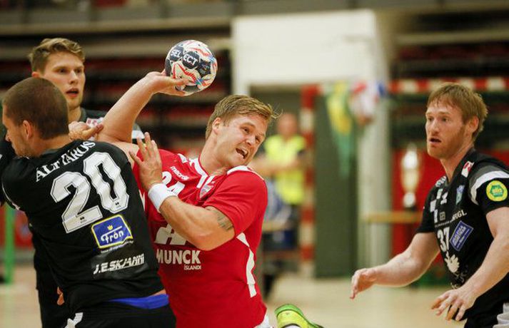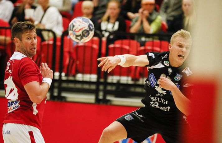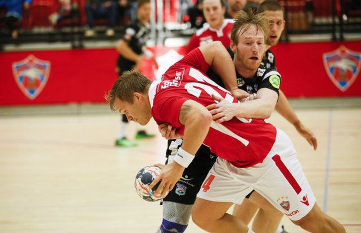 Umfjöllun, viðtöl og myndir: Valur - Afturelding 21-24 | Mosfellingar unnu Meistarakeppnina Stefán Árni Pálsson skrifar 29. ágúst 2017 21:30 Ernir Hrafn Arnarson skoraði fimm mörk fyrir Aftureldingu. vísir/eyþór Afturelding vann góðan sigur á Íslands- og bikarmeisturum Vals í meistarakeppni HSÍ í Valshöllinni í kvöld en leikurinn fór 24-21. Markarskor Aftureldingar dreifðist en það var samt Ernir Hrafn Arnarson skoraði sex mörk fyrir Mosfellinga. Það var töluverður haustbragur á byrjun leiksins hjá Íslands- og bikarmeisturum Vals en Afturelding komst í 7-2 eftir rúmlega tíu mínútna leik. Það gekk ekkert upp sóknarlega hjá Val í byrjun leiksins. Valsmenn voru lengi í gang en það kom að lokum og var staðan 12-12 í hálfleik. Þegar leið á fyrri hálfleikinn fór varnarleikur heimamanna í gang og markvarslan kom í leiðinni. Valsmenn náðu upp forskoti Aftureldingar með hröðum sóknum og sá maður fína takta frá liðinu undir lok hálfleiksins. Á sama tíma voru gestirnir úr Mosfellsbænum ekkert sérstakir seinnihlutann í hálfleiknum. Leikurinn var mjög jafn í síðari hálfleiknum og aldrei munaði meira en þremur mörkum á liðunum. Afturelding var sterkari undir lokin og vann að lokum þriggja marka sigur. Valsmenn fóru mjög illa með dauðafæri og misnotuðu til að mynda þrjú vítaskot í seinni hálfleiknum. Afturelding vann því meistarakeppni HSÍ árið 2017.Mörk Vals: Anton Rúnarsson 5/2, Magnús Óli Magnússon 4, Vignir Stefánsson 4, Ásgeir Vignisson 3, Arnór Snær Óskarsson 2/2, Alexander Örn Júlíusson 1, Sveinn Jose Rivera 1, Stiven Tobar Valencia 1.Mörk Aftureldingar: Ernir Hrafn Arnarson 6/2, Einar Ingi Hrafnsson 4, Gunnar Þórsson 4, Mikk Pinnonen 4, Elvar Ásgeirsson 2, Gestur Ólafur Ingvarsson 2, Árni Bragi Eyjólfsson 2, Þorgrímur Smári Ólafsson 1. Einar Andri: Þessi titill skiptir okkur máli„Ég er mjög ánægður með liðið og rosalega ánægður með það að vinna loksins titil,“ segir Einar Andri Einarsson, þjálfari Aftureldingar, eftir sigurinn í kvöld. „Þetta er fyrsti titilinn sem er í boði á þessu tímabili. Hann er kannski ekki sá stærsti en hann skiptir okkur máli. Það var gaman að taka þátt í þessum leik og Valsararnir mjög flottir og erfiðir við að eiga í kvöld.“ Einar segir að bæði lið hafi komið inn í þennan leik af fullum krafti. „Við erum að fara spila Evrópuleiki næstu tvo laugardaga og því var þetta mikilvægur leikur í því sambandi.“ Hann segir að það hafi verið svolítill haustbragur á liðinu að undanförnu en hann hafi loksins séð alvöru spilamennsku í kvöld. „Núna eru menn að stíga upp og við erum á réttri leið. Það eru allir að koma upp úr meiðslum og svona.“ Snorri: Klúðruðum of mörgum dauðafærum„Bara no comment,“ segir Snorri Steinn Guðjónsson, þjálfari Vals, eftir leikinn í kvöld þegar hann var spurður af hverju hann spilaði ekki einu sekúndu í leiknum í kvöld. „Ég er frekar ánægður með baráttuna í strákunum. Við byrjuðum leikinn mjög illa en strákarnir sýndu karakter og komu til baka. Það var jákvætt. Í seinni hálfleik förum við illa að ráði okkar og brennum til að mynda af þremur vítaköstum og nokkrum hraðaupphlaupum.“ Ýmir Örn Gíslason og Orri Freyr Gíslason voru ekki með Val í kvöld en þeir mynduðu sterkasta varnarduett landsins á síðasta tímabili. „Þeir eru báðir meiddir,“ segir Snorri sem var mjög stuttorður í viðtalinu. Valsmenn hafa verið með japanskan leikmenn til reynslu síðustu daga. „Það kemur í ljóst á næstu dögum hvort við semjum við hann. Hann er fínn leikmaður og gæti styrkt liðið.“Eyþór Árnason, ljósmyndari Fréttablaðsins og Vísis, var í Valshöllinni í kvöld og tók myndirnar sem má sjá hér að neðan. Einar Andri hvetur sína menn áfram.vísir/eyþórSnorri Steinn ræðir við leikmenn Vals.vísir/eyþór Olís-deild karla