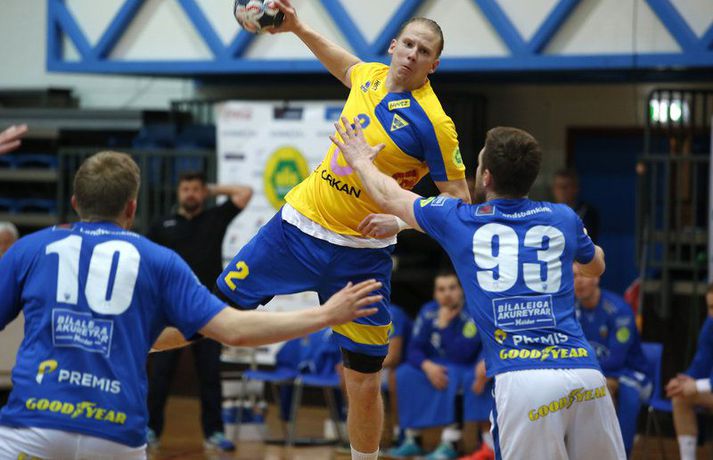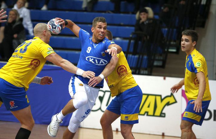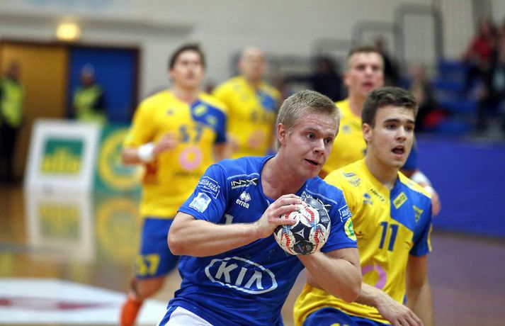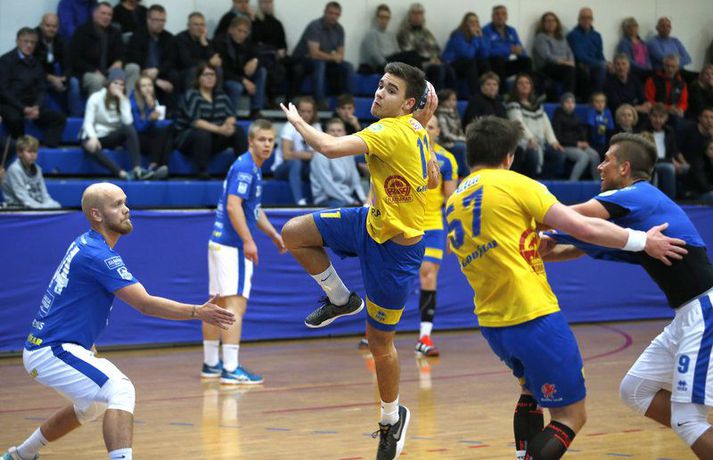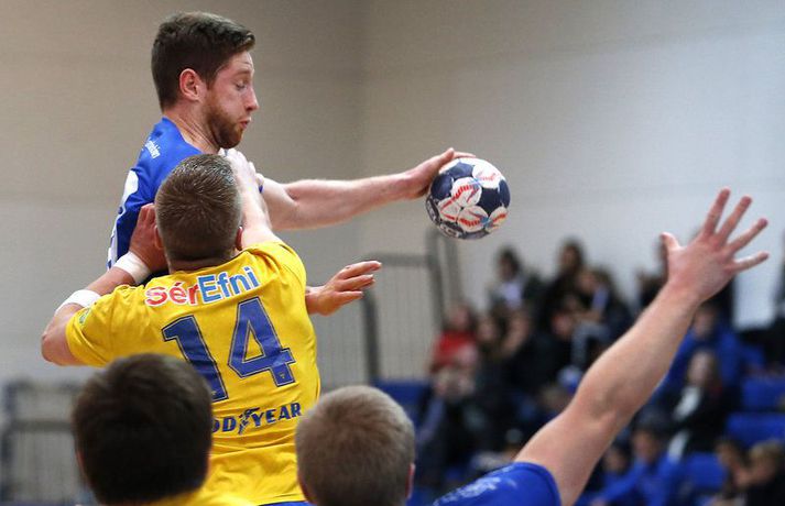 Umfjöllun og viðtöl: Fram - Grótta 28-24 | Seltirningar enn án stiga Þór Símon Hafþórsson skrifar 15. október 2017 22:30 Fram vann fjögurra marka sigur á Gróttu 28-24 í lokaleik dagsins í Olís-deild karla en þetta var annar sigur Fram í síðustu þremur leikjum á meðan Grótta er enn án stiga.Stefán Karlsson, ljósmyndari Vísis og Fréttablaðsins, var á leiknum og náði þessum myndum hér fyrir ofan. Seltirningar voru með frumkvæðið fyrstu mínúturnar og leiddu þegar fyrri hálfleikur var hálfnaður en Framarar unnu sig inn í leikinn og náðu að jafna undir lok fyrri hálfleik í stöðunni 13-13. Í seinni hálfleik voru það heimamenn sem voru sterkari strax frá fyrstu mínútu og náðu þegar mest var fimm marka forskoti en gerðu nóg til að skila sigrinum. Fram og Grótta mættust í Safamýrinni í kvöld í hörkuleik sem endaði með, 28-24, sigri Fram í Olís deild karla. Leikurinn var jafn framan af en staðan var 13-13 í hálfleik. Fram tók þó völdin í þeim seinni er Arnar Birkir fékk að ganga lausum hala í búningi Fram en hann skoraði fjöldann allan af mörkum á meðan sóknarleikur Gróttu stóð í stað. Að lokum landaði Fram sigrinum og er liðið nú með fimm stig en Grótta er áfram í botnsætinu, stigalaust eftir sex umferðir.Af hverju vann Fram? Fram spilaði betri sóknar og varnarleik og þá sérstaklega í seinni hálfleik. Þar að auki var tók markvarsla Fram mikinn vaxtarkipp undir lok leiks er Viktor Gísli lokaði búrinu á síðustu mínútunum. Fram náði líka að loka á sóknarleik Gróttu en gestirnir skoruðu níu mörk af vítapunktinum af 24 mörkum liðsins á meðan Fram spilaði betri og beittari sóknarleik.Hverjir stóðu upp úr? Arnar Birkir Hálfdánarson átti stórleik fyrir Fram í seinni hálfleik er hann tók upp á því að negla boltanum svo fast að Hreiðar Levý kom engum vörnum við. Grótta sá enga leið til að stoppa hann og voru mörkin hans stór ástæða þess að Fram tók yfir leikinn í seinni. Markvarslan var fín hjá báðum liðum en á meðan Hreiðar Levý var jafngóður í gegnum leikinn hjá Gróttu tók markvarslan mikinn vaxtarkipp hjá Viktori Gísla í búningi Fram sem lokaði markinu vel undir restina. Svo er ekki hægt annað en að nefna Maximillian Jonsson en Svíinn átti erfitt uppdráttar í sóknarleik Gróttu en sem vítaskytta olli hann engum vonbrigðum. Hann fór á punktinn níu sinnum og skilaði boltanum í markið í öll skiptin.Hvað gekk illa? En það gerir voða lítið fyrir þig þegar 1/3 af mörkunum þínum er að koma af vítalínunni. Sókn Gróttu þurfti nauðsynlega á fleiri mönnum til að stíga upp en á meðan Maximillian skoraði níu sinnum af punktinum var næst markahæstu leikmenn liðsins með einungis þrjú mörk, tveir talsins. Fram lokaði gjörsamlega á sóknarleik Gróttu sem verður að vera betri gegn Aftureldingu í næsta leik.Hvað gerist næst? Fram heimsækir Víking í Víkinni og ef liðið spilar svona ætti það að næla í sigur.Grótta á enn eftir að næla í sigur og fær Aftureldingu í heimsókn á Seltjarnarnesið.Kári Garðarsson: Fram var einu skrefi á undan okkur Kári Garðarson, þjálfari Gróttu, var ekki sáttur með sína menn í leikslok eftir að Grótta tapaði 28-24 í Safamýrinni í kvöld. „Við bjuggumst við hörkuleik og fengum það en Fram var skrefinu á undan okkur í seinni hálfleik. Arnar Birkir fór t.a.m. gjörsamlega á kostum í upphafi seinni og við réðum illa við hann.” Maximillian Jonsson skoraði níu mörk af vítapunktinum af níu mögulegum en þess fyrir utan var lokað á hann. En er ekki níu vítaskot vel yfir meðaltali?. „Það var örugglega yfir meðaltalinu en ég held að þetta hafi allt verið góðir vítadómar því þegar það er spilað fimm á móti fimm þá er mikið pláss. Það tókst oft ágætlega en það þarf massívari frammistöðu til að klára gott lið Fram,“ sagði Kári. Fram náði að taka margar sekúndur af klukkunni með löngum sóknum á síðustu mínútum leiksins en margir leikmenn Gróttu vildu sjá dómara stoppa klukkuna margoft en hún fékk þó að rúlla megnið af tímanum. „Þeir fengu ansi langar sóknir þegar þeir voru tveimur mörkum yfir og svo varði Hreiðar Levý í innkast sem gaf þeim nýja sókn. Það hefði mátt hraða leikinn þá og grípa betur inn í.“ Hann segir að Grótta verði að leggja hart af sér næstu vikurnar en næsti leikur liðsins er gegn Aftureldingu. „Það gefur okkur ekkert að næstum-því-vinna-leiki. Það er á hreinu. Þurfum að halda áfram að vinna í okkar hlutum og það mun skila okkur sigri á endanum.“Guðmundur Helgi: Vorum klárir í hörku slag „Frábær sigur hjá mínum mönnum. Ánægður hvernig við komum til leiks og hvernig við vorum klárir í hörku slag,“ sagði Guðmundur Helgi, þjálfari Fram, kátur í leikslok. Fram tókst að loka á flest allar sóknaraðgerðir Gróttu í seinni hálfleik en þó gáfu þeir frá sér níu vítaskot sem Maximillian Jonsson nýtti vel með 100% nýtingu. „Hann er með níu af níu af punktinum en við náðum að loka á allt hitt þannig við erum bara ánægðir með það.“ Hann vildi lítið tjá sig um fjöldann af þessum vítum. „Það má deila um fullt af þessum vítum. Þetta var full mikið og ef ég hefði fengið 2-3 víti á móti þá hefði ég verið sáttur en svona er handboltinn.“ Næsti leikur Fram er gegn Víkingum og er Guðmundur vægast sagt bjartsýnn. „Ef menn eru svona stemmdir þá leggst sá leikur bara vel í mig. Við erum klárir í allt.“ Arnar Birkir Hálfdánarson var í fantaformi í kvöld og skoraði 10 mörk fyrir Fram. Guðmundur var af sjálfsögðu ánægður með hans framlag. „Þegar hann dettur í þetta stuð þá er erfitt að stoppa hann. Hann var ekki með góða nýtingu í fyrri h