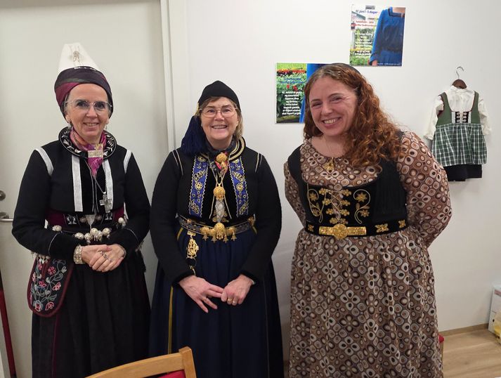 Hátíðin hófst í gær á Selfossi í sal eldri borgara í Grænumörk 5 með fjölbreyttri dagskrá en dagskráin í dag hjá Byggðasafni Árnesinga á Eyrarbakka í Húsinu hefst klukkan 14:00 en þá verður meðal annars farin skrúðganga með fornbílum í Sjóminjasafnið en þar mun Lýður Pálsson, safnstjóri og Ásmundur Kristjánsson gullsmiður fjalla um muni úr silfursjóði safnsins. Eyrún Olsen mun opna hátíðina á Eyrarbakka. Og þú átt von á góðri þátttöku í skrúðgöngunni ef að verðið verður þannig? „Að sjálfsögðu, þetta verður svo gaman. Þetta hefur ekki verið gert áður mér vitanlega,“ segir Eyrún. Guðrún Hildur klæðskeri hjá Annríki, sem er fyrirtæki, sem sérhæfir sig í öllu, sem við kemur íslenskum þjóðbúningum segir að það sé mikill áhugi í þjóðfélaginu á öllu í kringum þjóðbúninga og gerð þeirra. „Hún er bara búin að vera góð lengi en nú erum við bara að sjá nýja kynslóðir því yngra fólkið er að koma inn og það er greinilega áhugi þar og við þurfum að vinna svolítið með það,“ segir Guðrún Hildur. Kátar og hressar konur í þjóðbúningunum sínum. Magnús Hlynur Hreiðarsson Og Eyrún bætir við. „Þetta er alveg klárlega á uppleið enda er þetta okkar arfleifð rétt eins og tungumálið okkar, þá er fatnaðurinn okkar arfleifð okkar.“ Mikil aðsókn var að þjóðbúningasýningunni í Grænumörk á Selfossi í gær.Magnús Hlynur Hreiðarsson