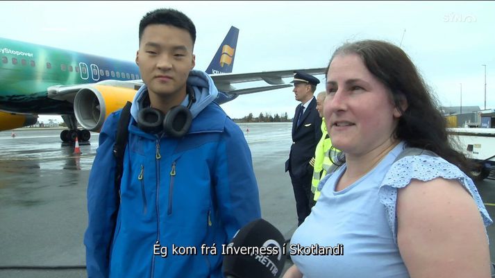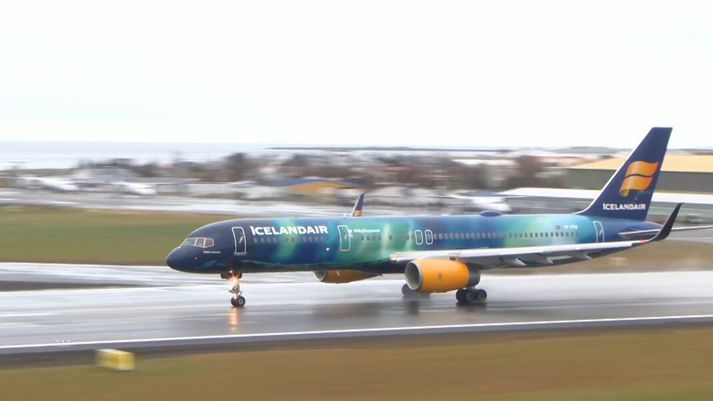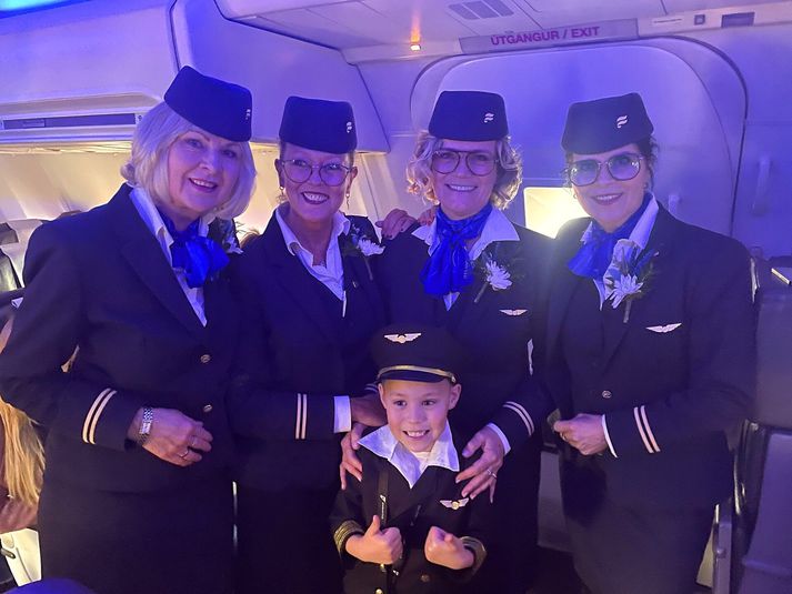 Í fréttum Sýnar fórum við í kveðjuflug farþegaþotu. Það má alveg kalla þá flugnörda sem streymdu í hádeginu um borð í 757-þotuna Heklu Aurora. Kannski voru fáir samt spenntari en hinn fimm ára Hermann Steinn Hermannsson sem mætti í flugstjórabúningi og sýndi af sér mikla kæti. -Hversvegna ertu svona glaður? „Út af því að ég er að fara í Heklu Auroru. Hún er uppáhaldsflugvélin mín. Hún er svo stór,“ sagði fimm ára guttinn. Hekla Aurora í flugtaksbruni á Reykjavíkurflugvelli í dag.Sigurjón ólason Icelandair lét mála hana í litum norðurljósanna fyrir áratug og fyrir það hefur hún hlotið frægð innan hins alþjóðlega flugheims. „Það hefur verið gríðarlegur áhugi. Og við sjáum það hér. Hér eru Íslendingar en síðast en ekki síst erlendir aðilar sem koma sérstaklega til landsins til að fara þetta tiltekna flug,“ sagði Guðmundur Tómas Sigurðsson, flugrekstrarstjóri Icelandair. Guðmundur Tómas Sigurðsson, flugrekstrarstjóri Icelandair, en hann er jafnframt flugstjóri á 757-þotum félagsins.Sigurjón Ólason Af um 140 farþegum voru um 70 útlendingar sem fóru sérstaka ferð til Íslands bara til að komast í þessa flugferð, meira að segja alla leið frá Singapore. „Ég kom frá Inverness í Skotlandi og það tók mig um átta tíma að komast hingað bara til að sjá Heklu,“ sagði Julie Balford. „Hún er undursamleg og er frábært tákn fyrir Ísland og er ein síðasta Boeing 757 í Evrópu,“ sagði sú skoska. Þau Julie Balford og Andy Zou komu bæði frá Bretlandseyjum í þeim eina tilgangi að komast í flugferð með Heklu Aurora.Sigurjón Ólason „Ég kom frá Lundúnum bara til að sjá þessa fegurðardís. Ég hef aldrei flogið með Icelandair fyrr. Ég hef fylgst með þessari vél,“ sagði Andy Zou. „Þetta er ein frægasta sjöfimmtíuogsjöan í heiminum,“ sagði flugrekstrarstjórinn Guðmundur Tómas. Og sá sem samdi við Icelandair um flugvélina árið 2004, Satoru Ohki frá Japan, var aftur mættur. „Ég sá um að koma þessari flugvél til Íslands fyrir 21 ári,“ sagði hann. Satoru Ohki frá Japan samdi um flugvélina við Icelandair fyrir 21 ári. Sigurjón Ólason Flugvallarslökkviliðið kvaddi með sérstakri heiðursbunu þegar þotan lagði upp í þetta sérstaka kveðjuflug sem Icelandair efndi til. Farið var í tvegga stunda útsýnisflug um landið undir stjórn Björns Magnúsar Sverrissonar og Guðrúnar Tómasdóttur, sem tóku meðal annars lágflug yfir Eyjafjörð og Akureyri. Þaðan var flogið yfir Bárðardal, Mývatnssveit og Jökulsá á Fjöllum. Austur á Héraði sáum við Dyrfjöllin og Egilsstaði og á hálendinu birtust Kverkfjöll og Dyngjujökull. Farþegarnir dáðust að útsýninu. Yfirflugfreyjan Sigurlaug Halldórsdóttir sagði farþegum í hátalarakerfið að Hekla Aurora væri fallegasta flugvél í heimi. Og unga flugáhugamanninum Hermanni var boðið að fara frammí. Í birtu norðurljósanna um borð. Flugfreyjurnar Sigurlaug Halldórsdóttir, Gunnhildur Mekkínósson, Kara Pálsdóttir og Jóna Lárusdóttir ásamt fimm ára guttanum Hermanni, sem réð sér vart fyrir kæti nýkominn úr flugstjórnarklefanum.KMU Í vetur verða aðeins fimm 757-þotur eftir í flota Icelandair. Horfur eru á að sú síðasta hverfi úr flota félagsins eftir tæpt ár. Norðurljósavélin Hekla Aurora, sem er elsta flugvél Icelandair, er hins vegar komin á endastöð eftir 31 árs sögu sem farþegaflugvél en hún rann út úr Boeingverksmiðjunum í júlí 1994. „Næst flýgur hún bara inn í sólarlagið í eyðimörkina í Bandaríkjunum og fer í niðurrif þar,“ sagði flugrekstrarstjóri Icelandair.