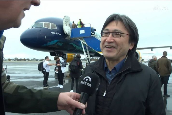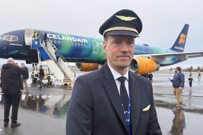 Flugnördar heims kveðja fegurstu flugvél Íslands Kristján Már Unnarsson skrifar 12. október 2025 22:12 Hinn fimm ára gamli Hermann Steinn mætti í flugstjórabúningi til að kveðja Norðurljósaflugvélina. Sigurjón Ólason Það er fullyrt að hún sé fegursta flugvél í heimi. Og hún er heimsfræg meðal flugnörda, sem flykktust til Íslands úr öllum heimshornum til að kveðja hana í dag. Í fréttum Sýnar fórum við í kveðjuflug farþegaþotu. Það má alveg kalla þá flugnörda sem streymdu í hádeginu um borð í 757-þotuna Heklu Aurora. Kannski voru fáir samt spenntari en hinn fimm ára Hermann Steinn Hermannsson sem mætti í flugstjórabúningi og sýndi af sér mikla kæti. -Hversvegna ertu svona glaður? „Út af því að ég er að fara í Heklu Auroru. Hún er uppáhaldsflugvélin mín. Hún er svo stór,“ sagði fimm ára guttinn. Hekla Aurora í flugtaksbruni á Reykjavíkurflugvelli í dag.Sigurjón ólason Icelandair lét mála hana í litum norðurljósanna fyrir áratug og fyrir það hefur hún hlotið frægð innan hins alþjóðlega flugheims. „Það hefur verið gríðarlegur áhugi. Og við sjáum það hér. Hér eru Íslendingar en síðast en ekki síst erlendir aðilar sem koma sérstaklega til landsins til að fara þetta tiltekna flug,“ sagði Guðmundur Tómas Sigurðsson, flugrekstrarstjóri Icelandair. Guðmundur Tómas Sigurðsson, flugrekstrarstjóri Icelandair, en hann er jafnframt flugstjóri á 757-þotum félagsins.Sigurjón Ólason Af um 140 farþegum voru um 70 útlendingar sem fóru sérstaka ferð til Íslands bara til að komast í þessa flugferð, meira að segja alla leið frá Singapore. „Ég kom frá Inverness í Skotlandi og það tók mig um átta tíma að komast hingað bara til að sjá Heklu,“ sagði Julie Balford. „Hún er undursamleg og er frábært tákn fyrir Ísland og er ein síðasta Boeing 757 í Evrópu,“ sagði sú skoska. Þau Julie Balford og Andy Zou komu bæði frá Bretlandseyjum í þeim eina tilgangi að komast í flugferð með Heklu Aurora.Sigurjón Ólason „Ég kom frá Lundúnum bara til að sjá þessa fegurðardís. Ég hef aldrei flogið með Icelandair fyrr. Ég hef fylgst með þessari vél,“ sagði Andy Zou. „Þetta er ein frægasta sjöfimmtíuogsjöan í heiminum,“ sagði flugrekstrarstjórinn Guðmundur Tómas. Og sá sem samdi við Icelandair um flugvélina árið 2004, Satoru Ohki frá Japan, var aftur mættur. „Ég sá um að koma þessari flugvél til Íslands fyrir 21 ári,“ sagði hann. Satoru Ohki frá Japan samdi um flugvélina við Icelandair fyrir 21 ári. Sigurjón Ólason Flugvallarslökkviliðið kvaddi með sérstakri heiðursbunu þegar þotan lagði upp í þetta sérstaka kveðjuflug sem Icelandair efndi til. Farið var í tvegga stunda útsýnisflug um landið undir stjórn Björns Magnúsar Sverrissonar og Guðrúnar Tómasdóttur, sem tóku meðal annars lágflug yfir Eyjafjörð og Akureyri. Þaðan var flogið yfir Bárðardal, Mývatnssveit og Jökulsá á Fjöllum. Austur á Héraði sáum við Dyrfjöllin og Egilsstaði og á hálendinu birtust Kverkfjöll og Dyngjujökull. Farþegarnir dáðust að útsýninu. Yfirflugfreyjan Sigurlaug Halldórsdóttir sagði farþegum í hátalarakerfið að Hekla Aurora væri fallegasta flugvél í heimi. Og unga flugáhugamanninum Hermanni var boðið að fara frammí. Í birtu norðurljósanna um borð. Flugfreyjurnar Sigurlaug Halldórsdóttir, Gunnhildur Mekkínósson, Kara Pálsdóttir og Jóna Lárusdóttir ásamt fimm ára guttanum Hermanni, sem réð sér vart fyrir kæti nýkominn úr flugstjórnarklefanum.KMU Í vetur verða aðeins fimm 757-þotur eftir í flota Icelandair. Horfur eru á að sú síðasta hverfi úr flota félagsins eftir tæpt ár. Norðurljósavélin Hekla Aurora, sem er elsta flugvél Icelandair, er hins vegar komin á endastöð eftir 31 árs sögu sem farþegaflugvél en hún rann út úr Boeingverksmiðjunum í júlí 1994. „Næst flýgur hún bara inn í sólarlagið í eyðimörkina í Bandaríkjunum og fer í niðurrif þar,“ sagði flugrekstrarstjóri Icelandair. Icelandair Boeing Fréttir af flugi Ferðaþjónusta Tengdar fréttir Hekla Aurora kveður með útsýnisflugi frá Reykjavík Boeing 757-þotan Hekla Aurora, eða Norðurljósaþotan, er að ljúka ferli sínum hjá Icelandair. Af því tilefni efnir félagið til sérstaks kveðjuflugs frá Reykjavíkurflugvelli í hádeginu á morgun, sunnudag. 11. október 2025 21:21 Söguðu gat á flugsafn til að stinga inn Boeing 757 Furðulegar tilfæringar mátti sjá á Akureyrarflugvelli í dag þegar gat var sagað á flugskýli til að troða þar inn framhluta flugvélar. 1. október 2025 21:40 Hún er sögð með fagrar línur, vel byggð, háfætt og rennileg Hún er sögð falleg á að líta, vel byggð, samsvara sér vel, háfætt, með fagrar línur og rennileg. Í þessu tilviki erum við ekki að tala um manneskju heldur um flugvél. 25. mars 2025 22:44 Norðurljósavél Icelandair valin sú óvenjulegasta Flugvélin er sögð fagna glæsileika Íslands. 3. mars 2015 09:50 Norðurljósavél Icelandair vekur aðdáun erlendis Mikil umfjöllun um vélina á erlendum vefsíðum. 9. febrúar 2015 11:31 Mest lesið Trans kona á landsþingi Miðflokksins: Sagt að hún væri skömm við kvenþjóðina Innlent Ian Watkins myrtur af samföngum Erlent Snorri Másson nýr varaformaður Miðflokksins Innlent Fágætar bækur hurfu í tugatali úr bókasöfnum og reyndust allar rússneskar Erlent Sjö milljarða framlög frá aldamótum: Vill endurskoða rekstur Húsdýragarðsins Innlent Oddvitinn ætlar ekki aftur fram Innlent Vinnuslys í bakaríi Innlent Bein útsending: Landsþing Miðflokksins Innlent Hekla Aurora kveður með útsýnisflugi frá Reykjavík Innlent „Ísland fyrst, svo allt hitt“ Innlent Fleiri fréttir Skjálfti upp á 4,0 í Bárðarbungu „Ísland fyrst, svo allt 
