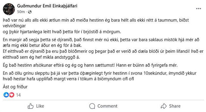 Í myndbandinu, sem sjá má hér að neðan, sést Guðmundur sitja ber að ofan á baki hestsins með skjöld í hönd, og slíðrað sverð við síðuna. Við myndbandið skrifar hann „Við ríðum út. Tónlistarmyndband á spotify & insta & yt.“ @gummiemil Við ríðum út🪓🏆⚔️ Tónlistarmyndband á spotify & insta & yt ♬ VÍKINGAR - GEMIL Guðmundur sést í myndbandinu rykkja fast í tauminn og fæla hestinn undan sér með ógætilegu reiðlagi með þeim afleiðingum að hann dettur af baki. „Það var nú alls alls ekki ætlun mín að meiða hestinn ég bara hélt alls ekki rétt á taumnum, biðst velvirðingar og þykir hjartanlega leitt hvað þetta fór í brjóstið á mörgum,“ skrifar Guðmundur, iðulega kallaður Gummi Emil, í færslu á samfélagsmiðlum. Blóðmerahald hið raunverulega dýraníð Nokkur fjöldi TikTok-notenda hefur í athugasemdum við myndbandið sagt að um dýraníð sé að ræða. Því er Guðmundur ekki sammála. Nær væri að tala um saklaus mistök, sem hafi falist í því að æfa sig ekki nóg áður en farið var á bak. Skjáskot af færslunni sem Guðmundur Emil birti. „Ef eitthvað er dýraníð þa eru það blóðmerar og þegar það er verið að dæla blóði úr þeim lifandi! Það er eitthvað sem ég hef mikla andstyggð á. Ég bað hestinn afsökunar eftirá og ég og hann sættumst! Hann er búinn að fyrirgefa mér.“ Að öllu gríni sleppti segir Guðmundur að atvikið hafi verið óþægilegt fyrir hestinn í um tíu sekúndur. „Ímyndið ykkur hvað hestar hafa upplifað margt verra í tökum á bíómyndum ofl. Ást og friður.“